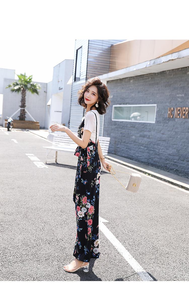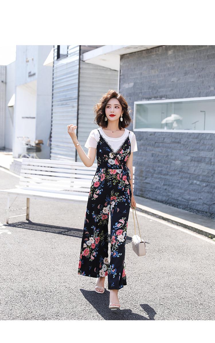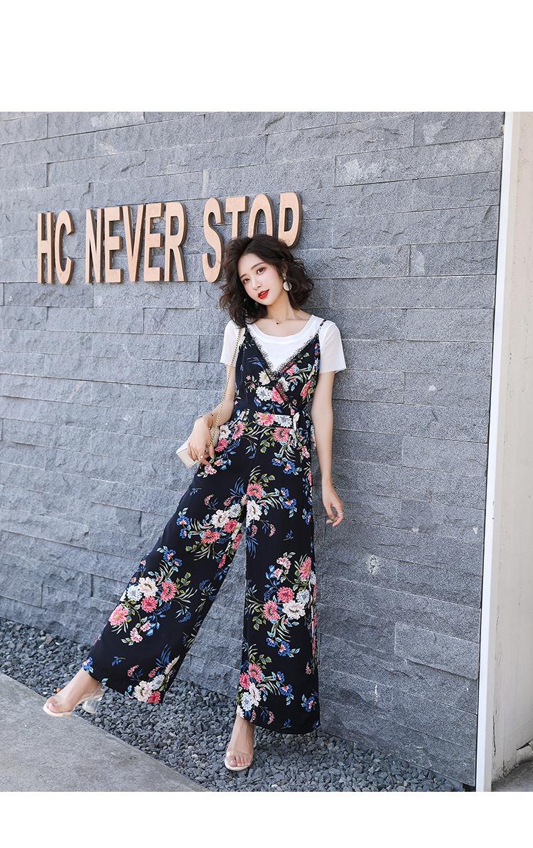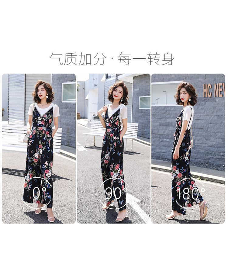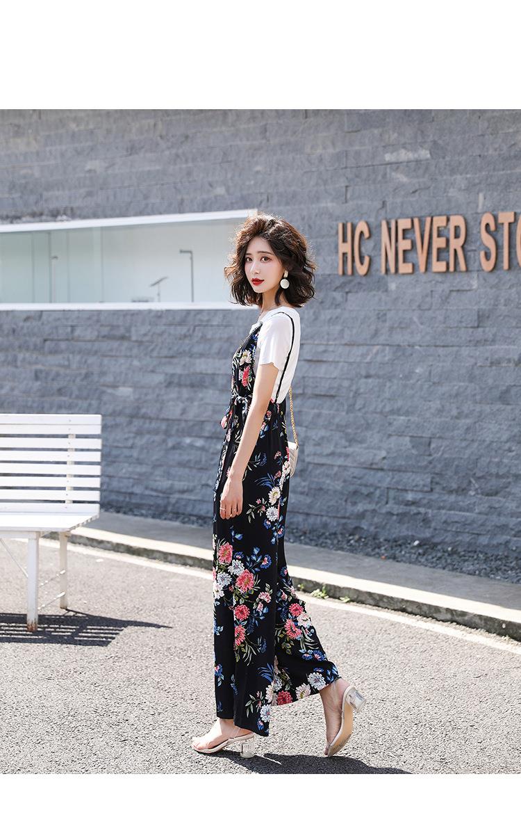 两件套背带阔腿裤欧洲站女装2023夏季T恤碎花连体裤连身裤套装女