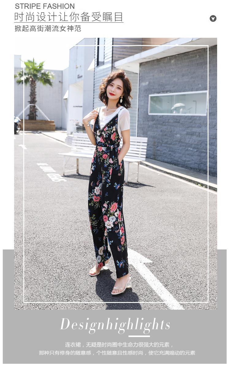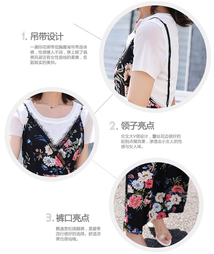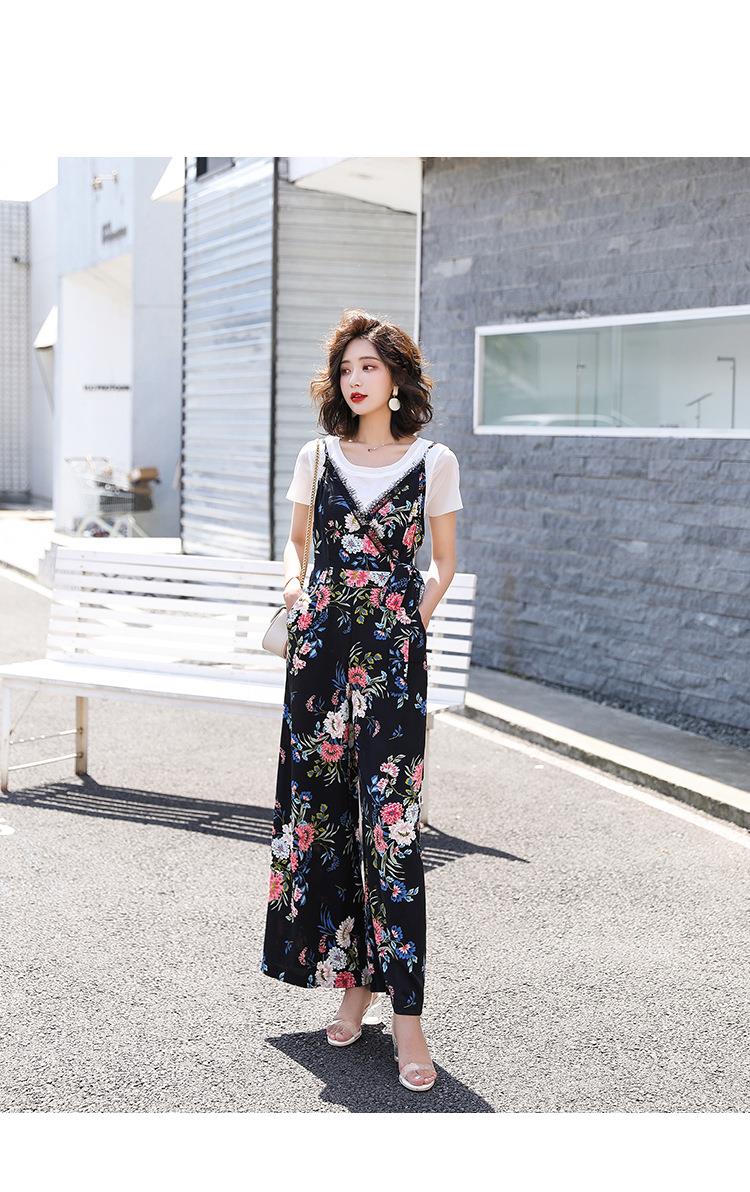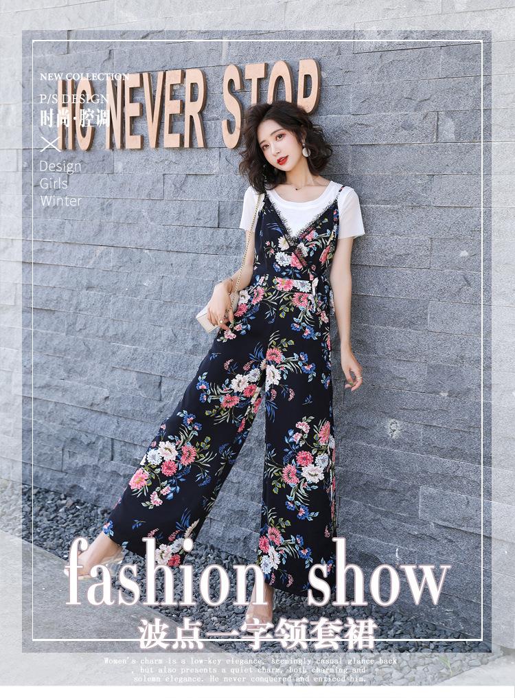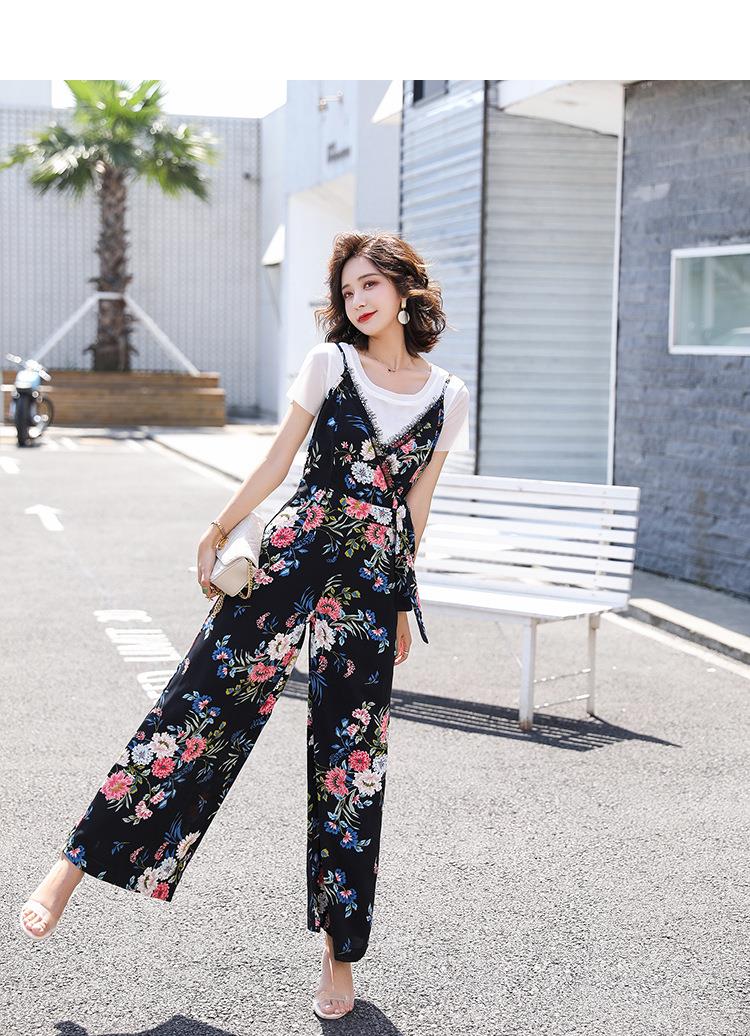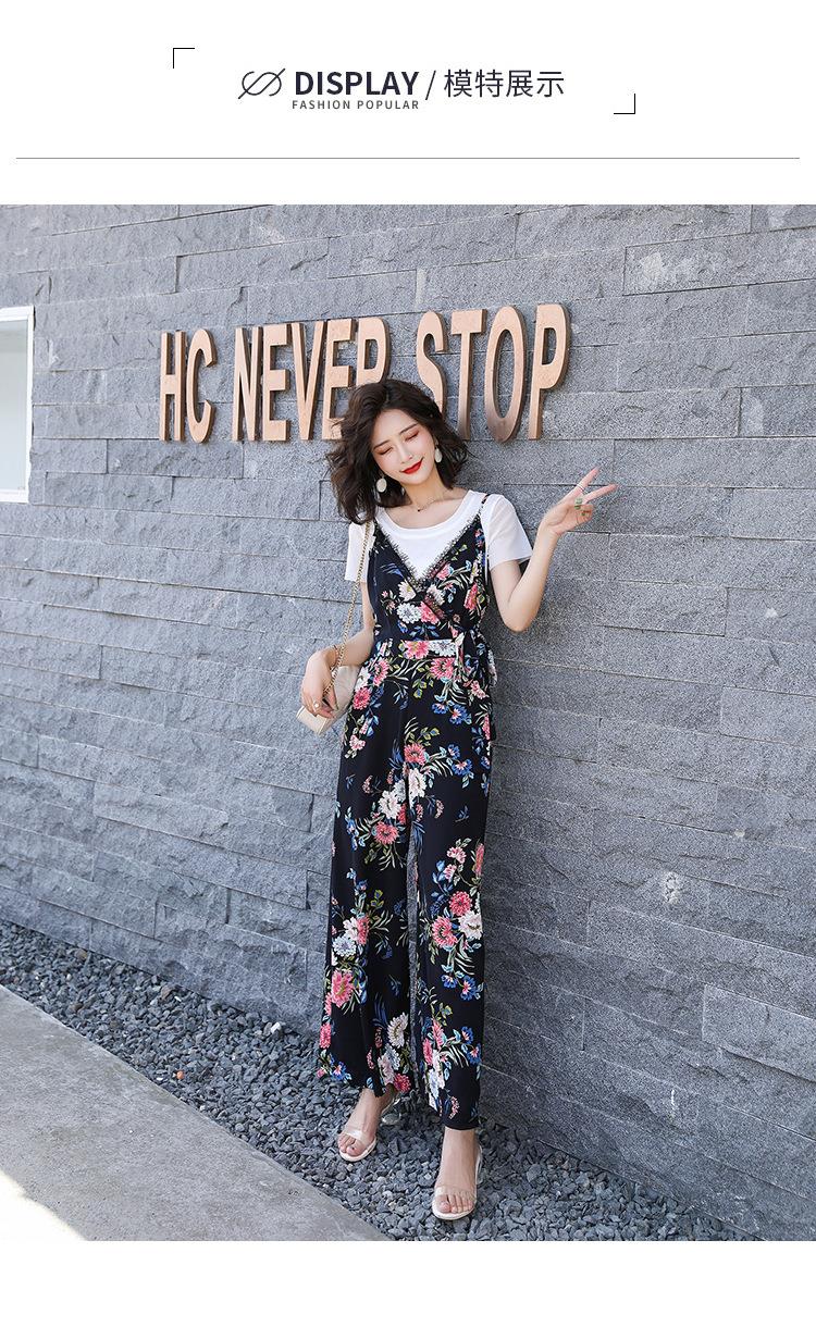 两件套背带阔腿裤欧洲站女装2023夏季T恤碎花连体裤连身裤套装女