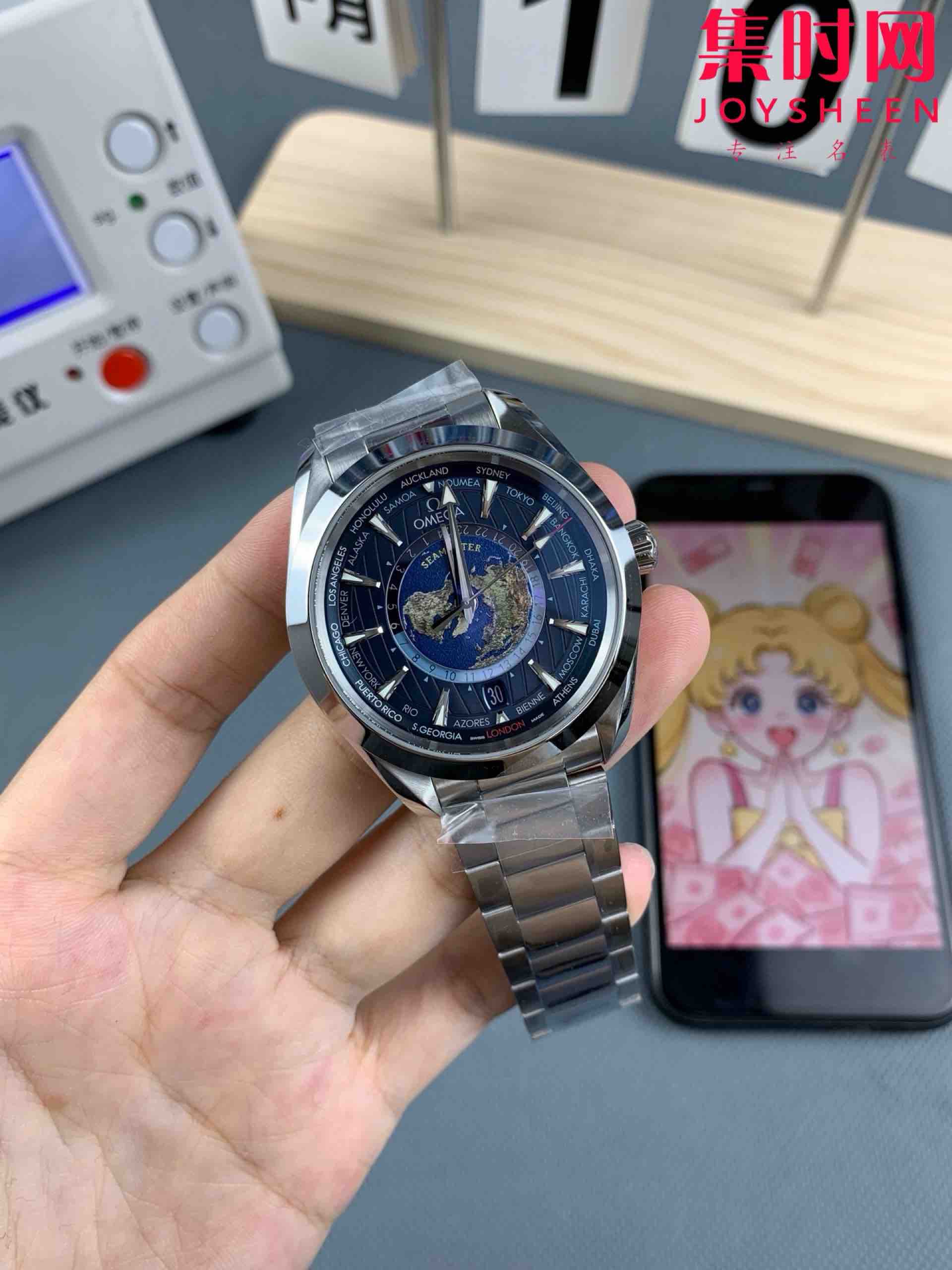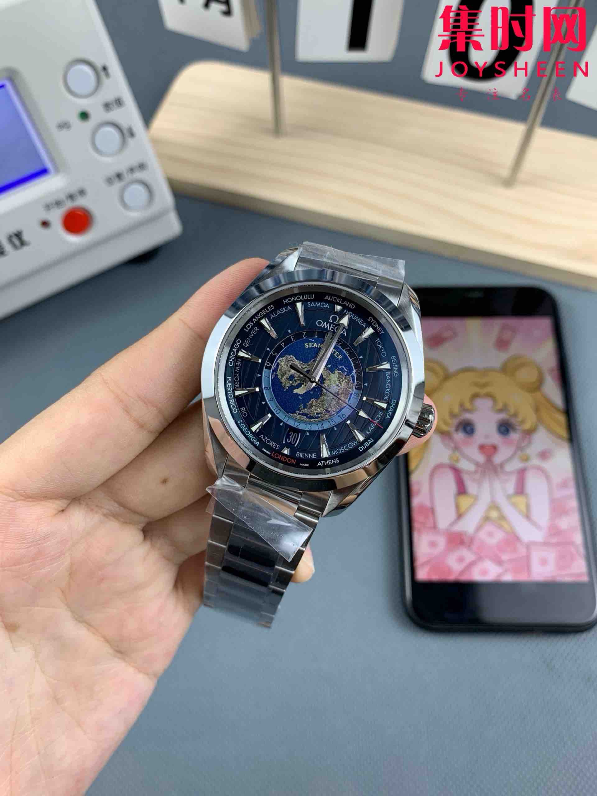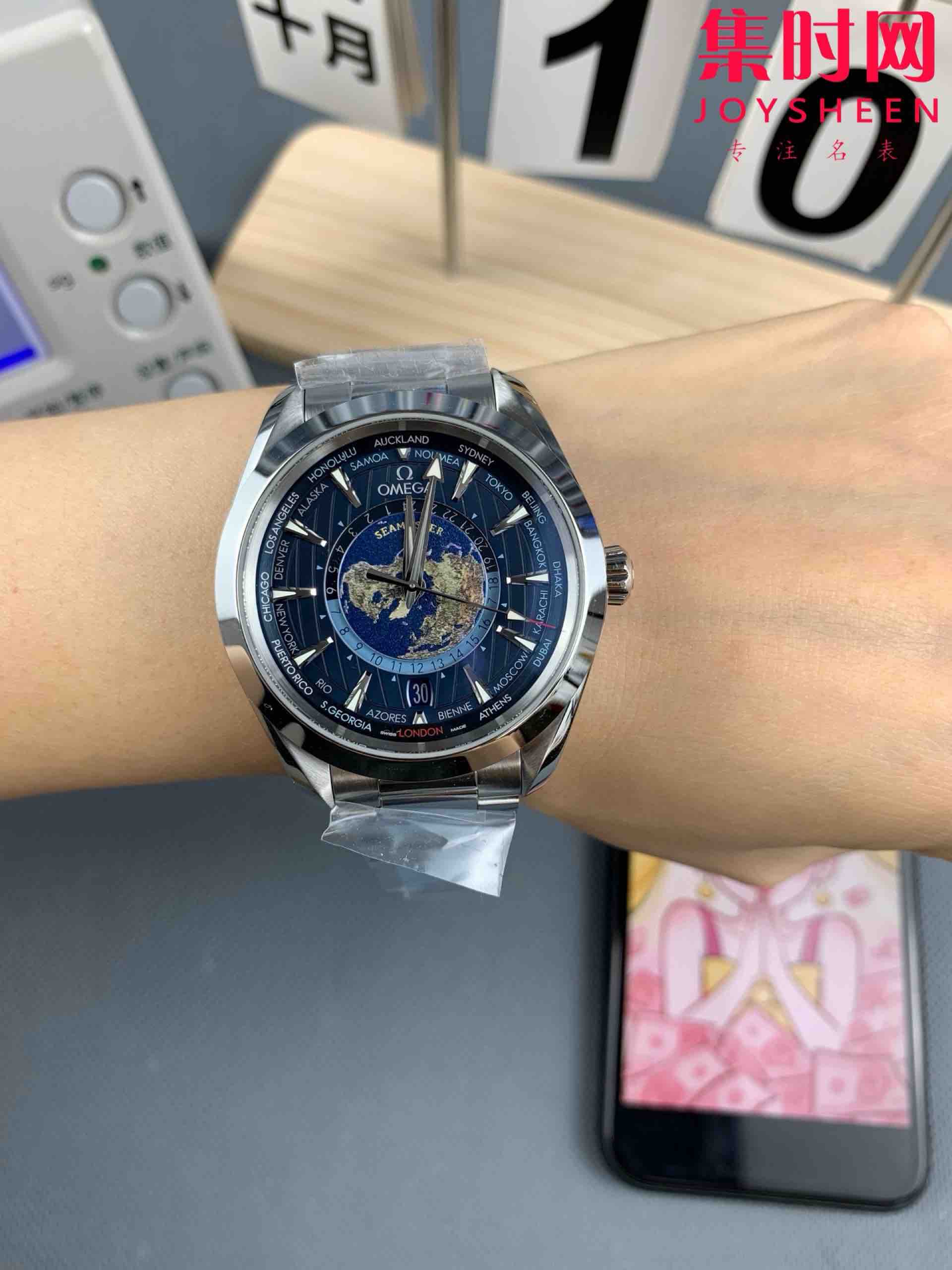 VS欧米茄海马世界时系列 VS海马世界时深海之蓝 蓝海马 海马世界时钢带款 男士腕表 表径43mm Aqua Terra 世界时腕表。一款可以戴着环游世界的世界时腕表,激光烧蚀蓝色海洋,陆地浮雕勾勒,24小时hesalite水晶环。辽阔世界尽在掌握,于方寸之间伴您开启环球之旅!搭载VS定制Cal.8938多功能全自动机械机芯,蓝宝石水晶镜面,316L精钢表壳,316L精钢表带,原装折叠扣,功能同步原装真实可用!表径43mm