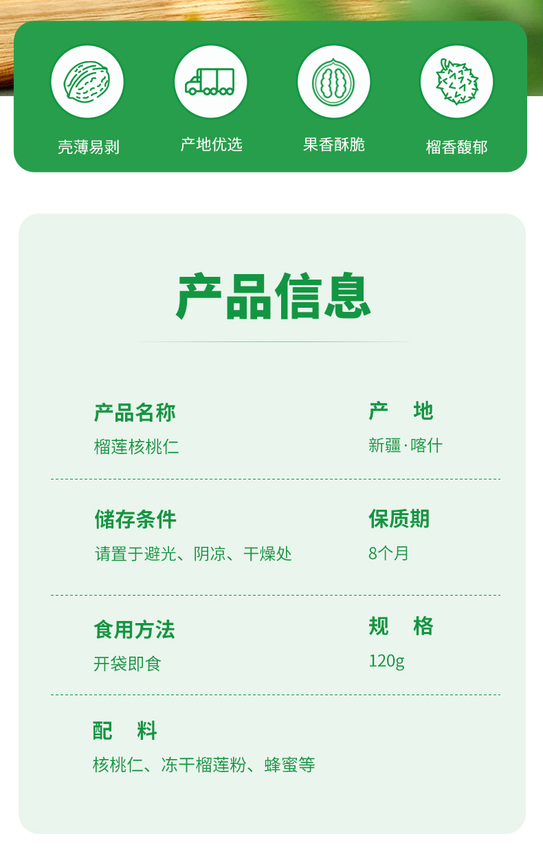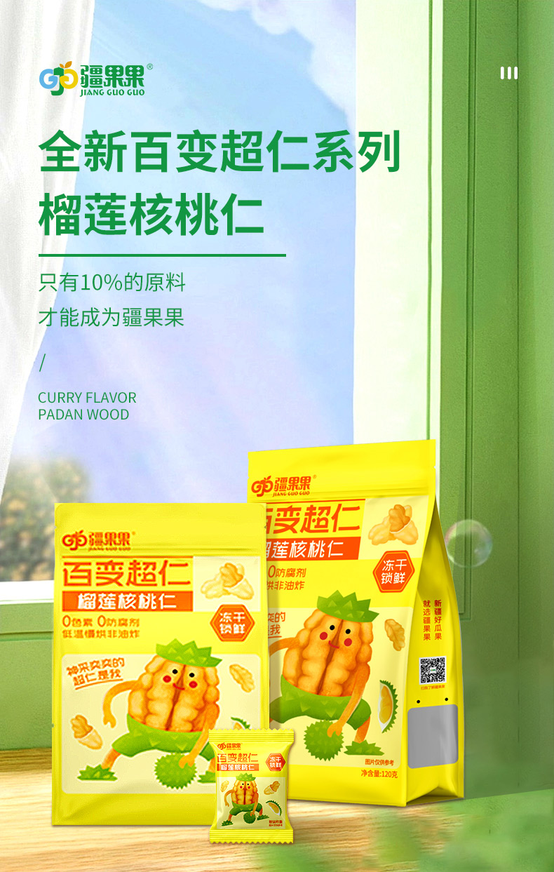 【严选】疆果果百变超仁榴莲味核桃仁120g/袋(10g*12小袋)(厂家直发))