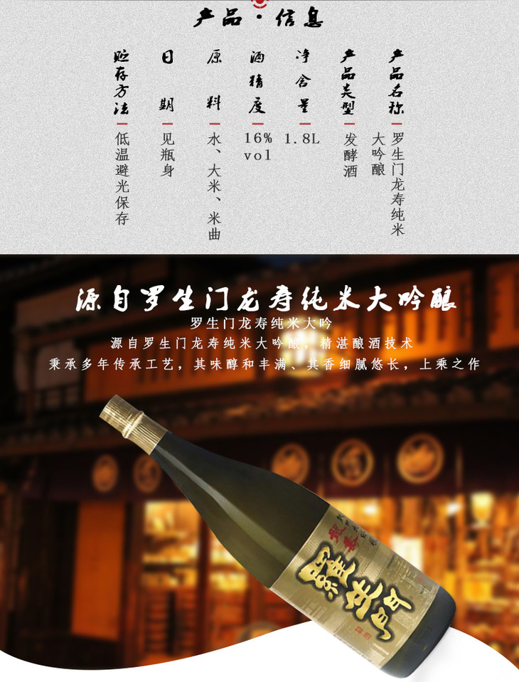 滴滴在心 和歌山 龙寿纯米大吟酿清酒 720ml/1800ml 进口日本清酒罗生门 RDCT