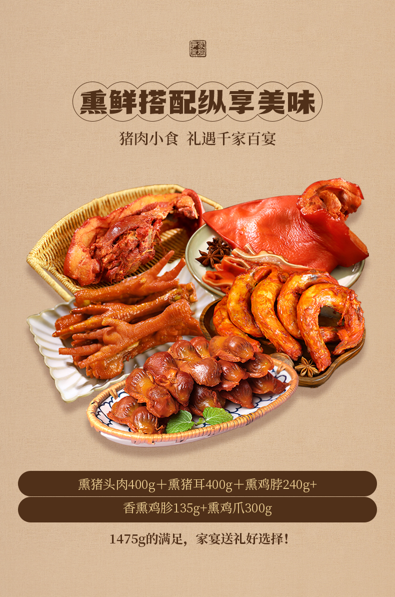 【三人食】熏猪头肉400g+熏猪肘500g+熏鸡脖240g+熏鸡胗200g+鸡爪300g