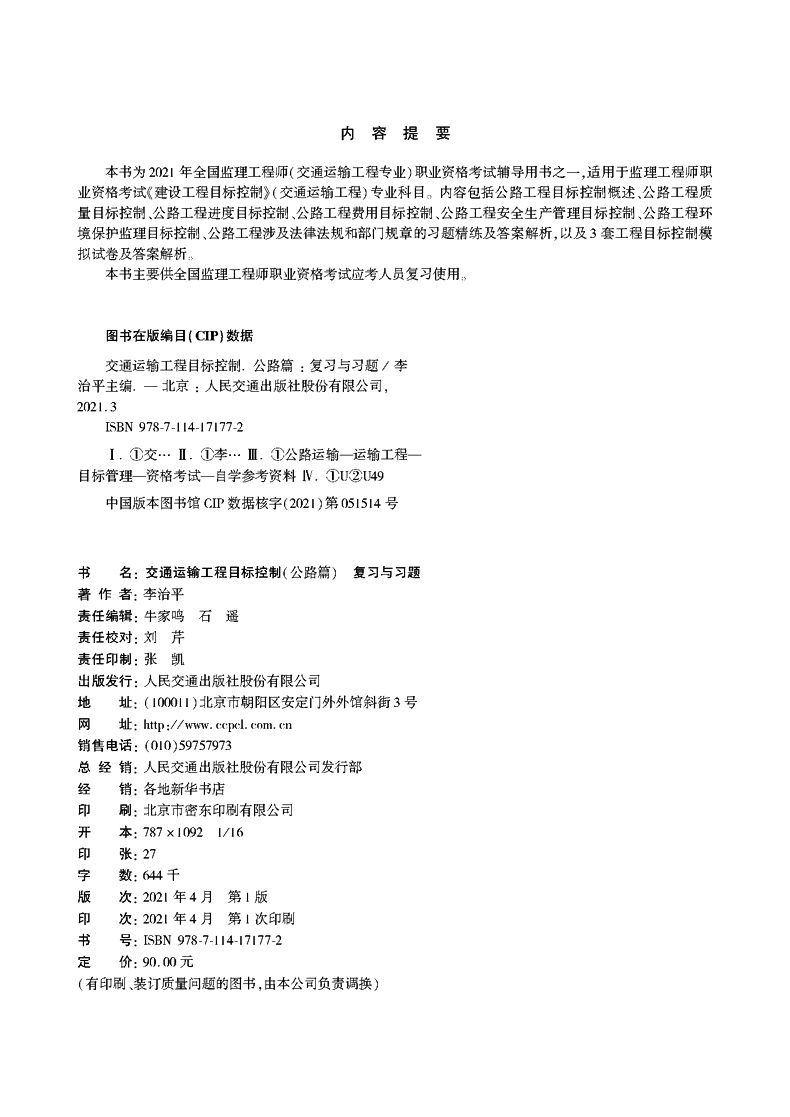 书名:2021年监理工程师考试辅导用书 交通运输工程目标控制(公路篇) 复习与习题