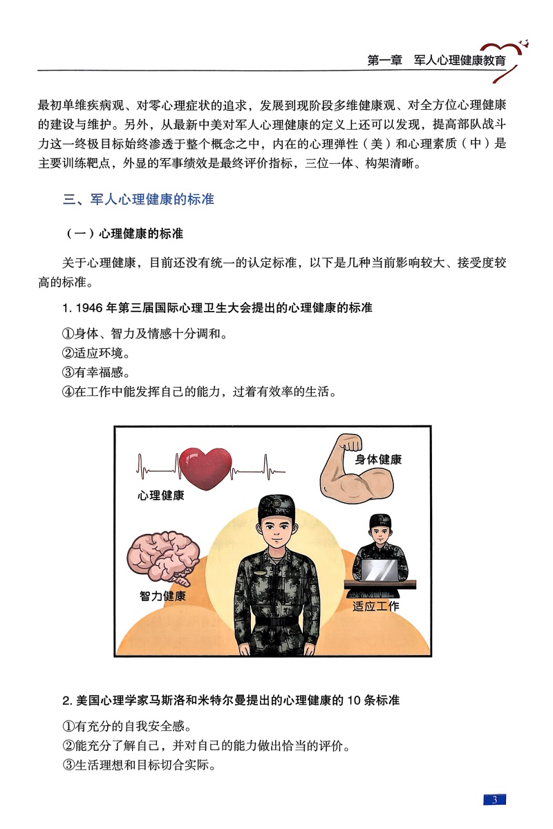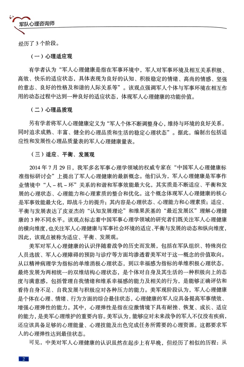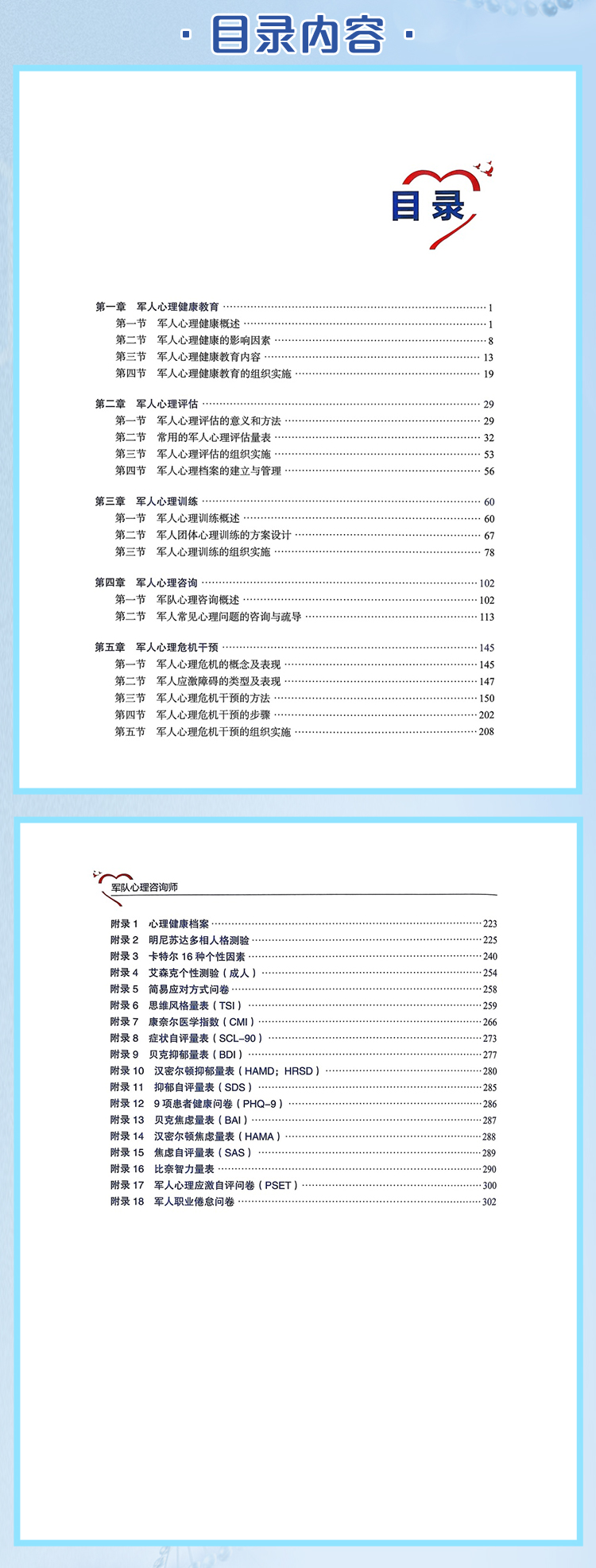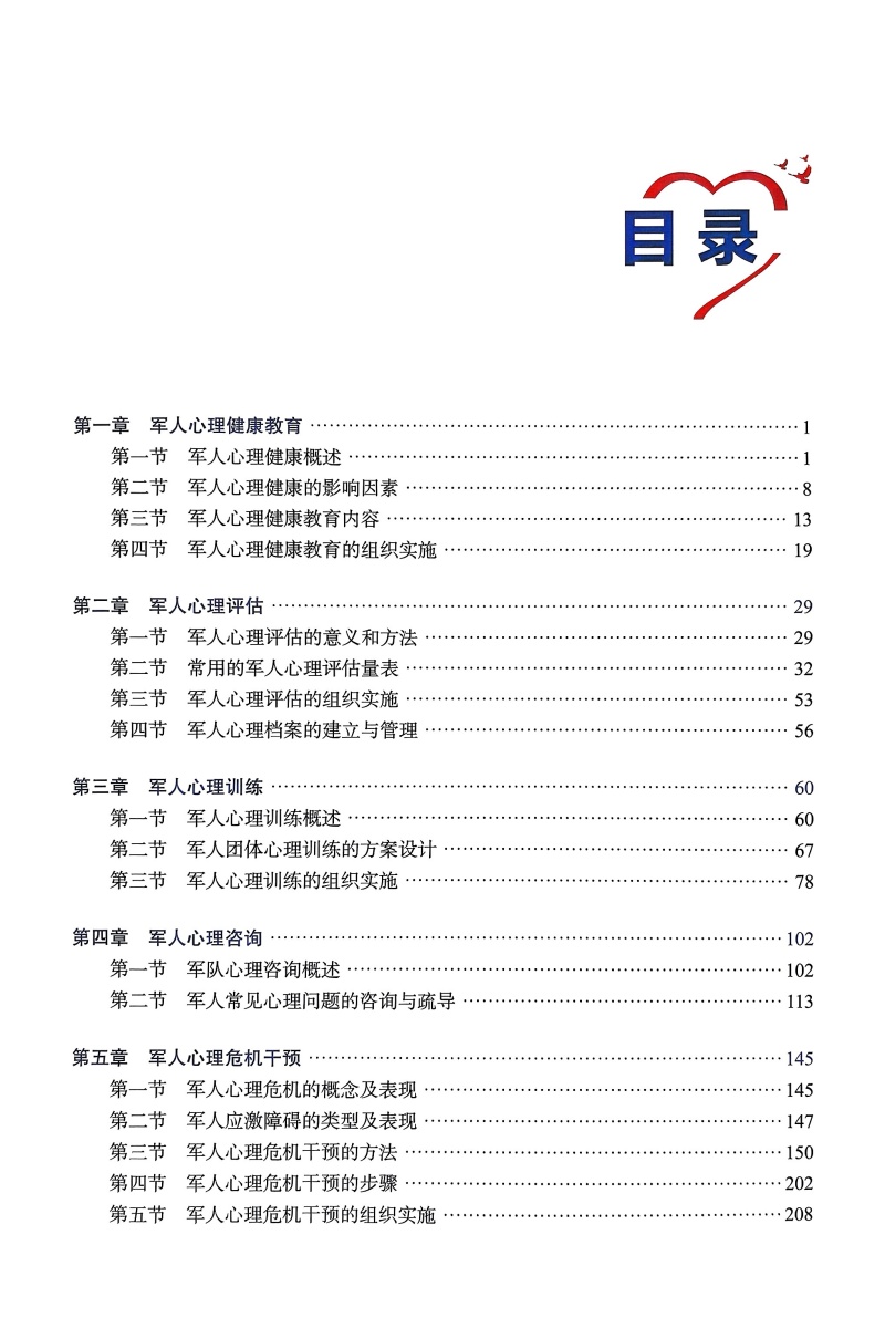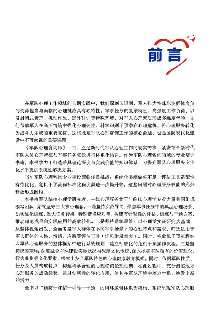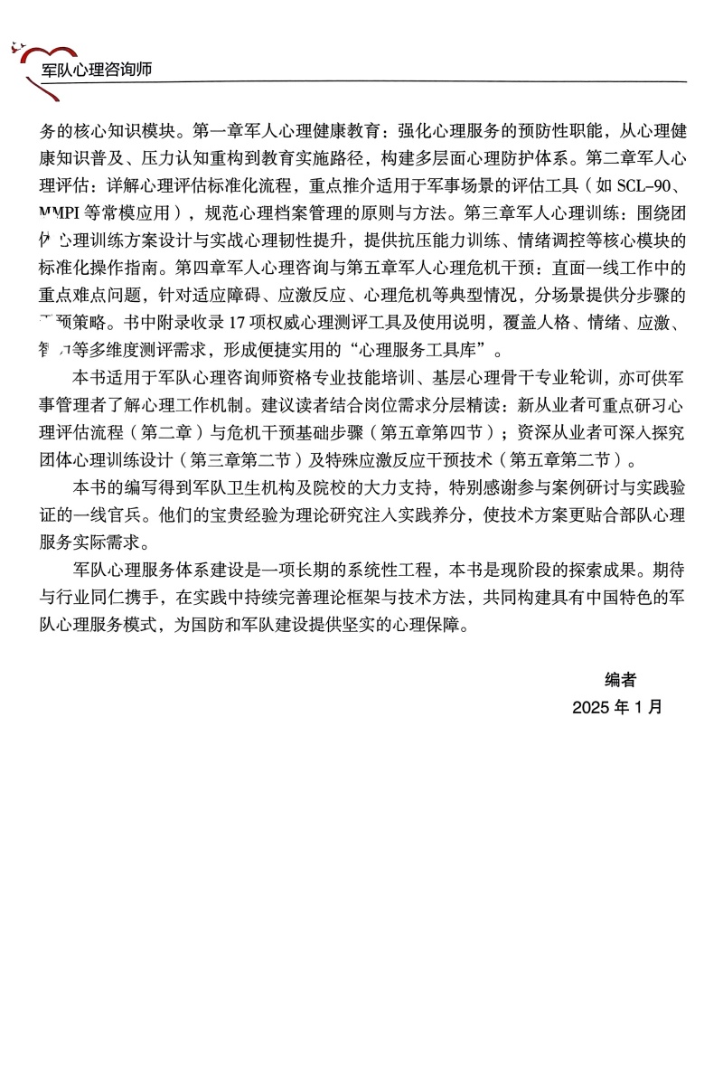 本书围绕军人心理健康,搭建全面知识体系,涵盖维护、评估、训练、咨询和危机干预等核心内容。全书共五章,第一章剖析军人心理健康基础,结合职业、教育、战时压力等影响,提出教育内容与策略。第二章详述心理评估工具及档案管理,突出信息化作用。第三章构建实战心理训练体系,融合多种技术提升官兵心理素质。第四章探讨咨询伦理与策略,为常见心理问题提供解决路径,强调咨询师主动介入。第五章聚焦危机干预,介绍分级响应机制和先进干预技术,重视督导机制。