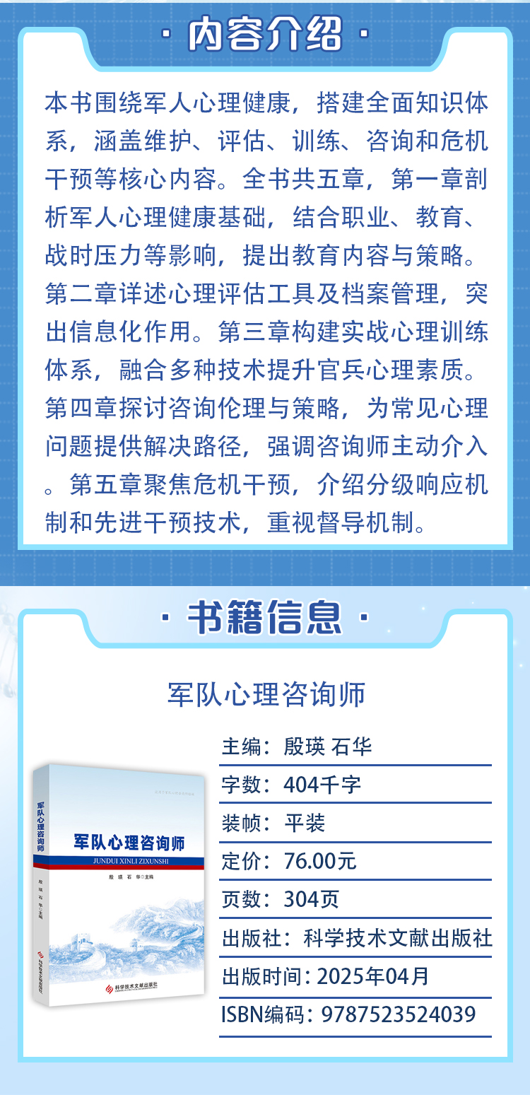 军队心理咨询师 殷瑛 石华 主编 军人心理健康教育 军人心理评估 适用于军队心里咨询师培训 9787523524039科学技术文献出版社