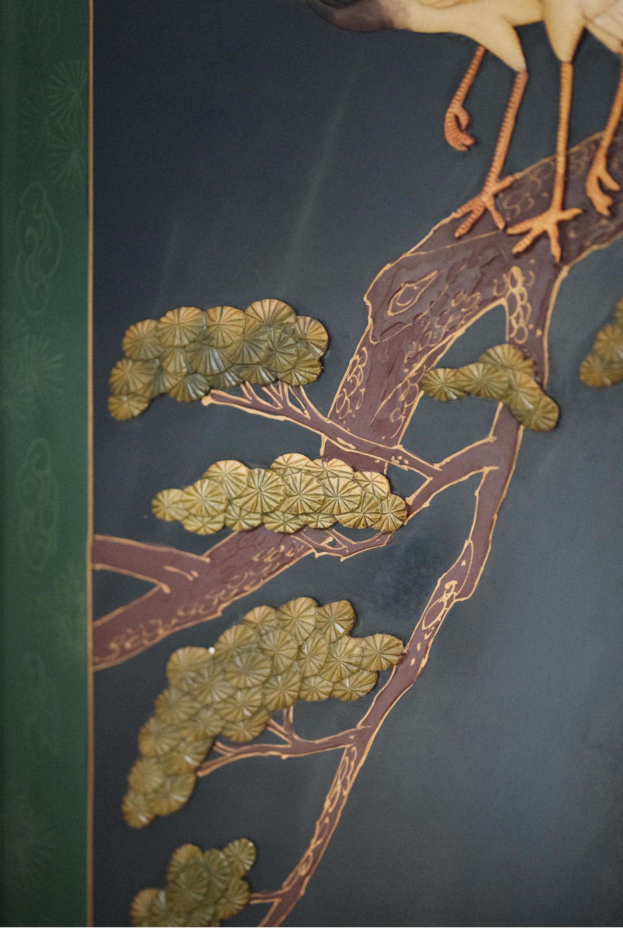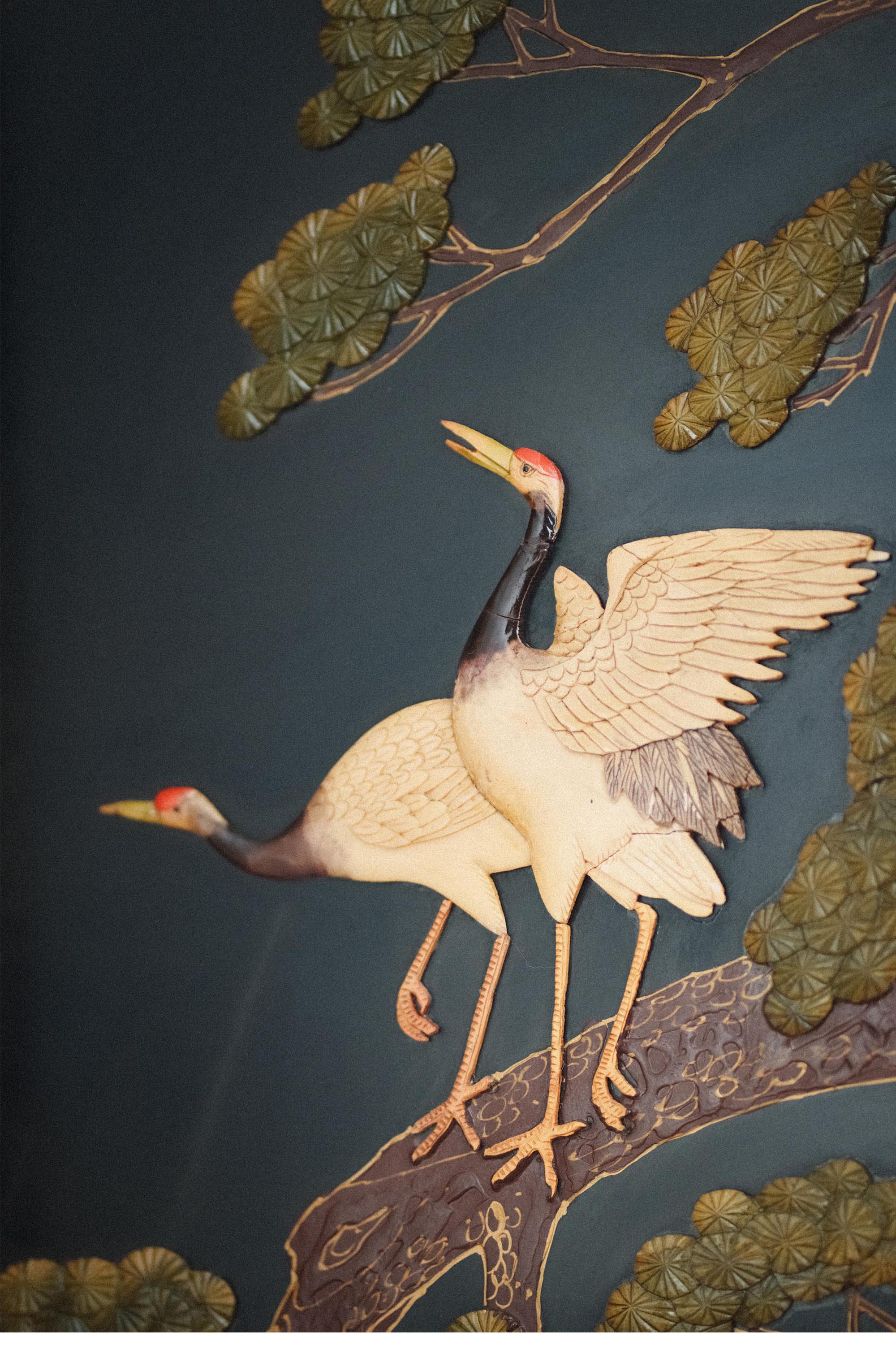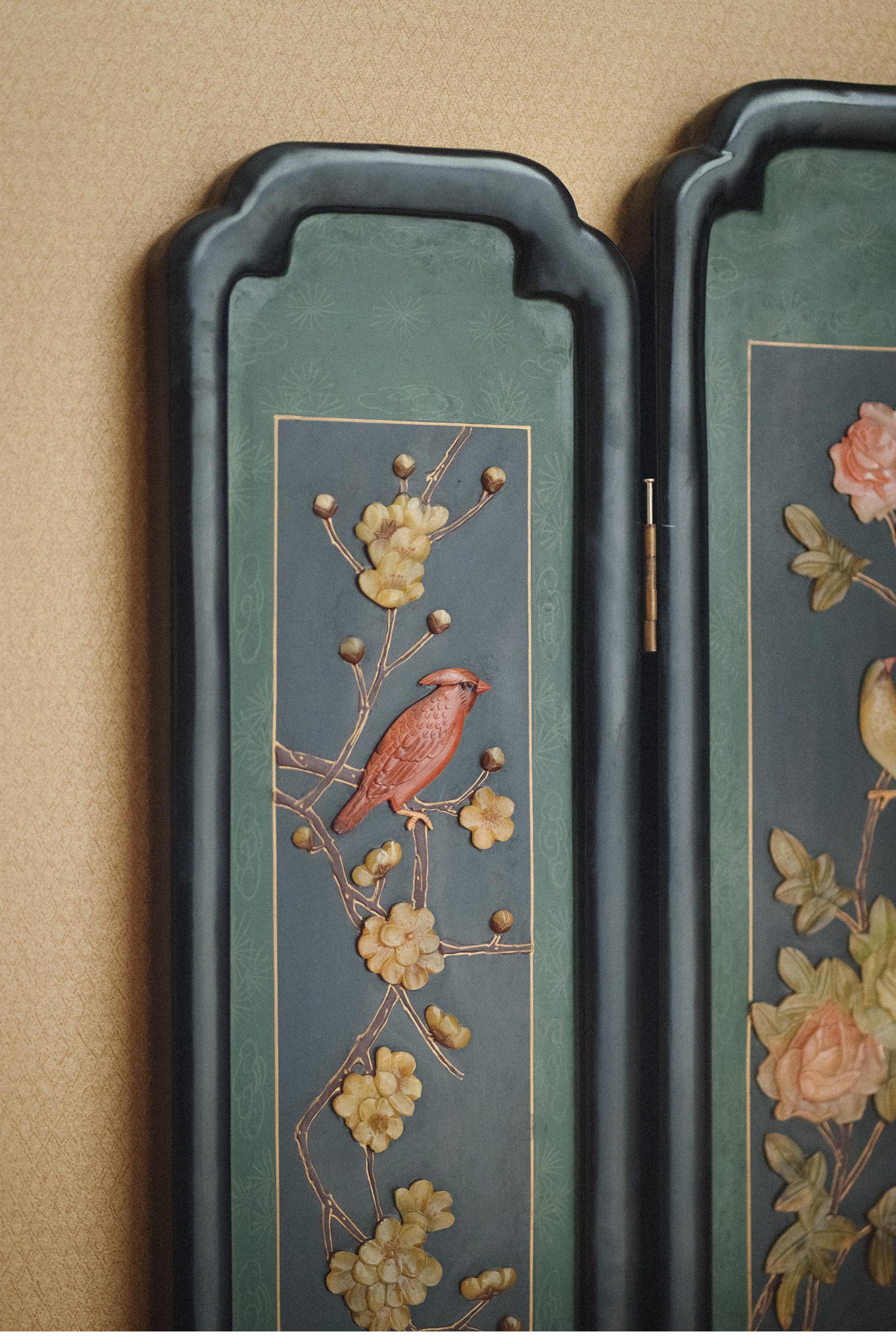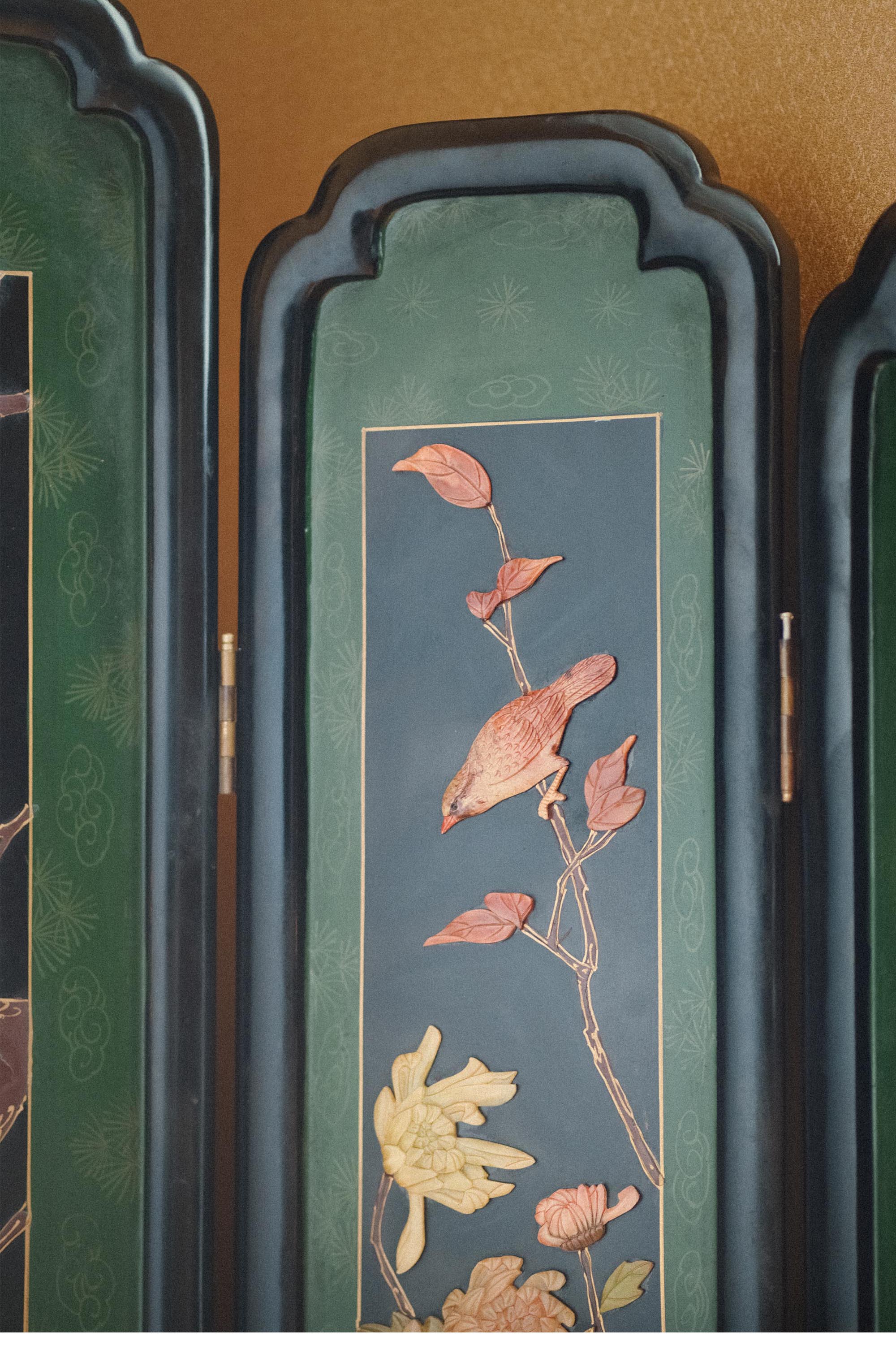 20世纪中国创汇时期出品「松鹤延年」主题硬石镶嵌五曲屏风