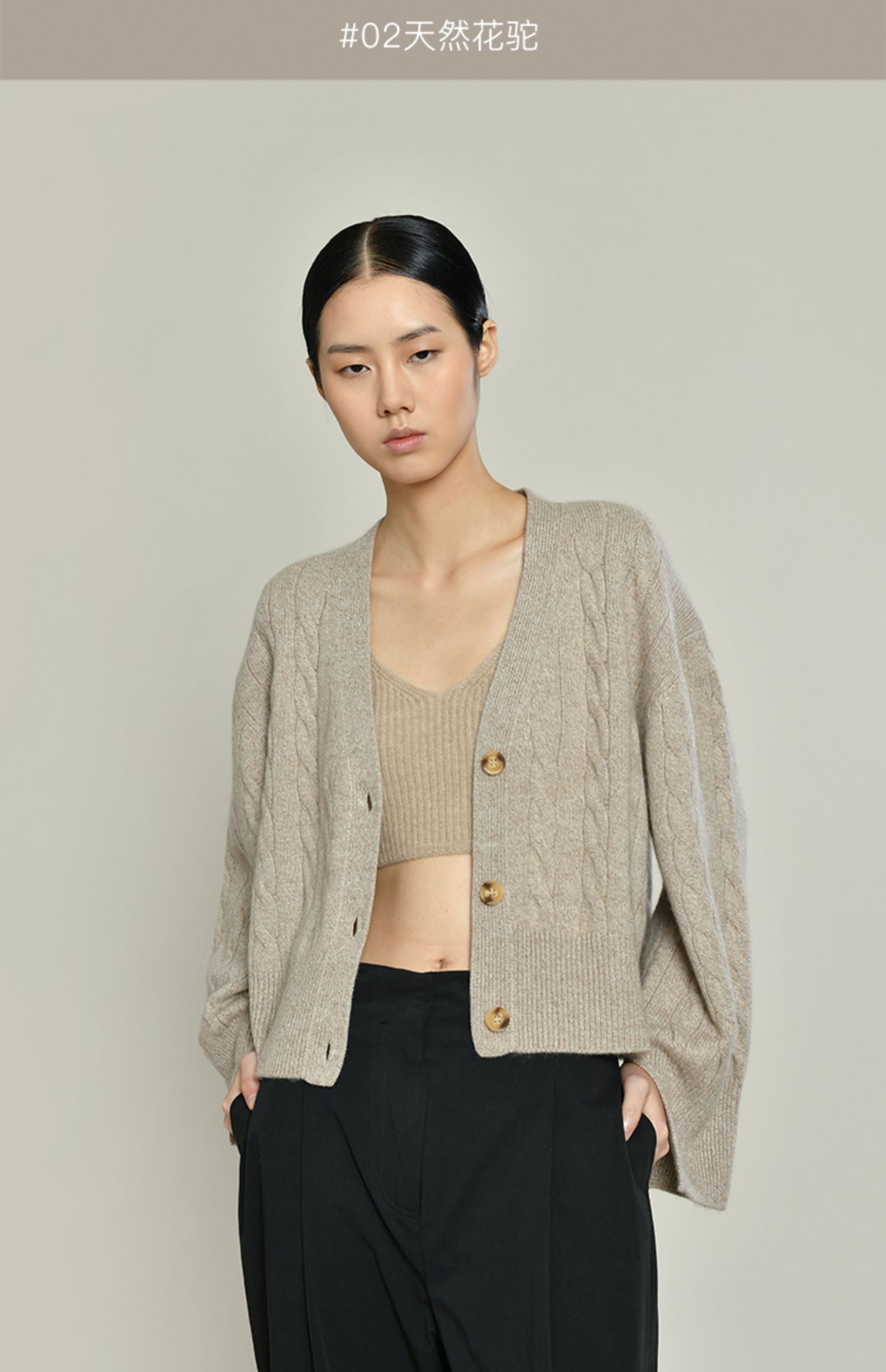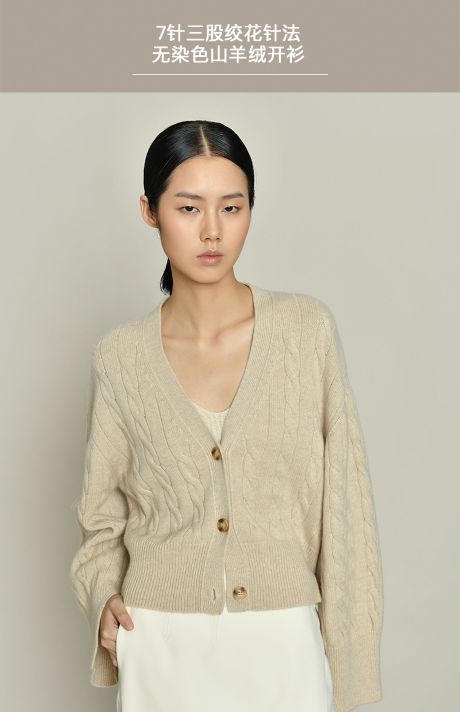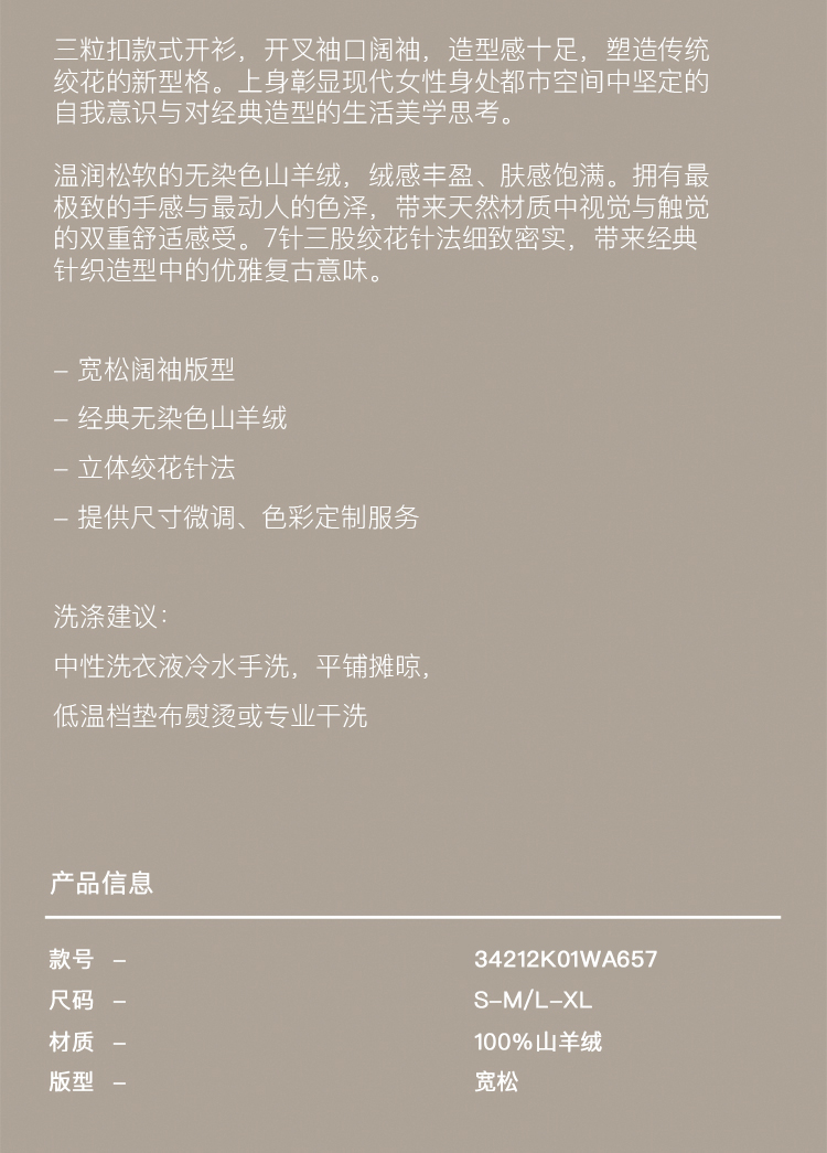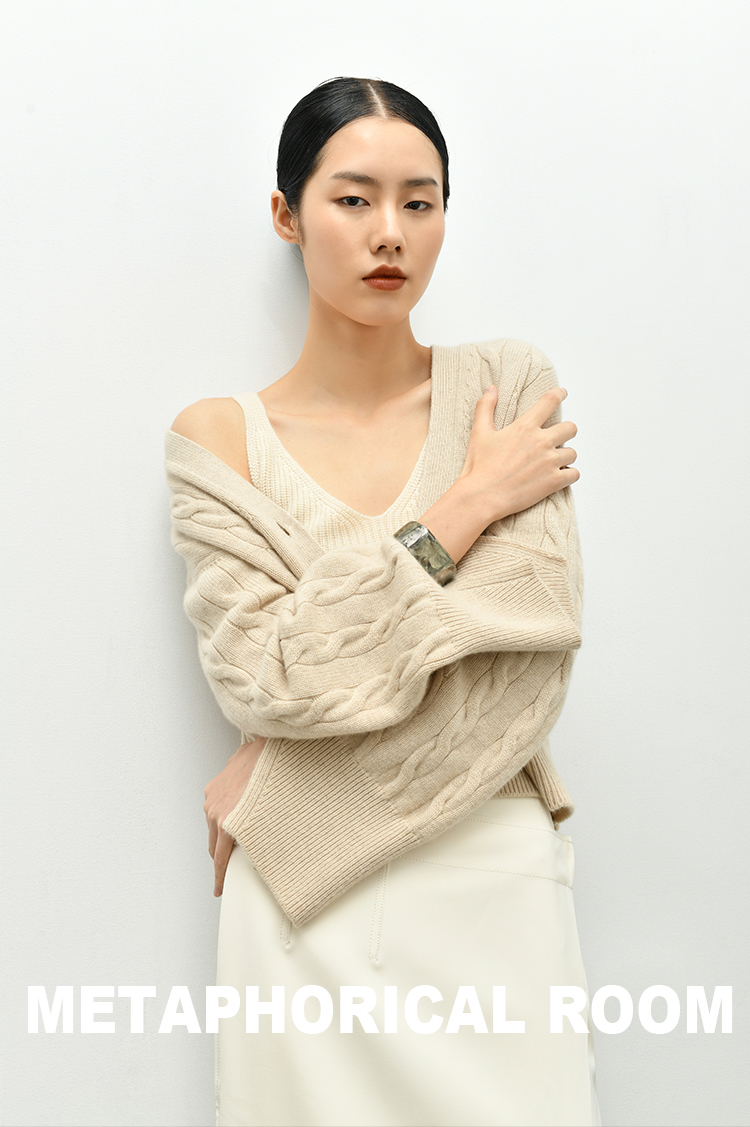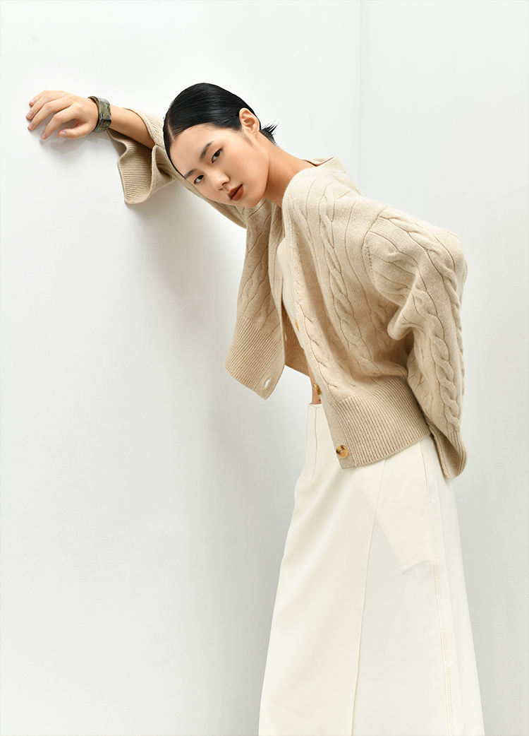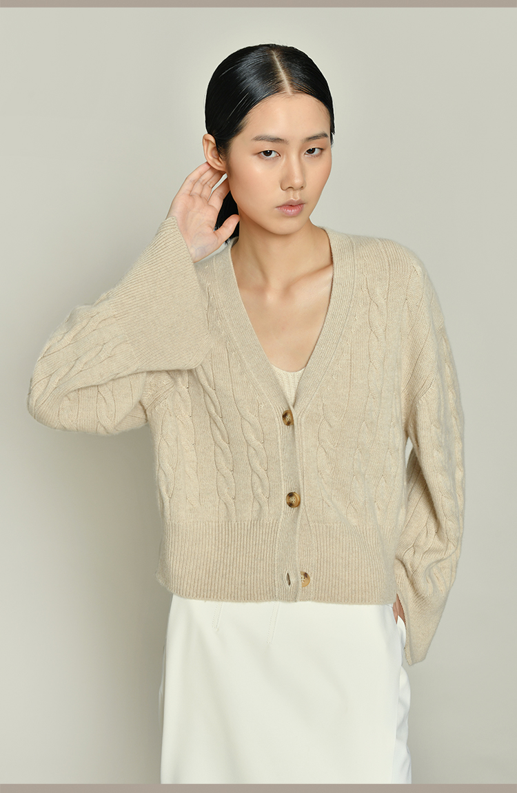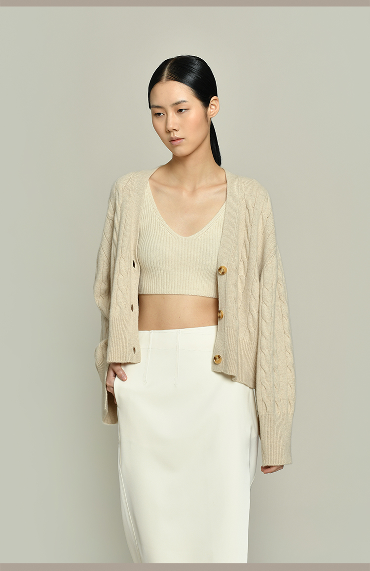 女士2021新款无染色羊绒长袖廓形V领绞花开衫