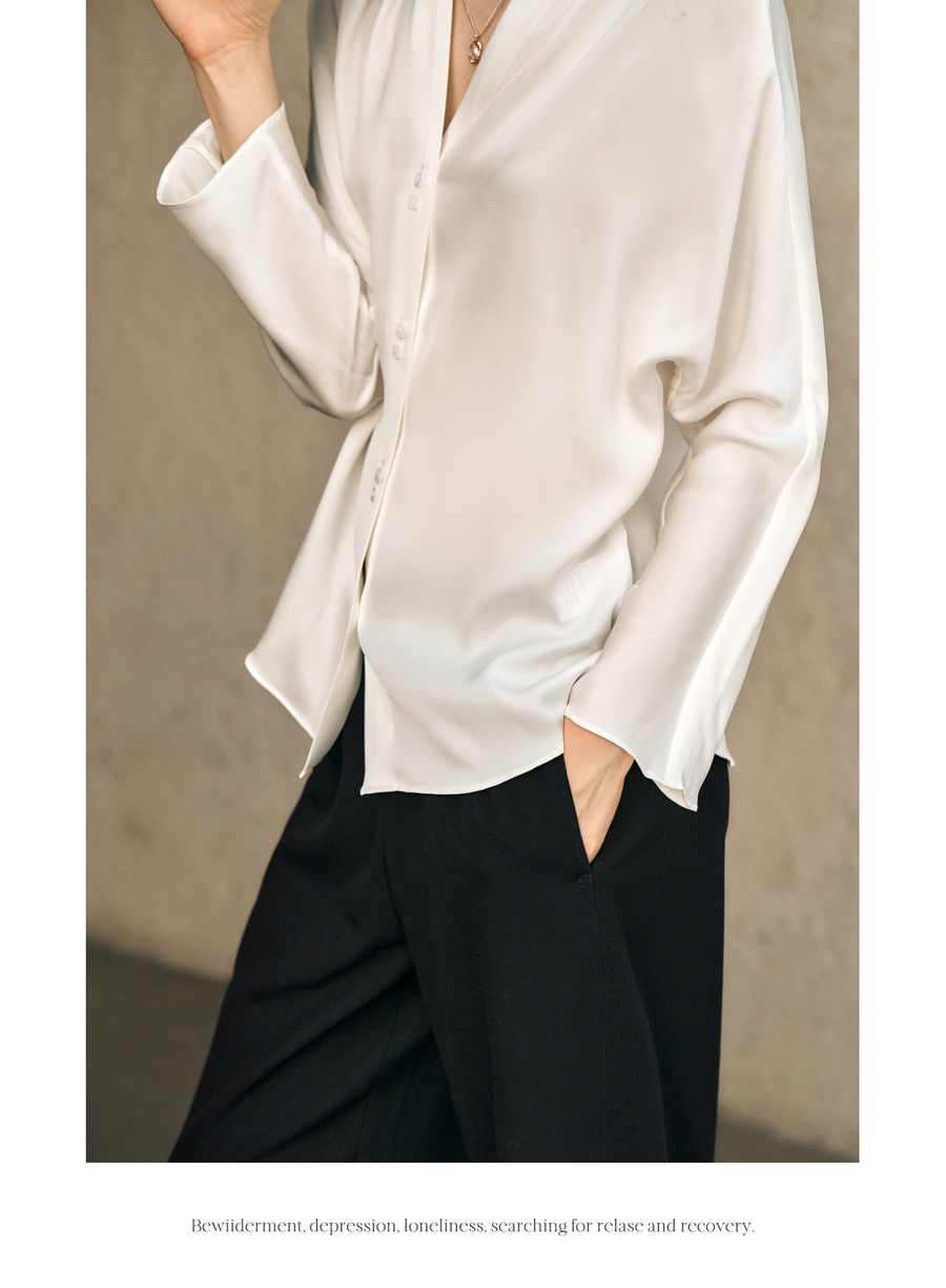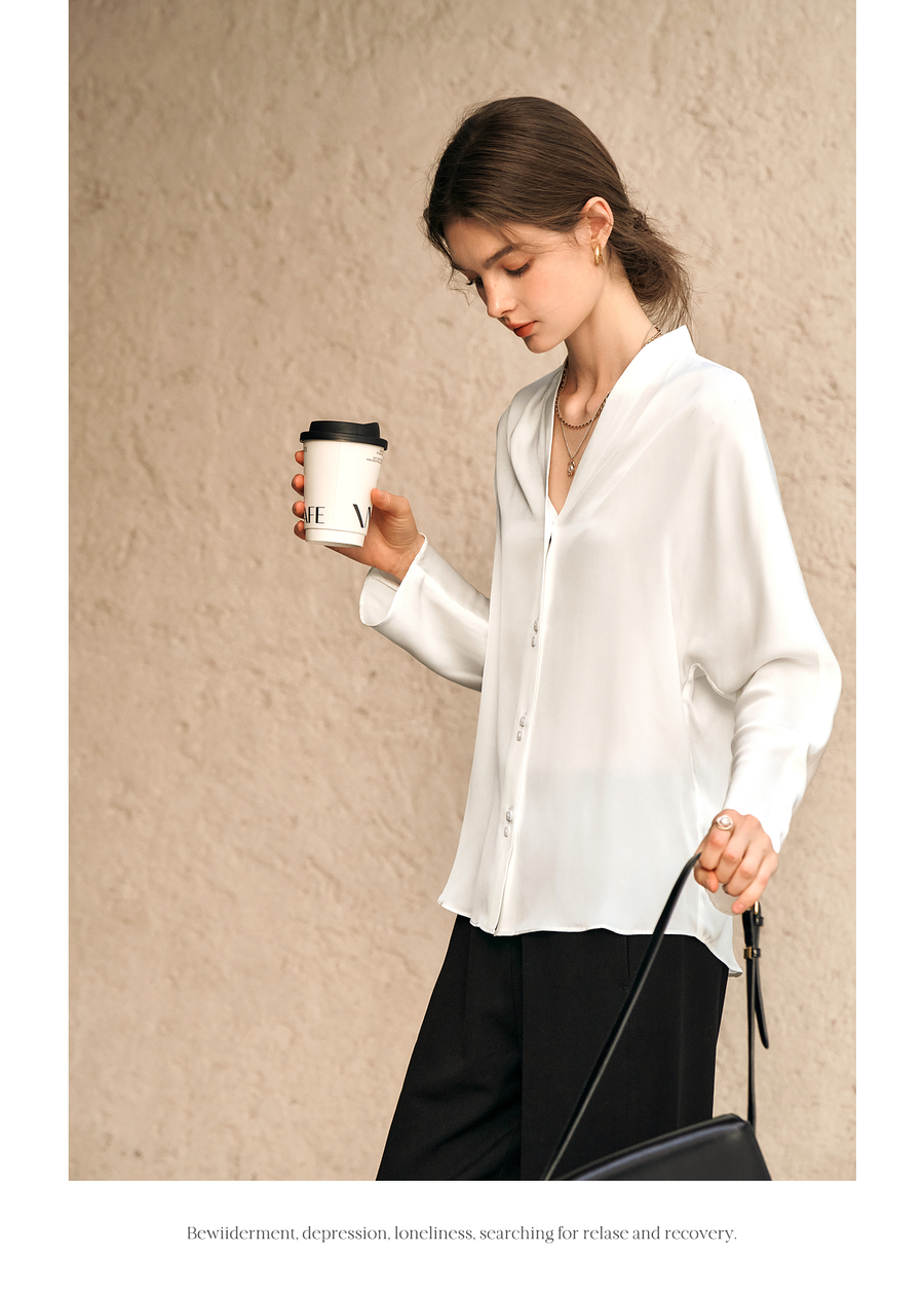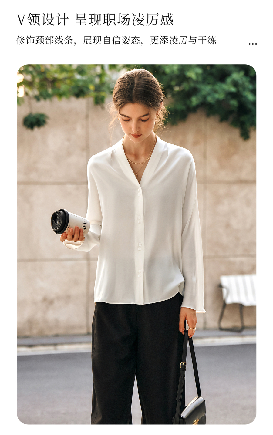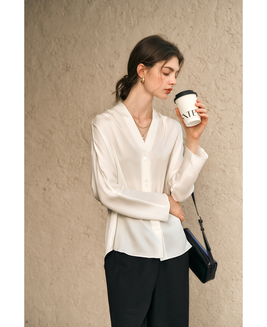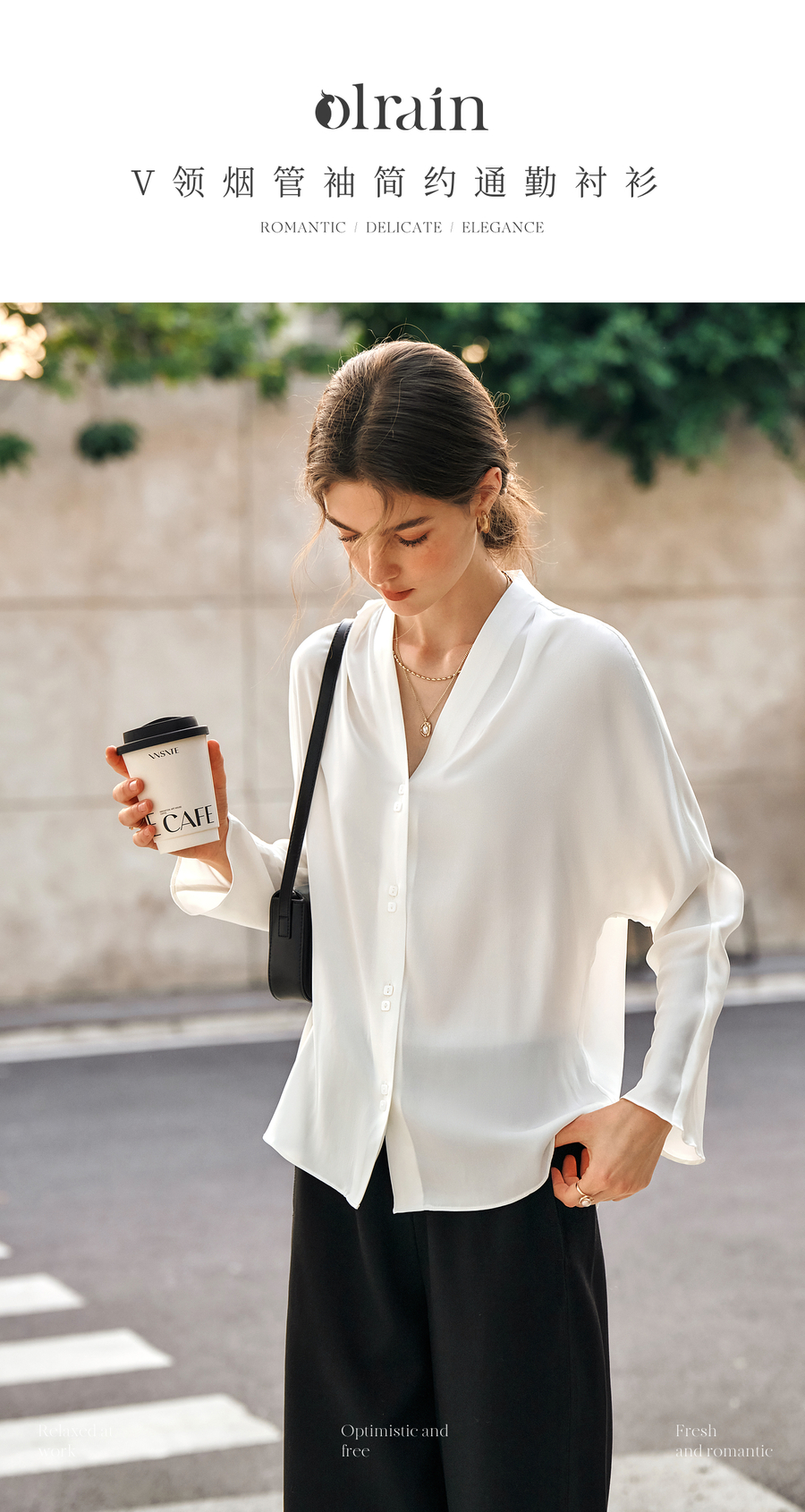OLrain欧芮儿米白色V领衬衫女春季2025年新款简约通勤长袖衬衣