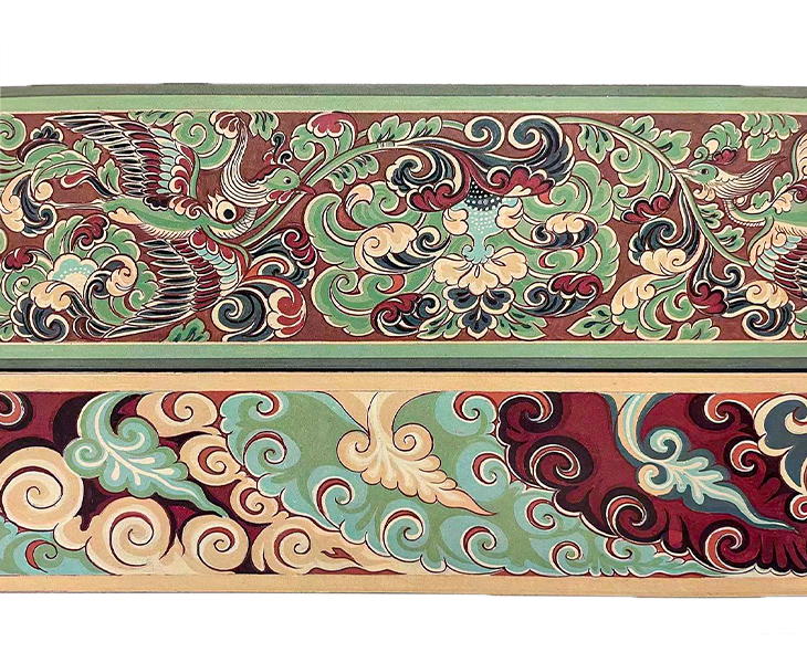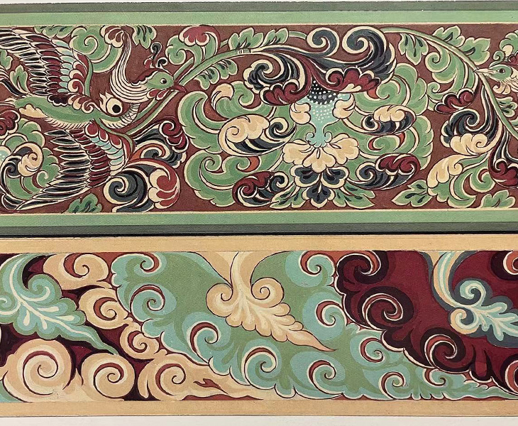 [设计元素来自于敦煌壁画中的盛唐卷草和散花图案。 二方连续形式呈现的卷草纹,翻转卷曲的花叶中华美的凤鸟穿插飞翔。鲜明饱满的色彩,细腻富丽的退晕。散花图案的表现则更加自由和灵活,它不拘泥于一定的装饰面积和构图组织,所呈现出的造型自然活泼,既接近于自然界花草的形态,又经过匠心独运的简练、概括、夸张和平面化的处理,比自然形更具装饰趣味和艺术魅力。 整个画面盛唐卷草与大面积的散花图案对比呼应,共同组成了这幅充满鸟语花香的生动景象。