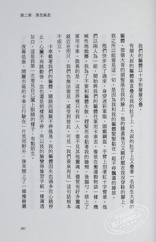 所以說,人類的本質其實是殘忍的,是嗎?我們只是經歷了普遍性的事情,是嗎?我們只是活在尊嚴的錯覺裡,隨時都有可能變成一文不值的東西,變成蟲子、野獸、膿瘡、屍水、肉塊,是嗎?屈辱、迫害、被殺,那些都是透過歷史早已證明的人類本質,對吧?