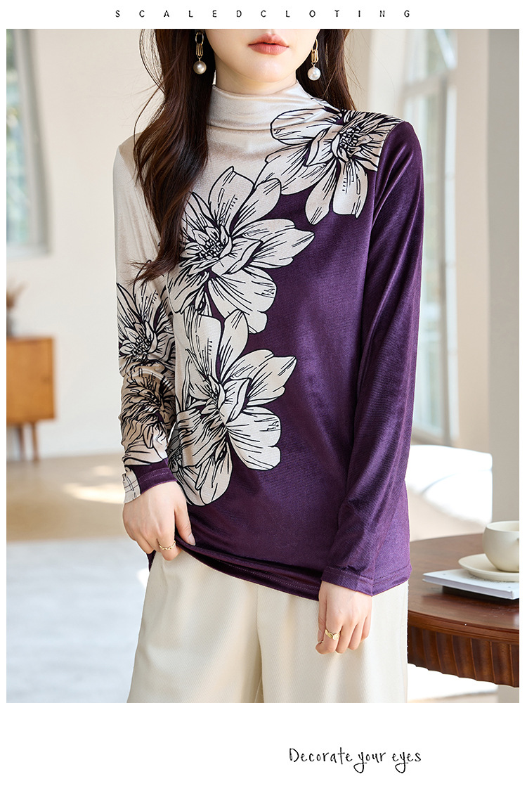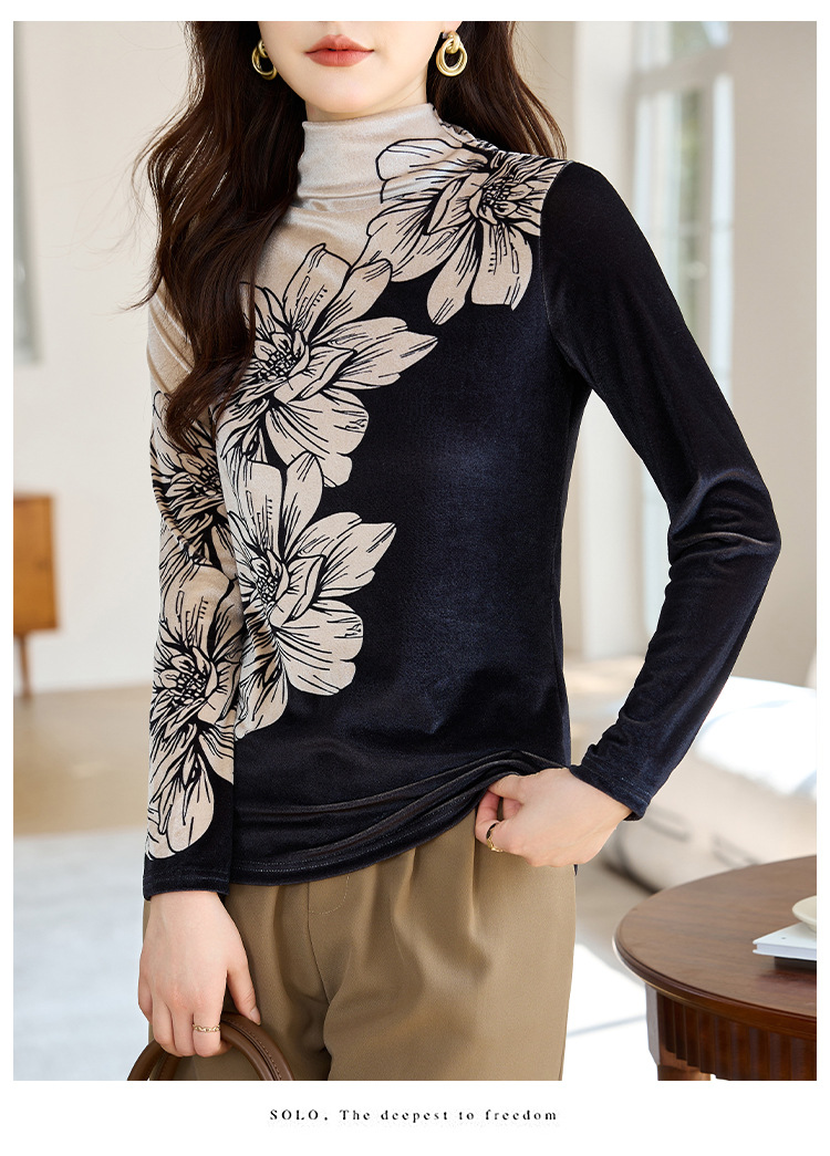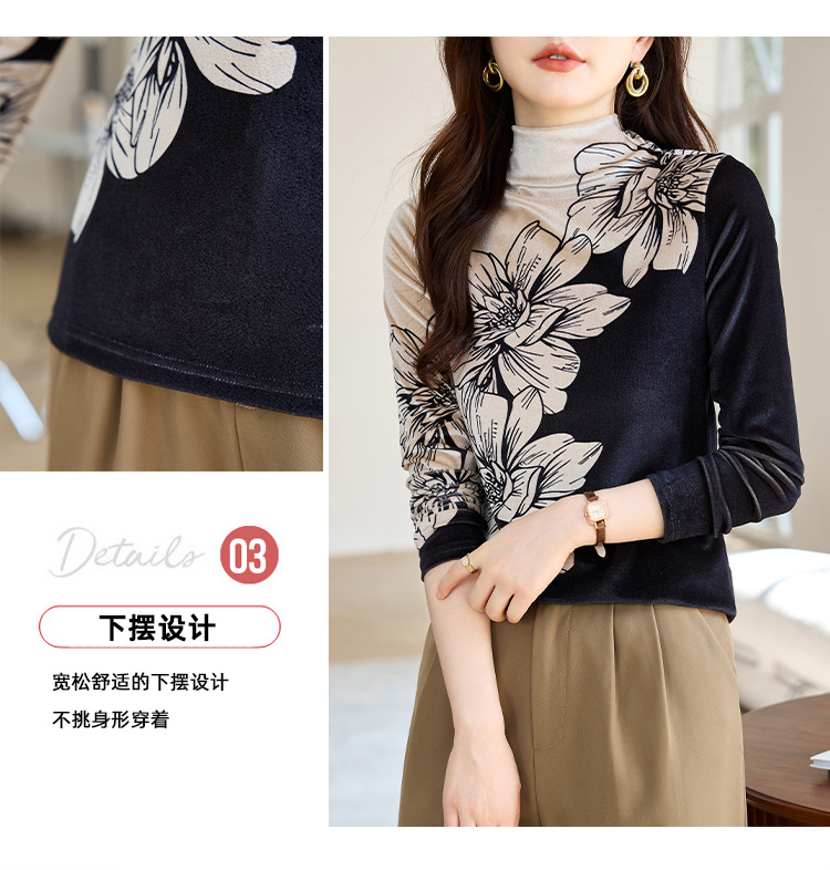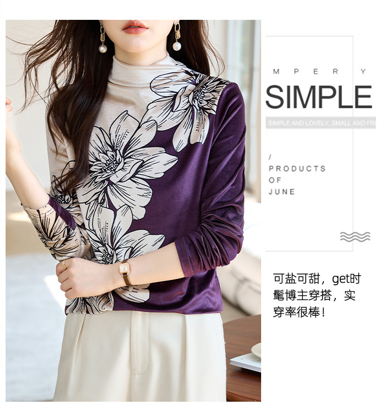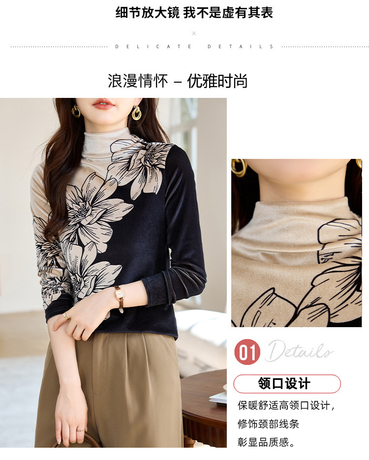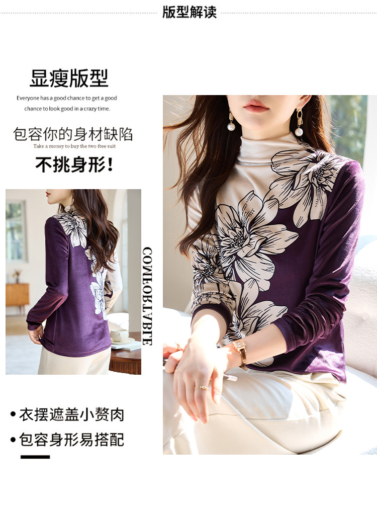 金丝绒内搭T恤,冬季新款印花加绒加厚洋气减龄显瘦打底衫KQL-A35N5387