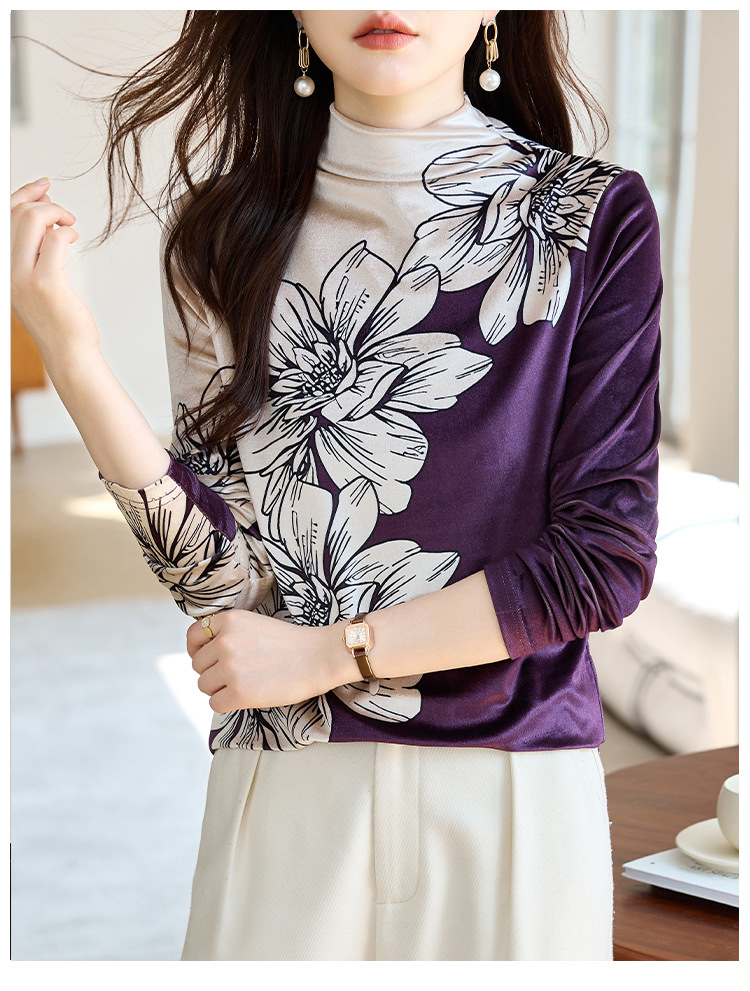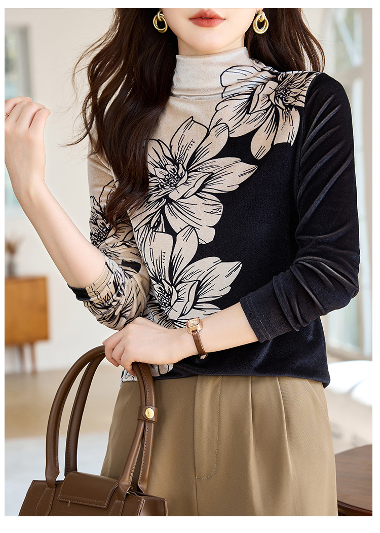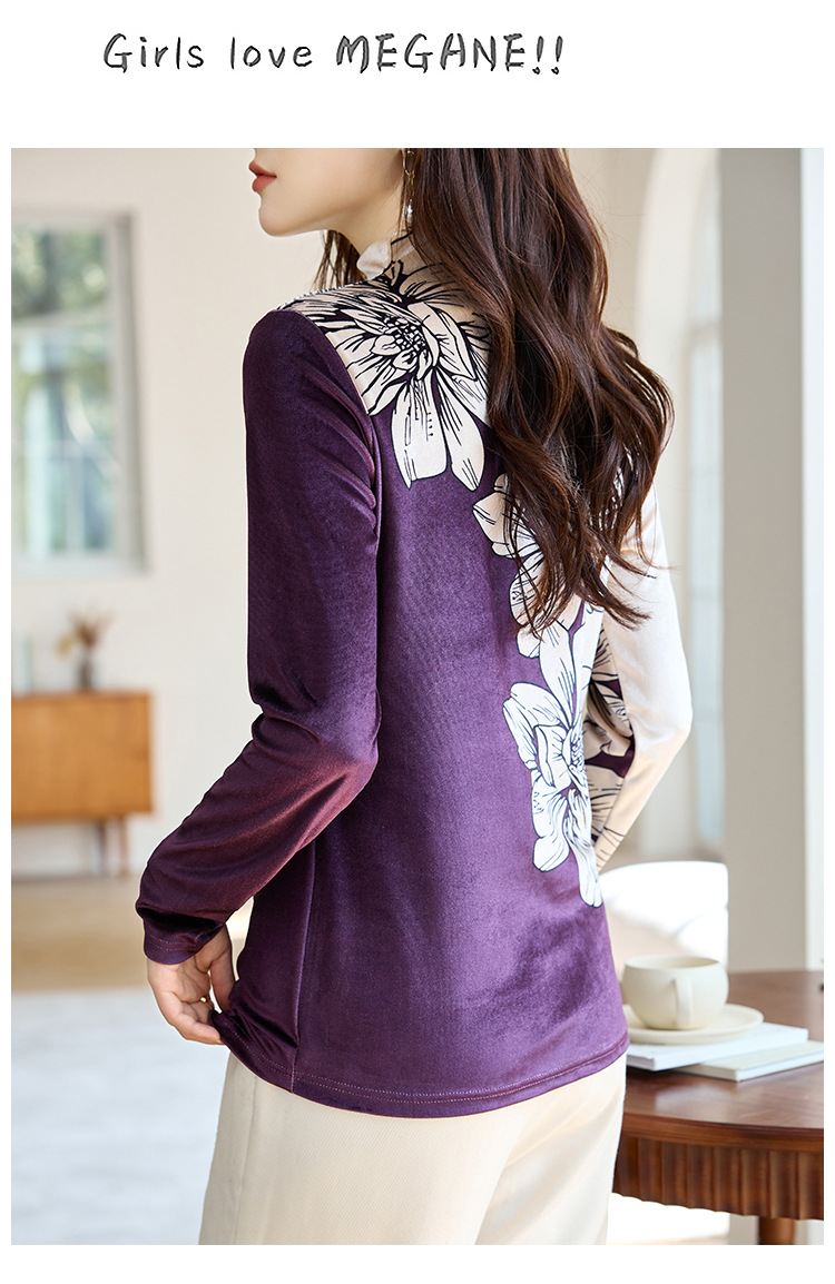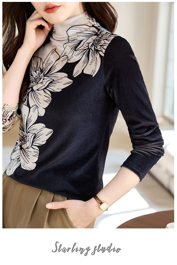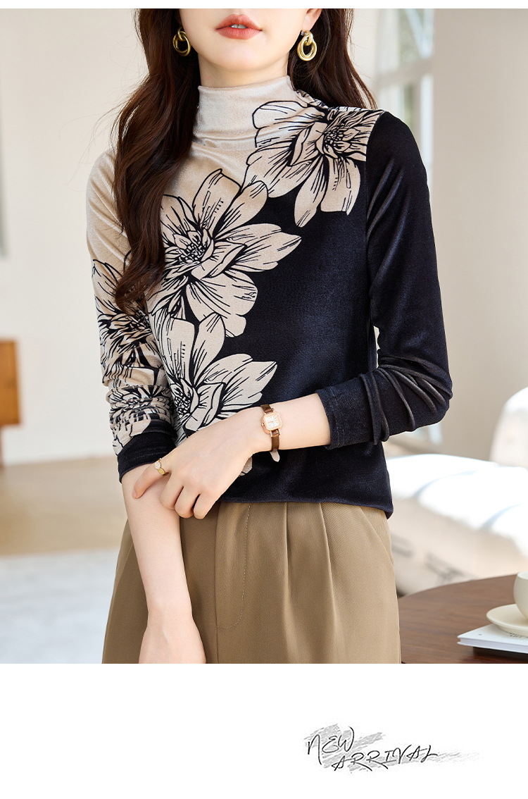 金丝绒内搭T恤,冬季新款印花加绒加厚洋气减龄显瘦打底衫KQL-A35N5387