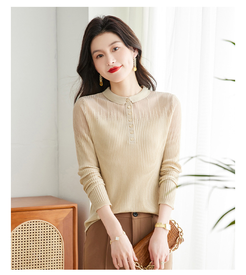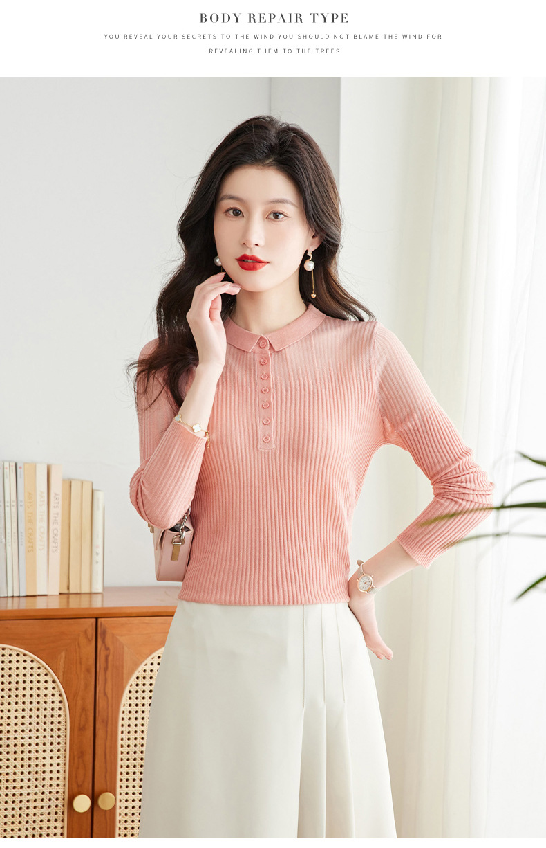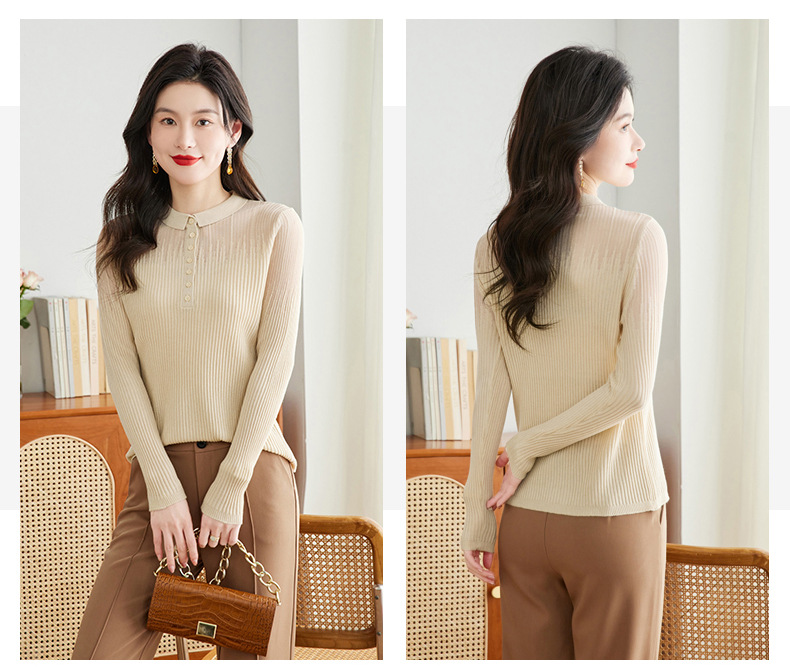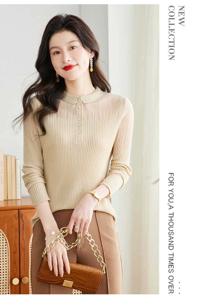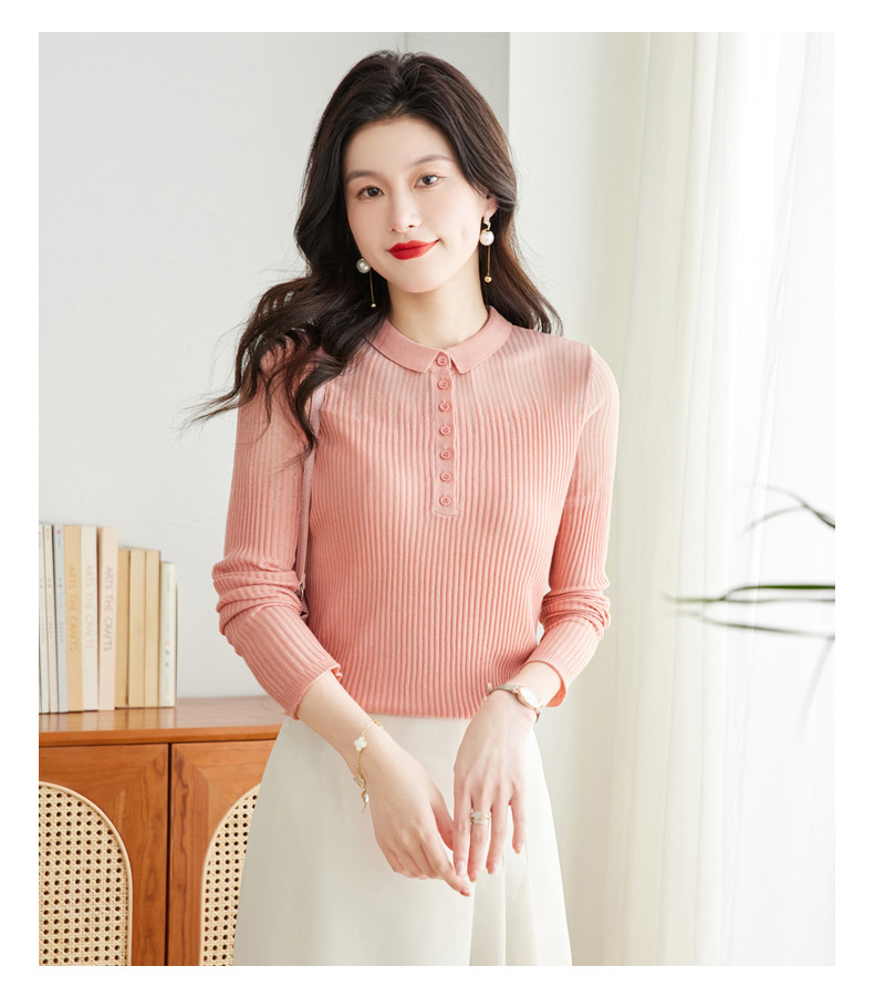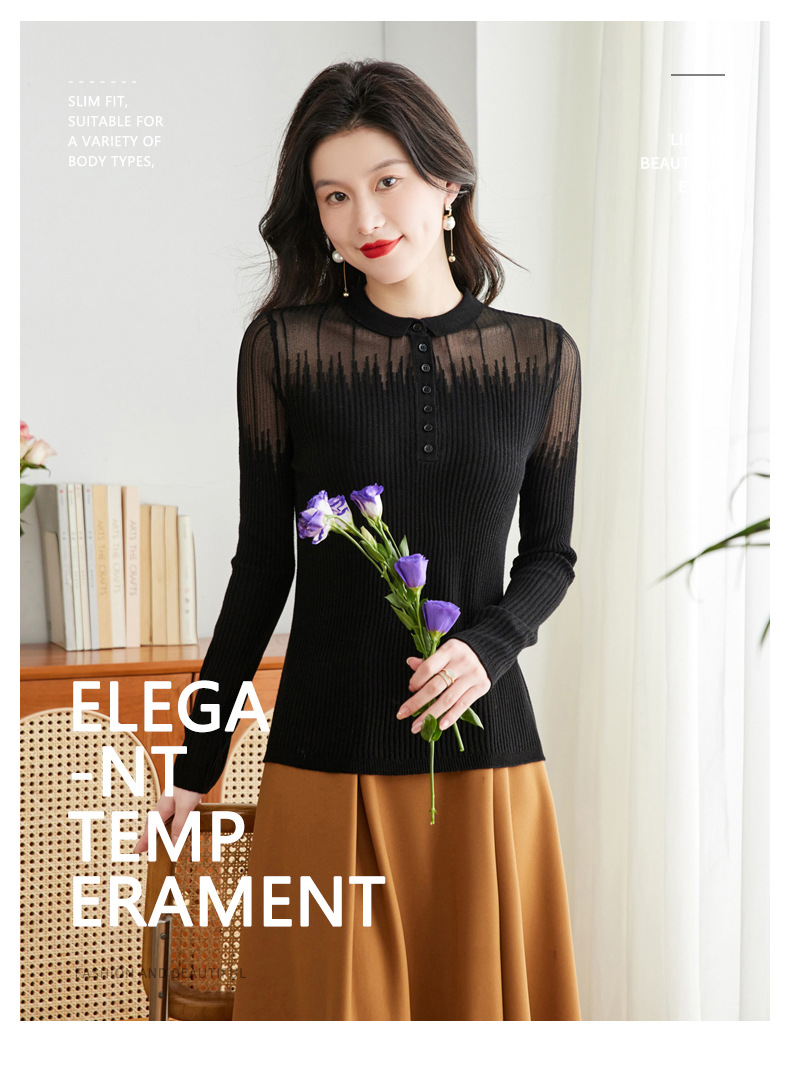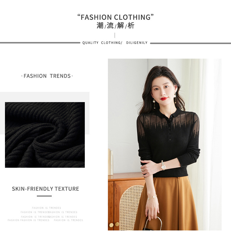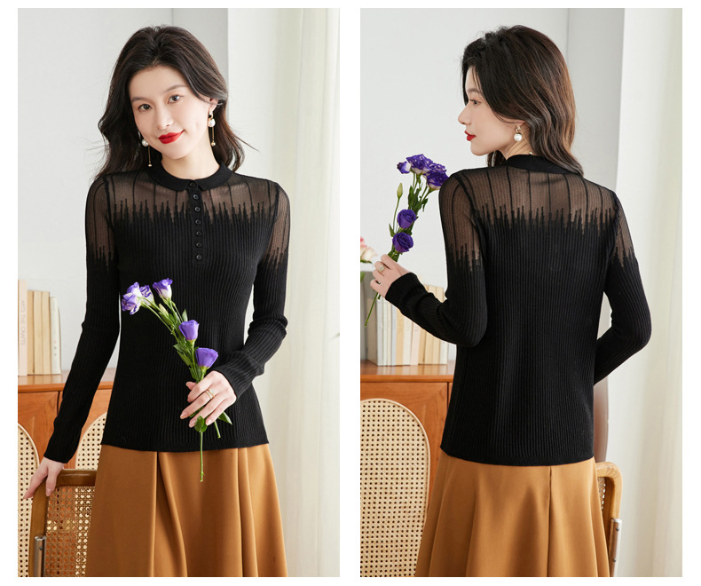翻领蕾丝打底衫,女春装新款性感网纱长袖薄款针织衫t恤CC-16-6813