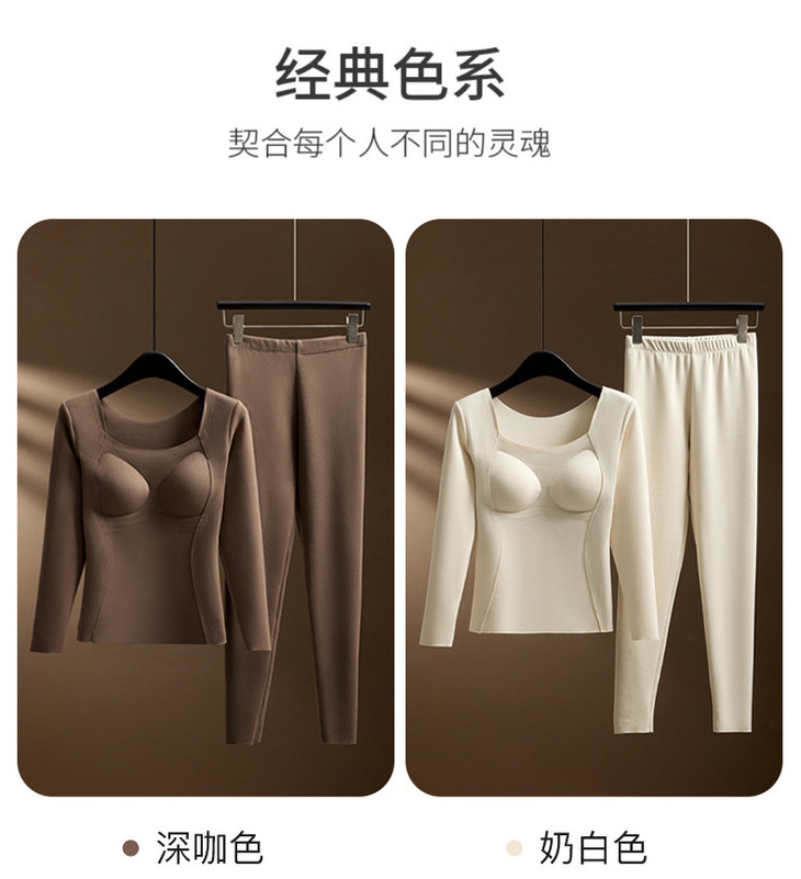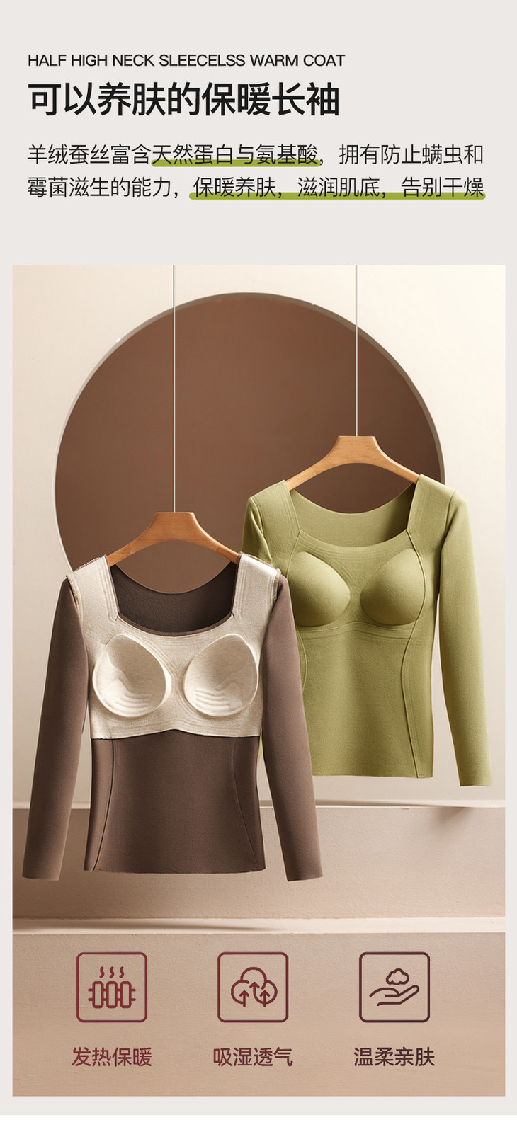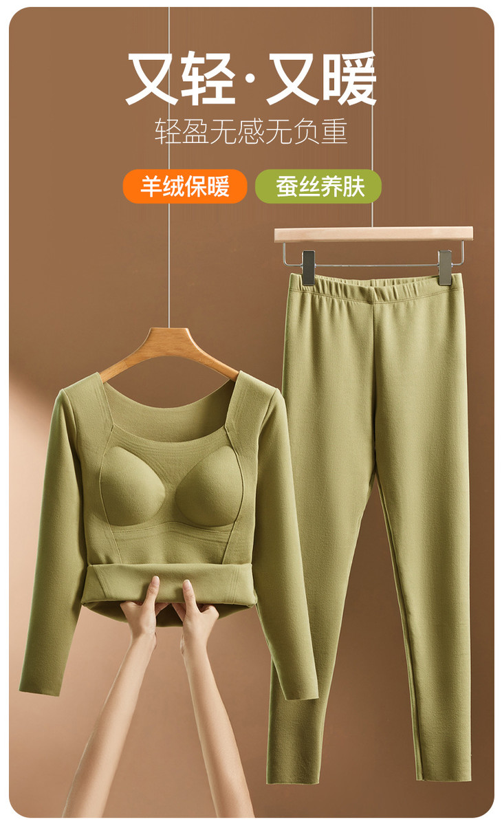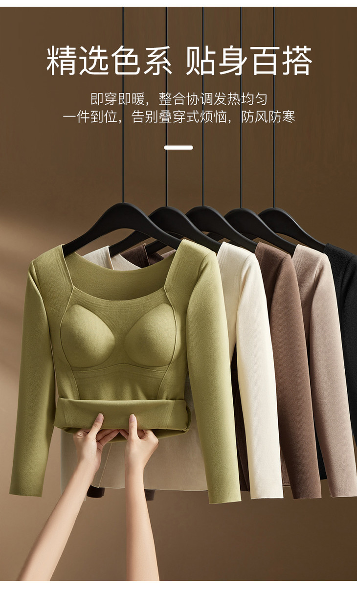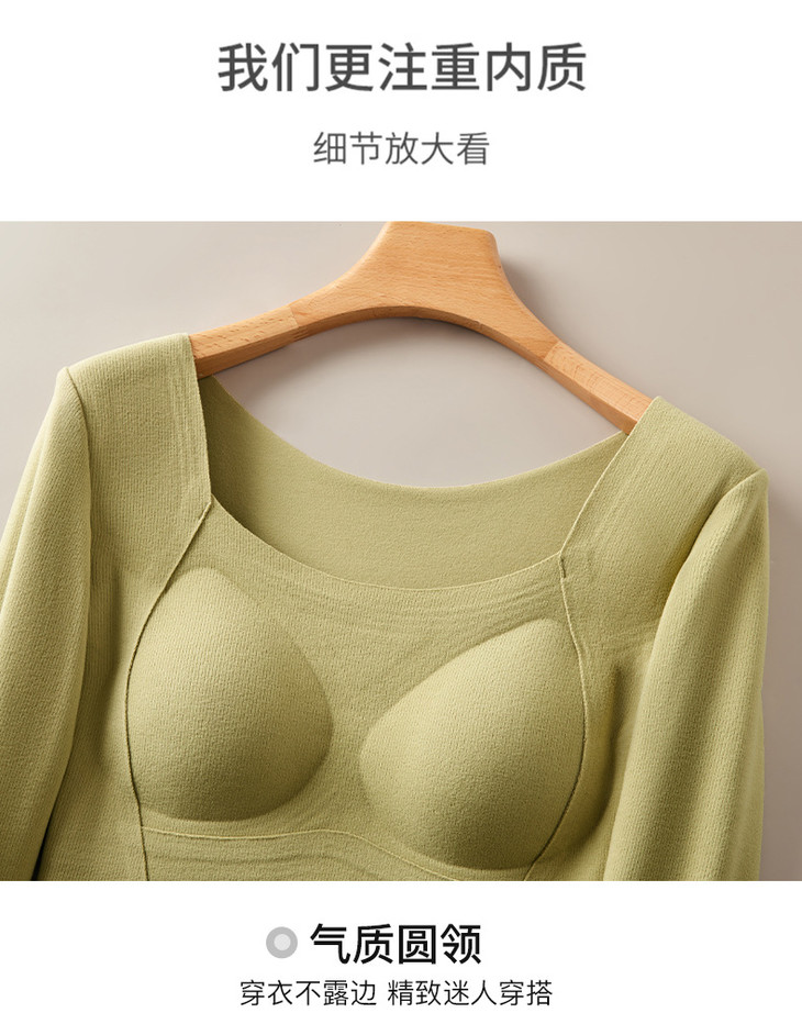 羊毛蚕丝发热保暖内衣,加绒加厚带胸垫一体上衣
