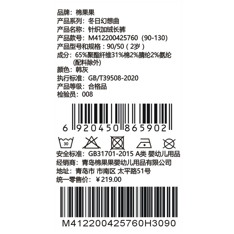 | 总裤长 | 51 | 56.5 | 62.5 | 68.5 | 75 |
