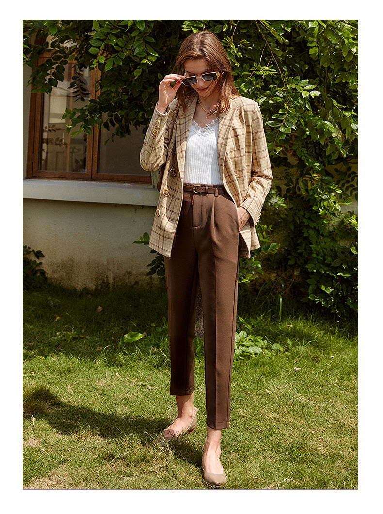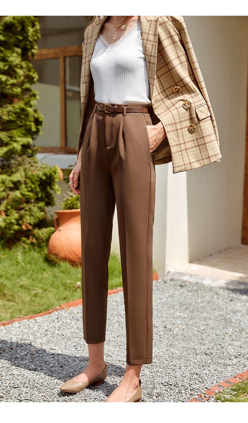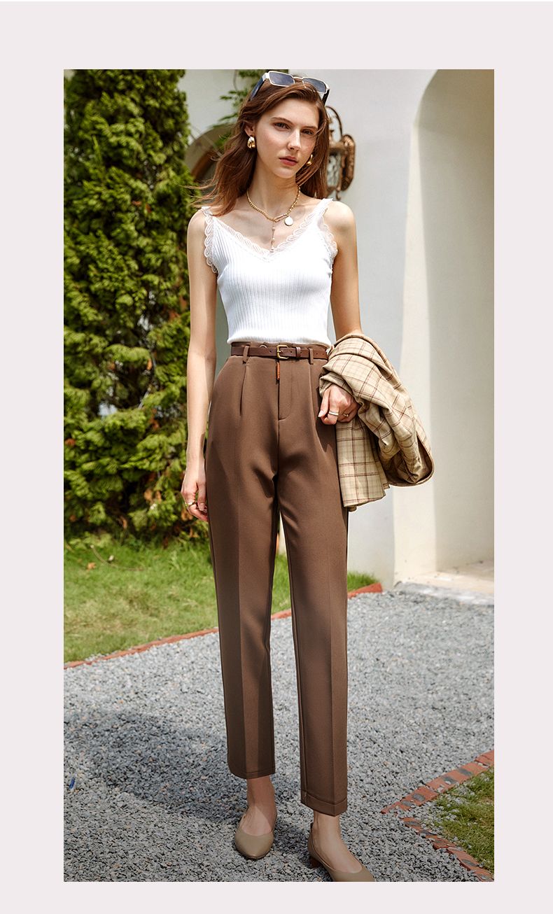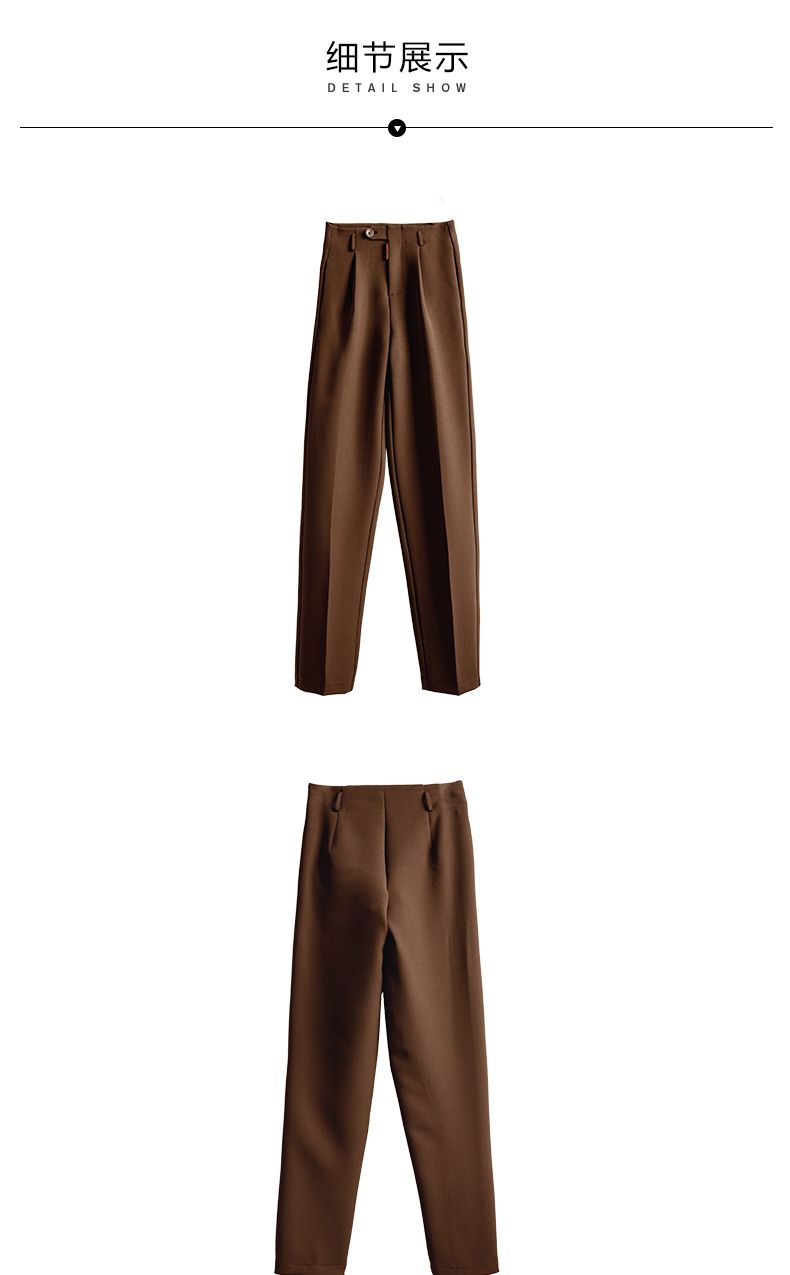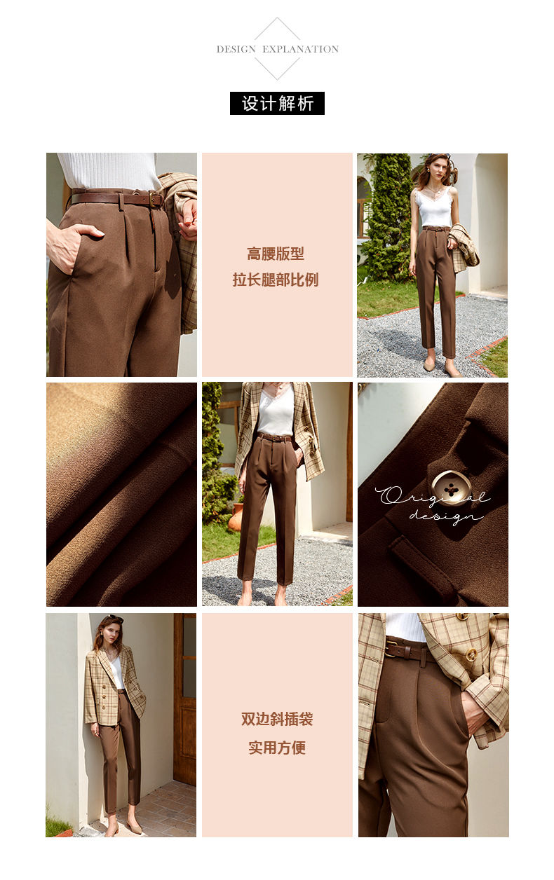 欧芮儿咖色休闲裤女秋季新款2021高腰显瘦气质简约垂感直筒九分裤