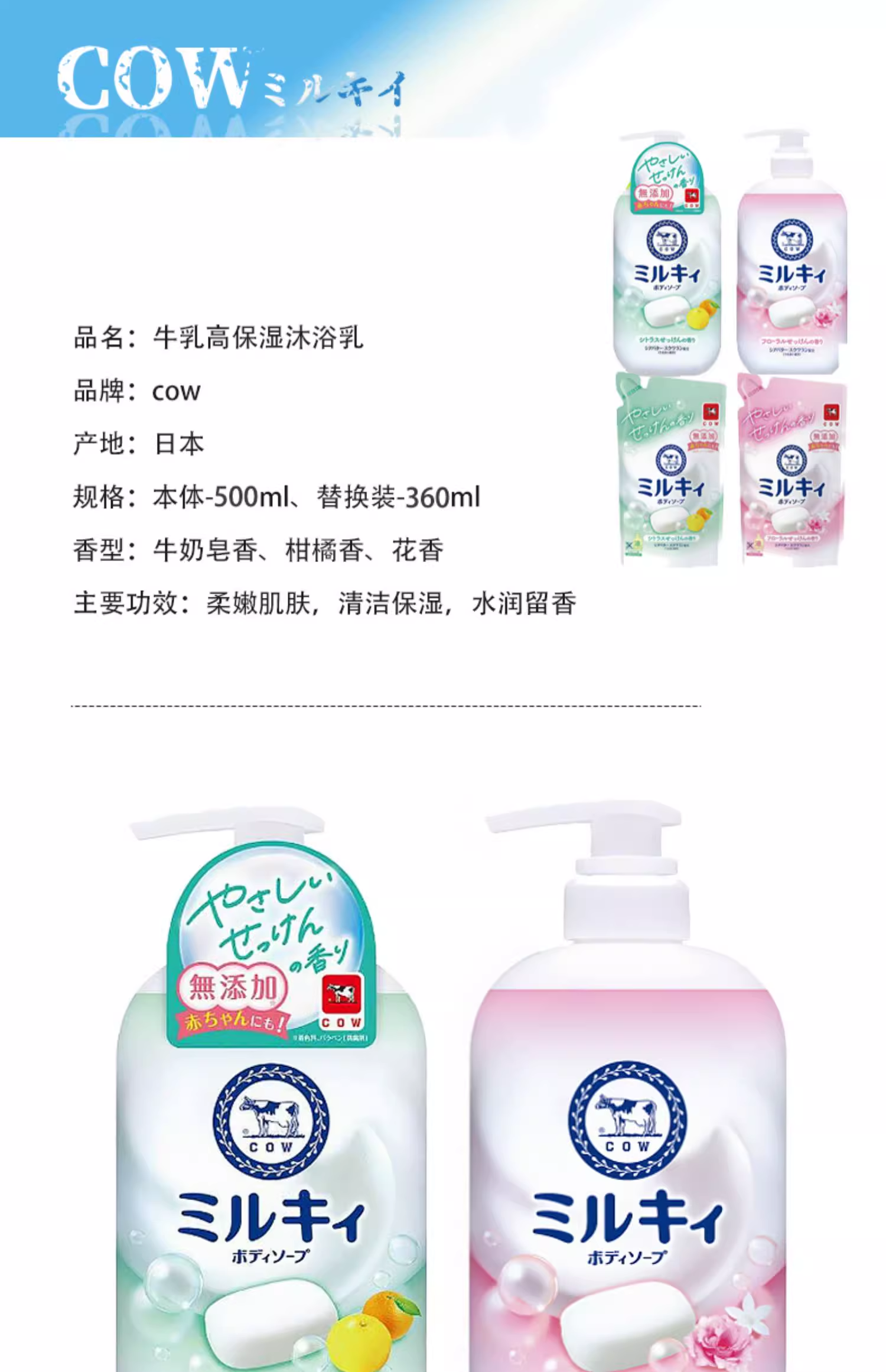 【保税仓】COW牛乳石碱沐浴露花香500ML