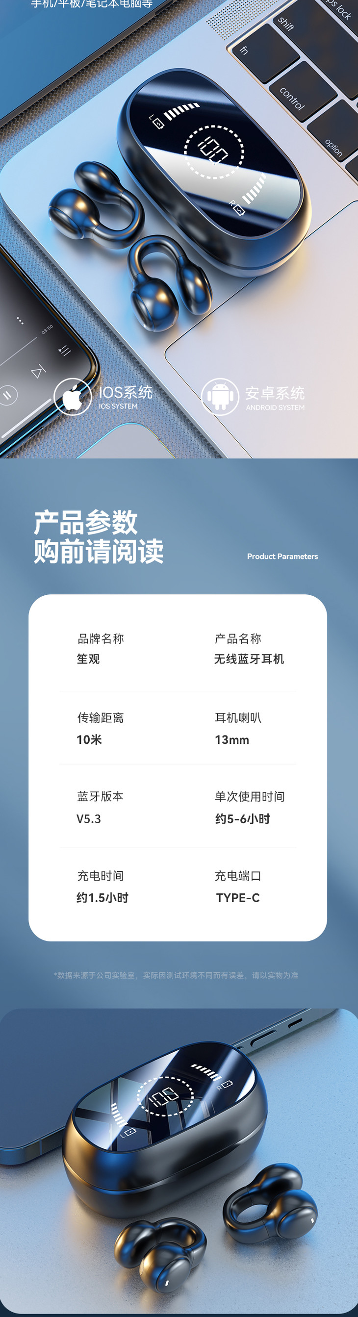 笙观-耳夹耳机 不入耳佩戴 9D立体环绕音 高清镜面数显