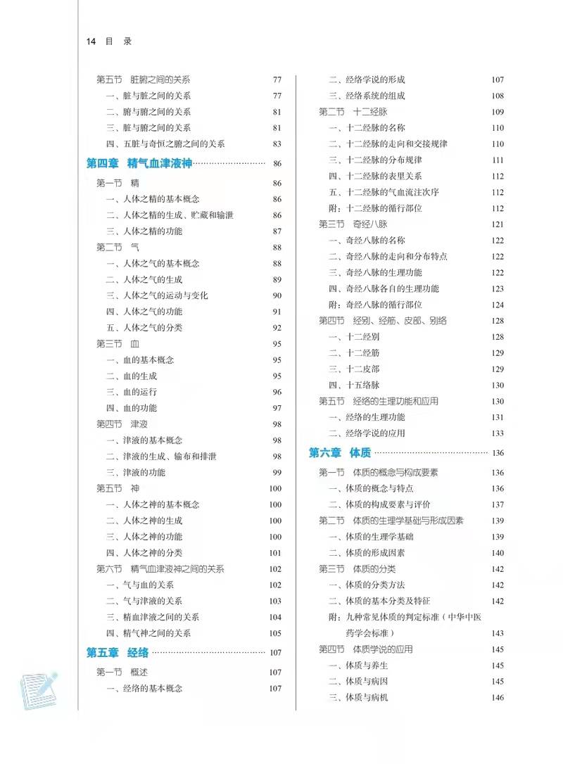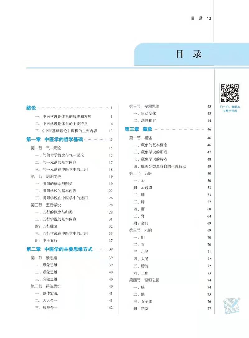 本书阐释和介绍了中医学的基本理论、基本知识和基本思维方法。内容主要包括中医学的哲学基础、藏象、精气血津液神、经络、病因、病机、防治原则等。本教材的编写内容在上版的基础上作了适度调整:除更新了现代研究进展外.删除或降格了部分临床意义不大的内容,增添了对中医临床有指导意义或与后续课程相接轨的内容,如在五行学说中删除了以五行推断病情轻重的相关内容,降格五行胜复为阅读材料,增添了中土五行及其临床应用;在气的运动部分增添了脏腑之气升降运动的理论渊源和临床应用;在藏象中增添了五脏各精气阴阳的生理作用,作为阅读材料.以与后续课程中医诊断学接轨;在体质中增添了九种体质的判定标准为阅读材料,以利于临床应用等。