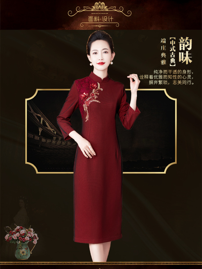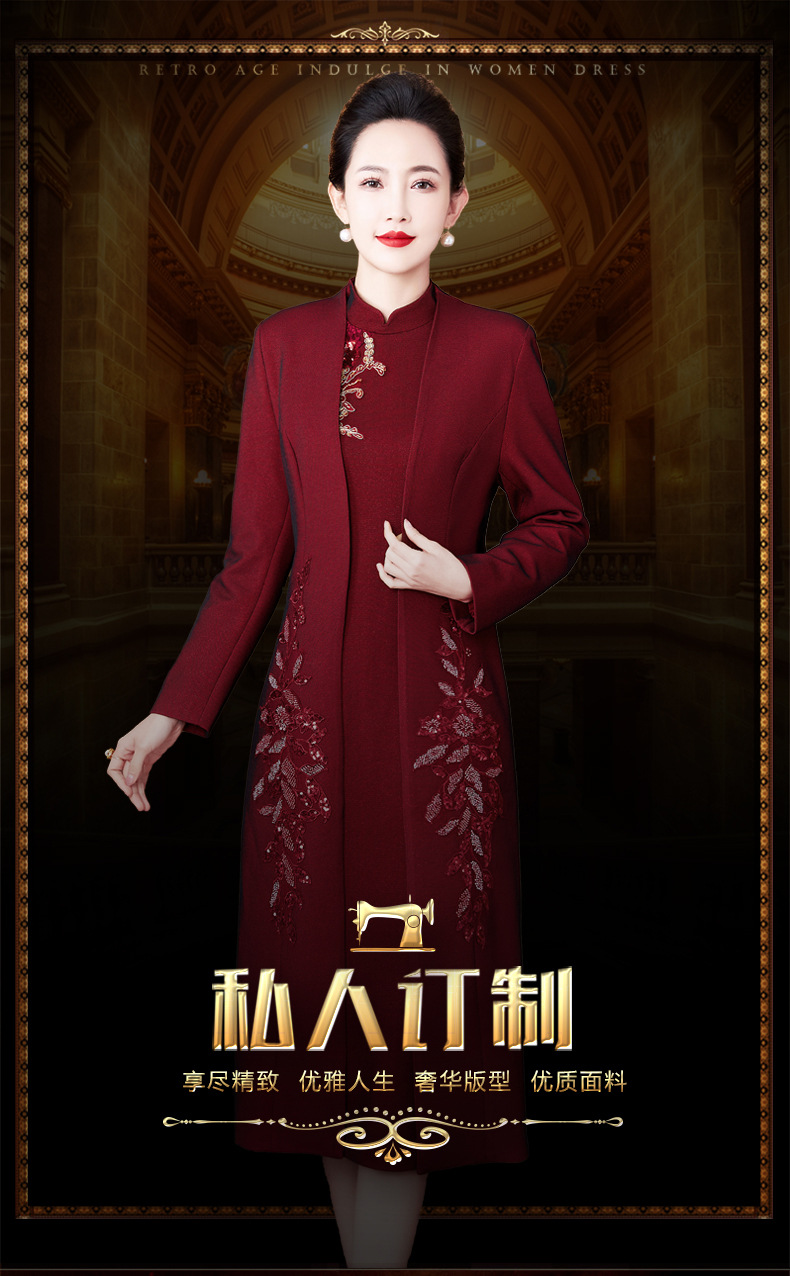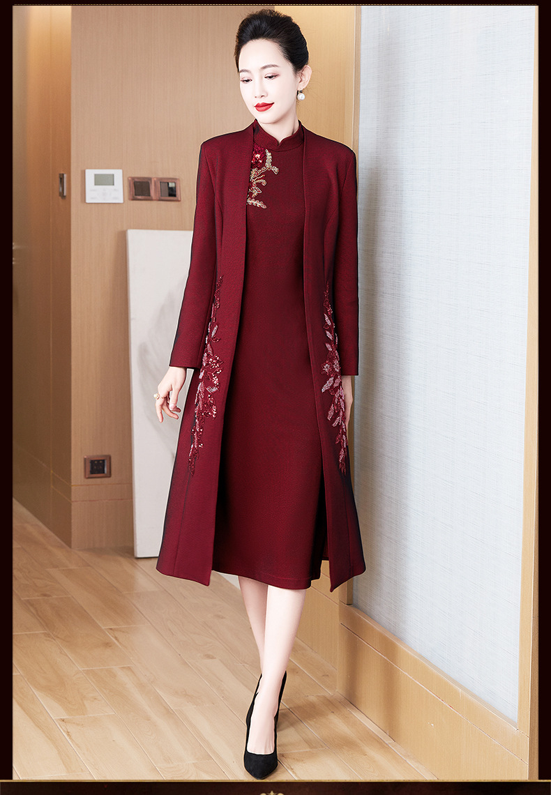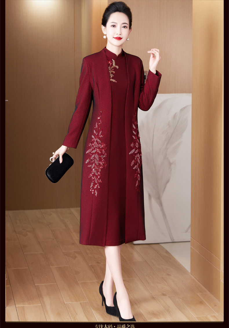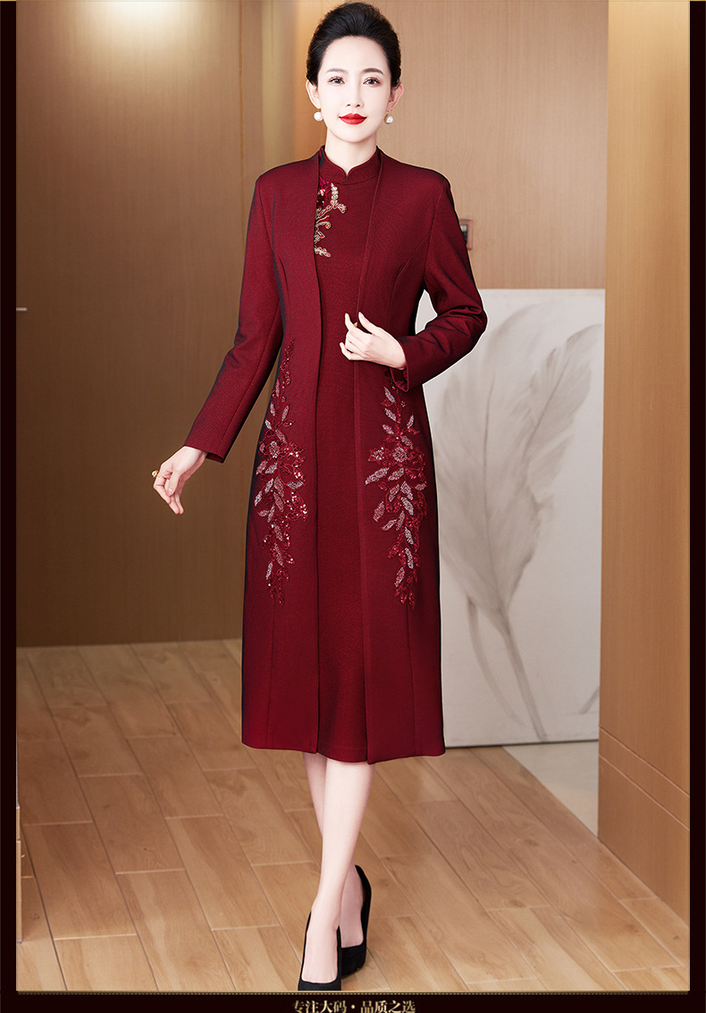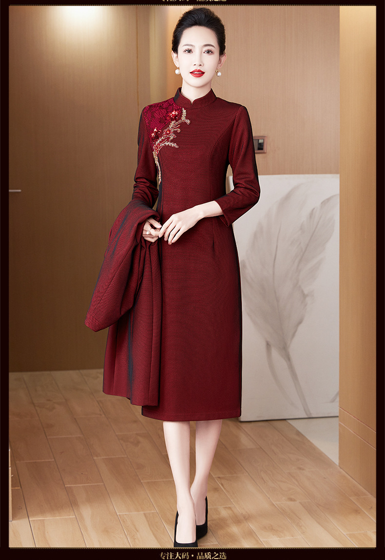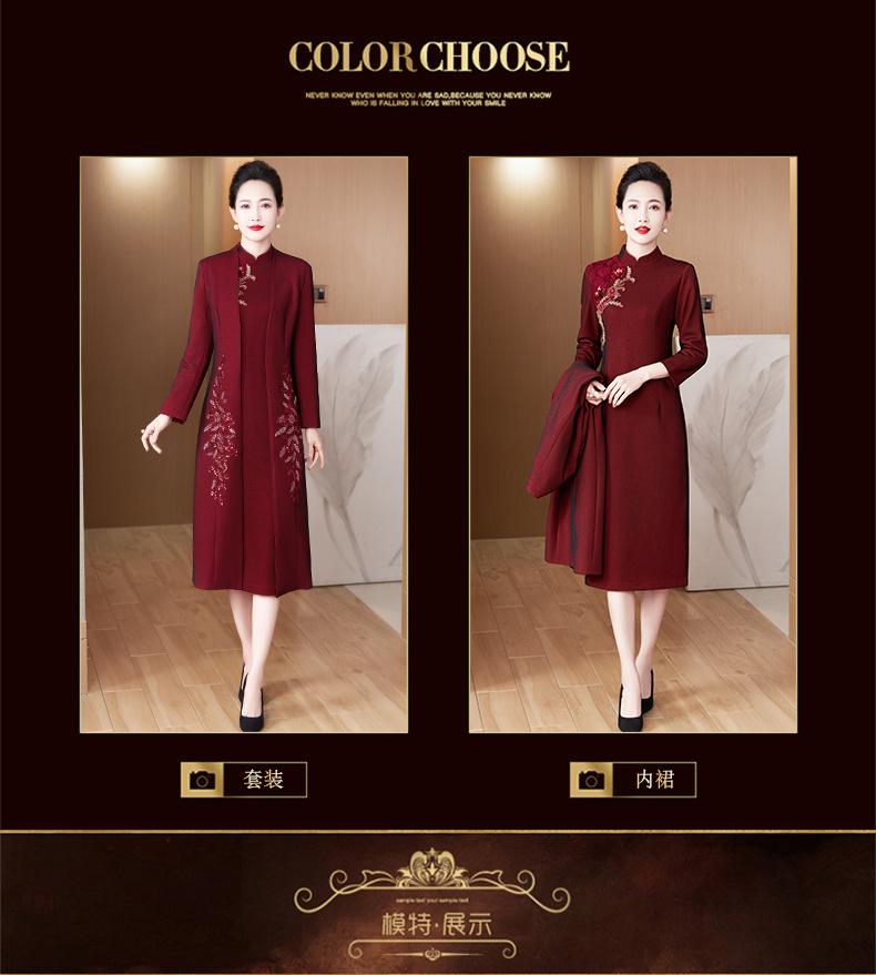 2024年春季修身旗袍妈妈装立领中长款重工钉珠连衣裙两件套LC-2429