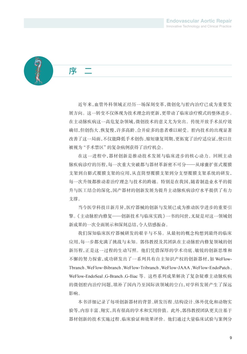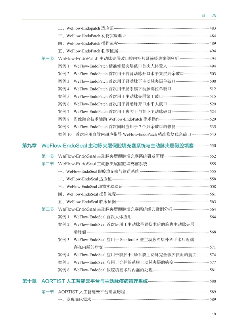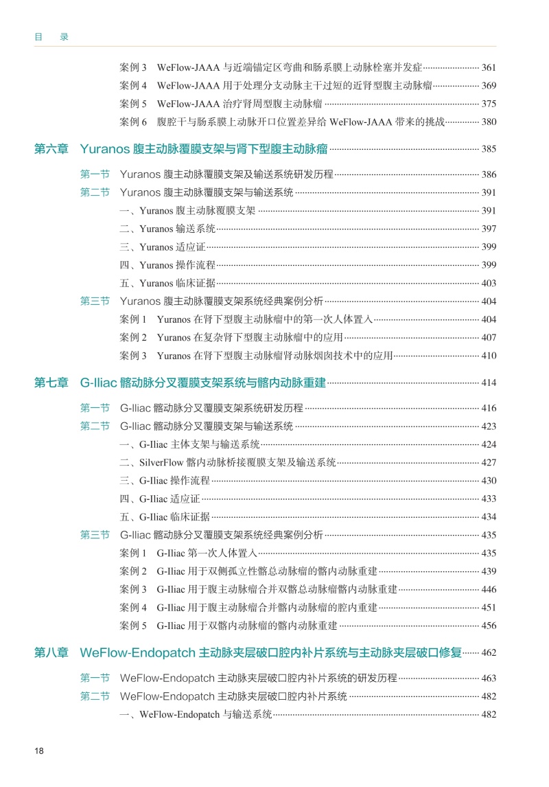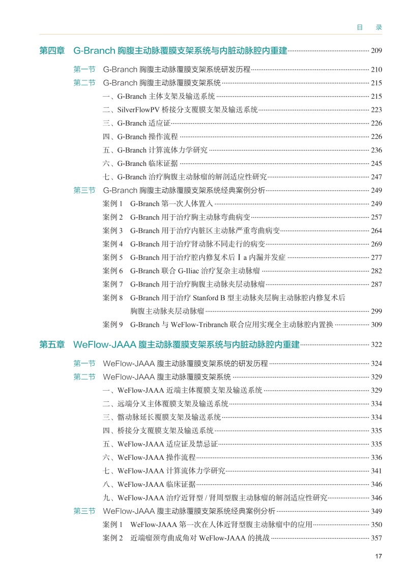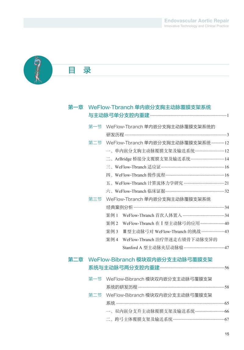 本书将详细介绍主编团队设计的各类腔内主动脉器材,包括WeFlow-Arch系列(T-Branch、BiBranch、TriBranch)、G-branch、WeFlow-JAAA、Yuranos、G-iliac、WeFlow-EndoPatch、WeFlow-EndoSeal等,阐述其设计理念、技术特点、操作技巧及应用场景等。每一部分均结合真实病例分析,提供详细的手术流程及注意事项。同时总结相关的临床证据,包括多中心研究、临床试验结果等,以科学数据支撑器材的有效性与安全性。此间还探讨了未来的发展方向及技术创新,以期为后续研究提供参考。