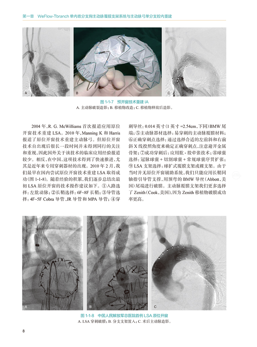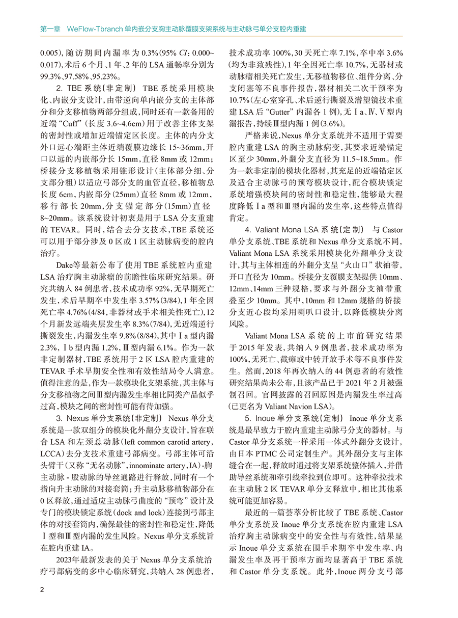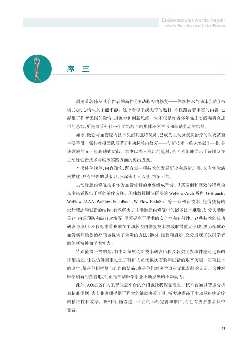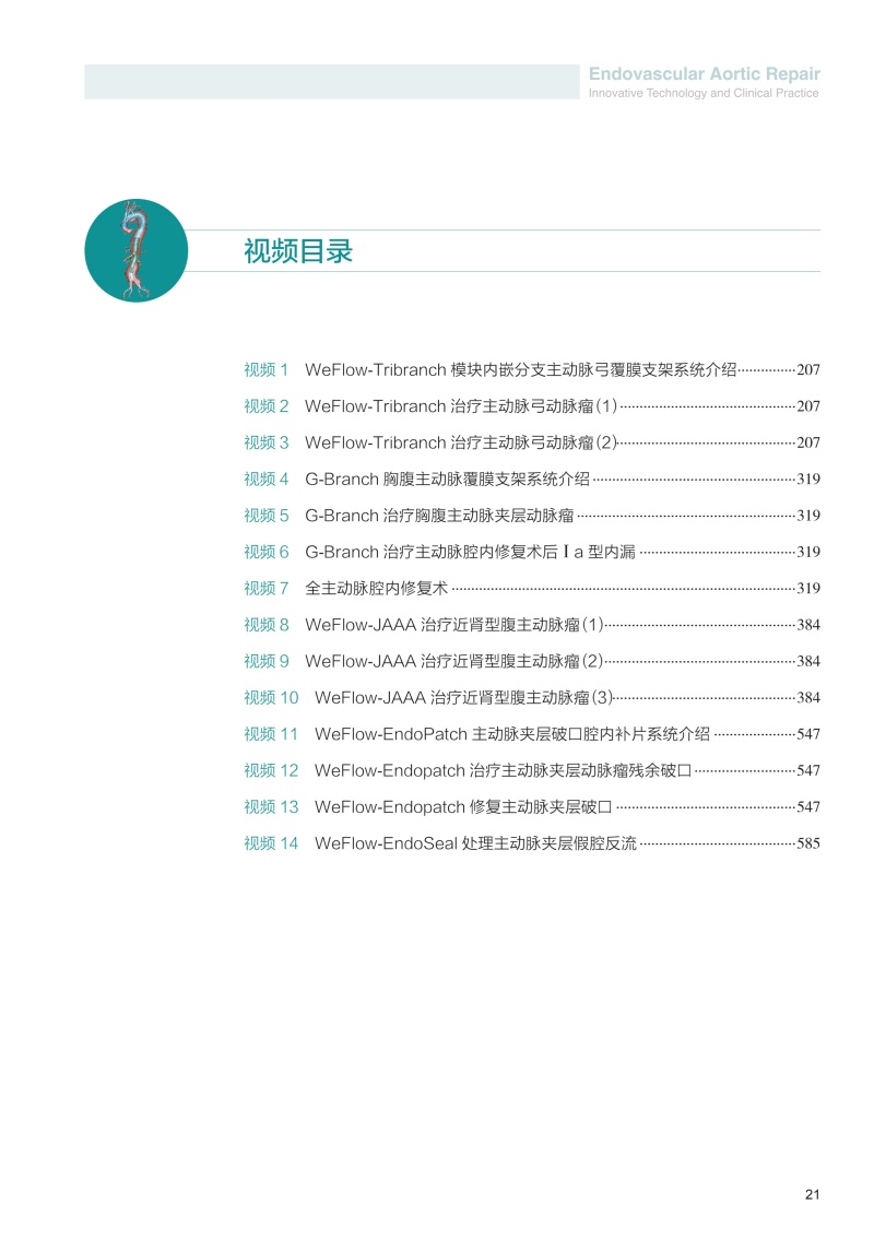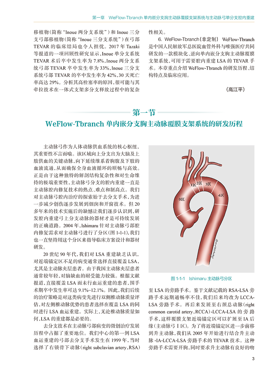 本书将详细介绍主编团队设计的各类腔内主动脉器材,包括WeFlow-Arch系列(T-Branch、BiBranch、TriBranch)、G-branch、WeFlow-JAAA、Yuranos、G-iliac、WeFlow-EndoPatch、WeFlow-EndoSeal等,阐述其设计理念、技术特点、操作技巧及应用场景等。每一部分均结合真实病例分析,提供详细的手术流程及注意事项。同时总结相关的临床证据,包括多中心研究、临床试验结果等,以科学数据支撑器材的有效性与安全性。此间还探讨了未来的发展方向及技术创新,以期为后续研究提供参考。