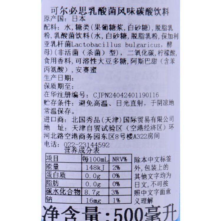 可尔必思乳酸菌风味碳酸饮料500ml罐装