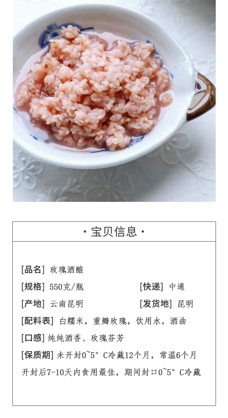 热卖【玫瑰酒酿】,精选云南墨江白糯米,重瓣玫瑰,甜而不腻,纯正的酒香,还有淡淡的玫瑰芬芳!云南老师傅手工制作,酒精度只有5度,很低,日常搭配酸奶、鸡蛋、水果,不会醉的(3天内发货)