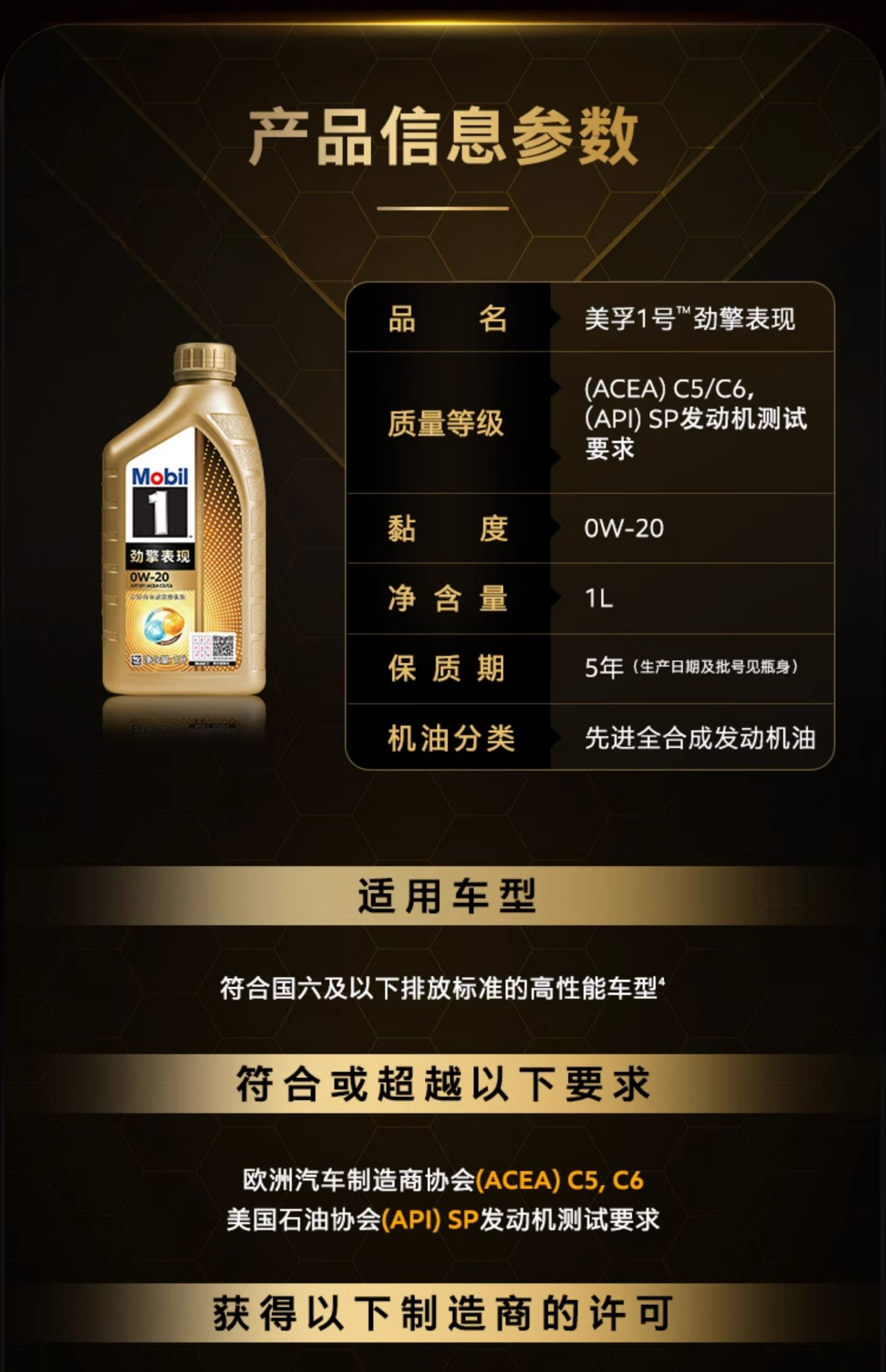 Mobil美孚1号劲擎表现超金0W-20 1L API SP 全合成汽车发动机油