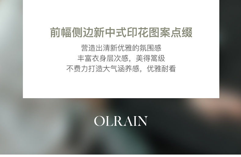 - “精致”是欧芮儿olrain品牌文化的核心,欧芮儿认为,精致的女人,不但要外在动人,更要内在迷人,内外兼修,有魅力、有气质、有内涵,自信而不自傲,优雅而不矫揉,自有万种风情而不轻浮,更不故作矜持。