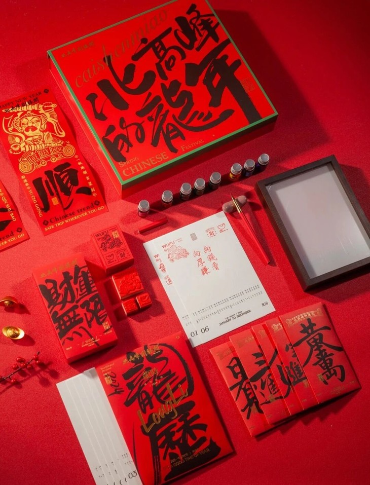 整套新年礼包非常精美,产品丰富,含:五封财运红包、两张陶符、一套财神印章、一盒印泥、一套龙年月历、八色彩墨、一个山形(元宝)笔架、一支小楷毛笔和一个月历相框。
