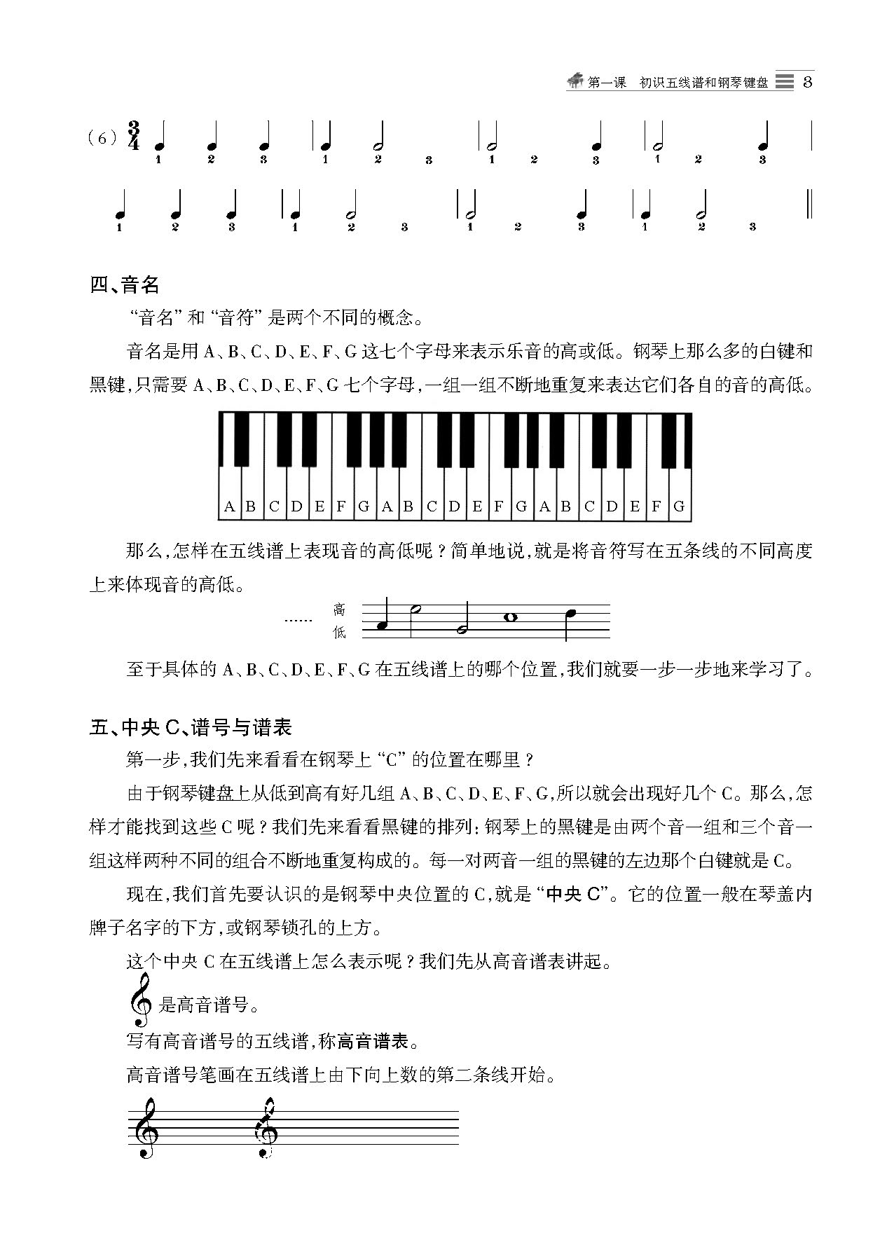 一、音符的行进规律,A、B、c、D、E音的记谱和在键盘上的位置