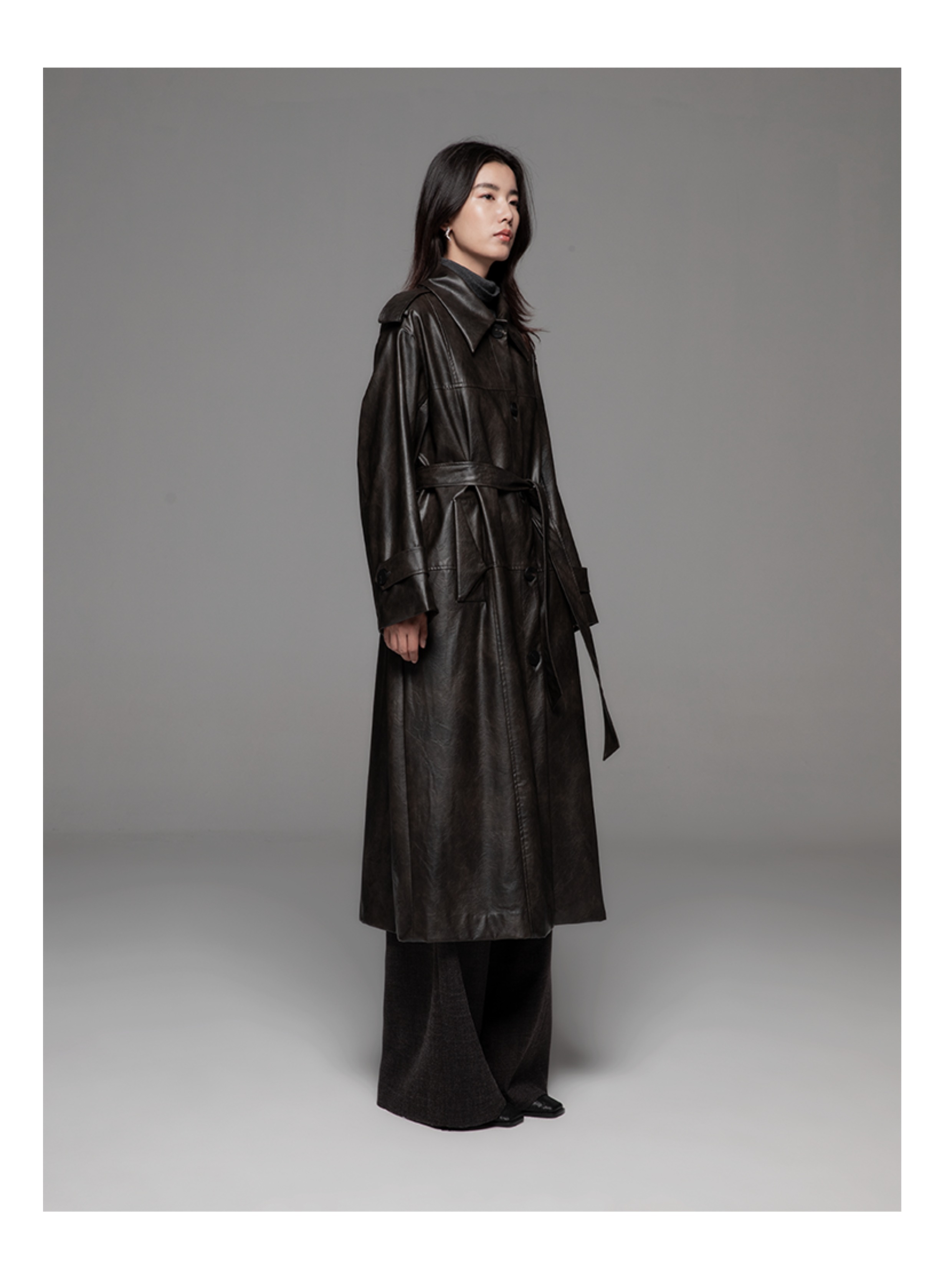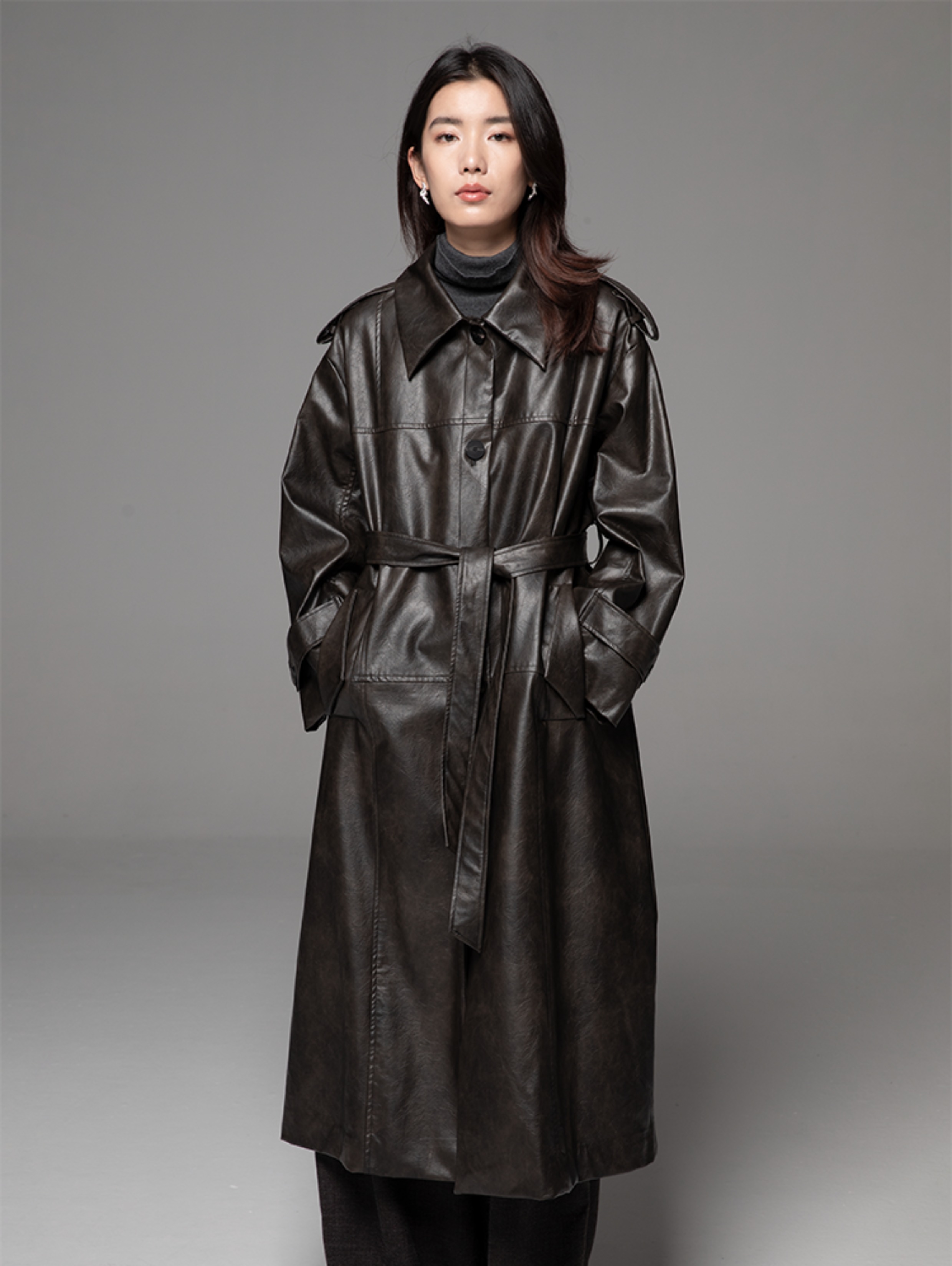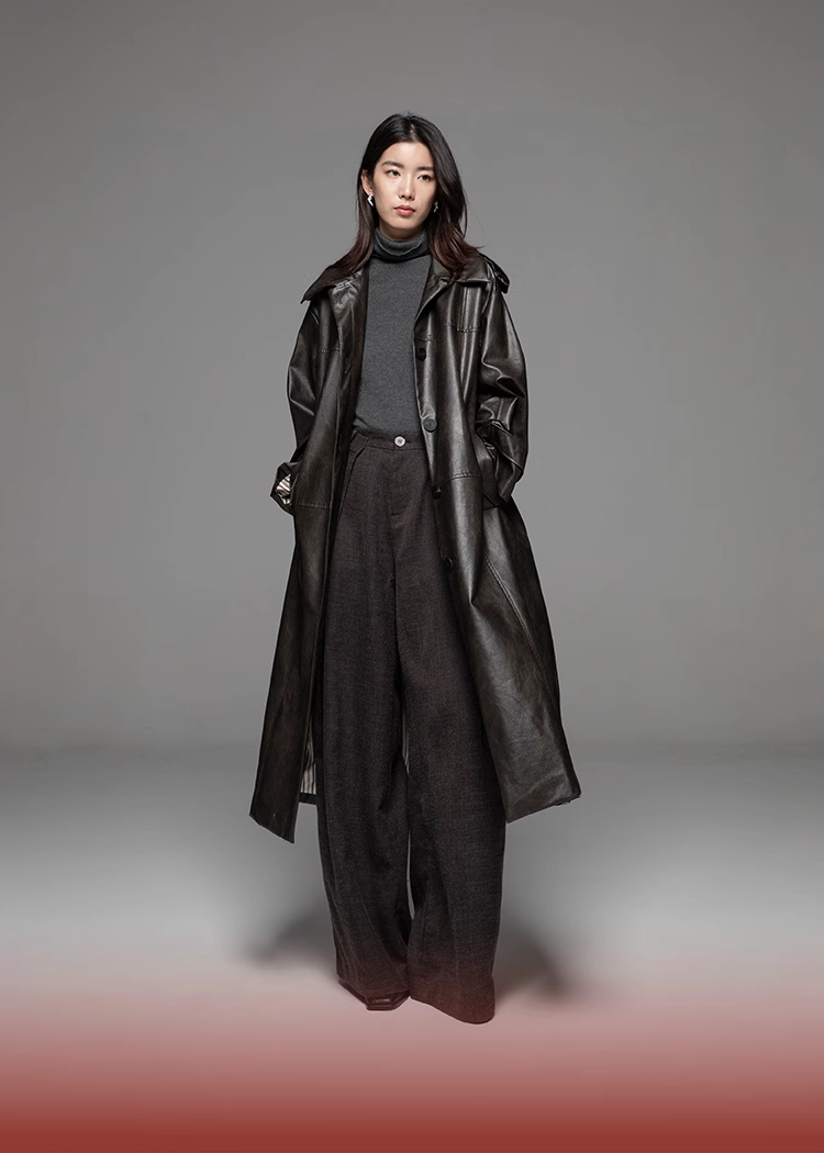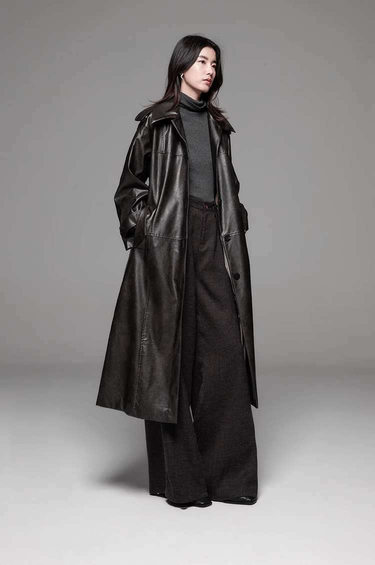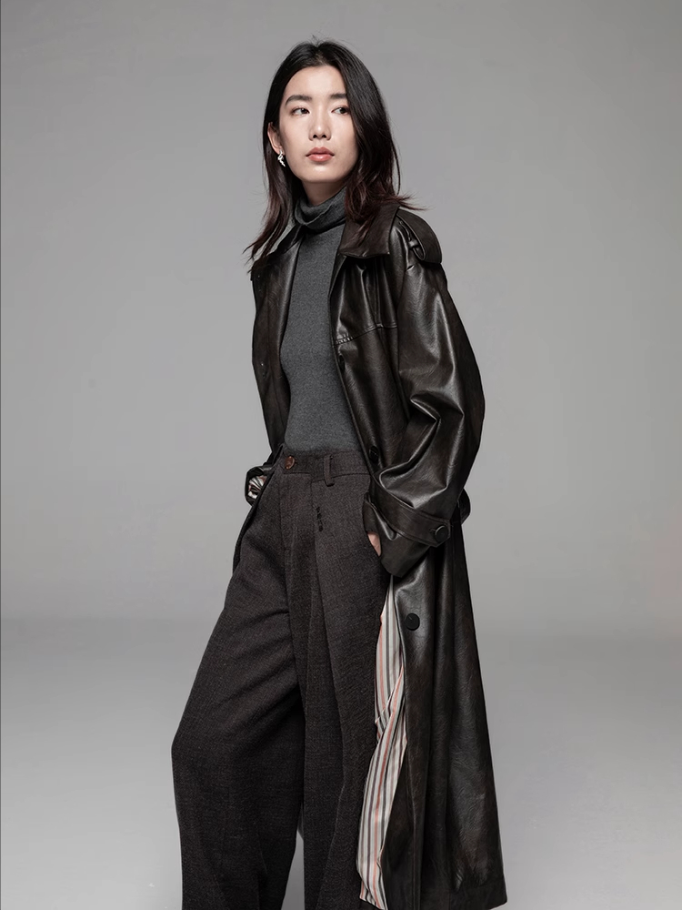 LIYIHAN 24秋中长款PU风衣外套女拼接柔软皮衣宽松翻领复古设计感