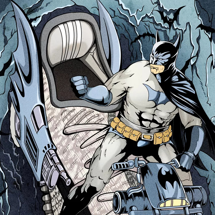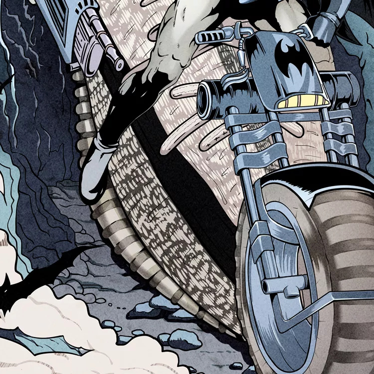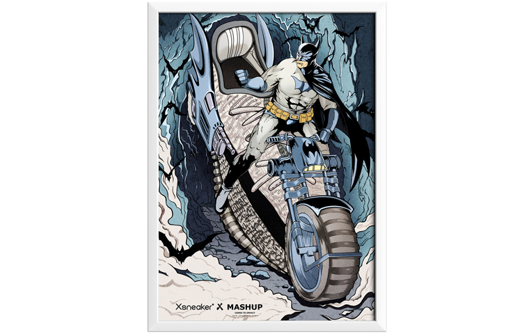 此画以布鲁斯·韦恩(Bruce Wayne),即“蝙蝠侠(Batman)"(美国DC漫画旗下的超级英雄)为原型,换蝙蝠侠摩托为yezzy350鞋,将潮流与漫威漫画进行混搭、结合创作而成。