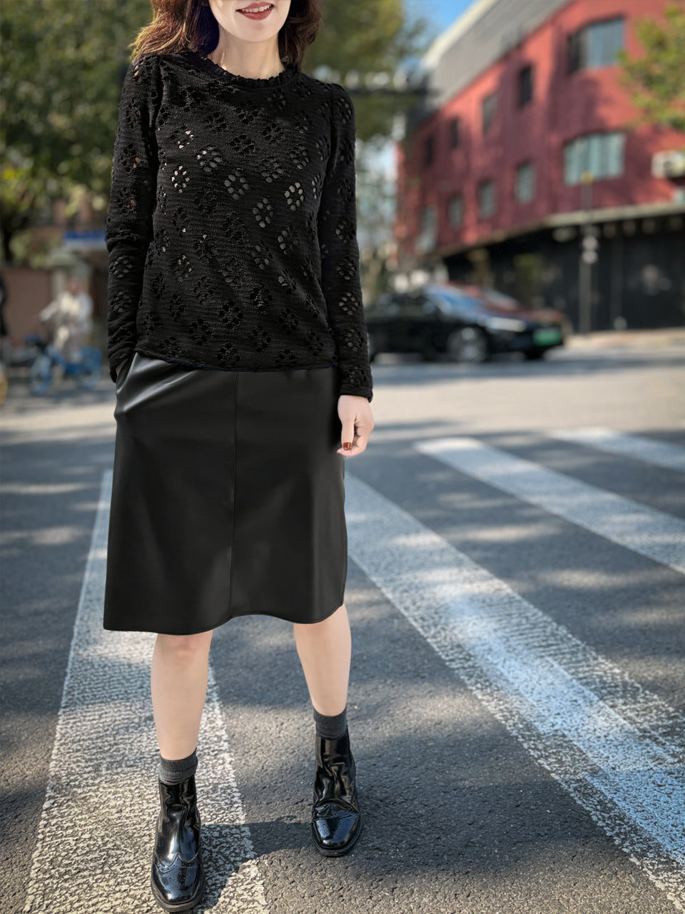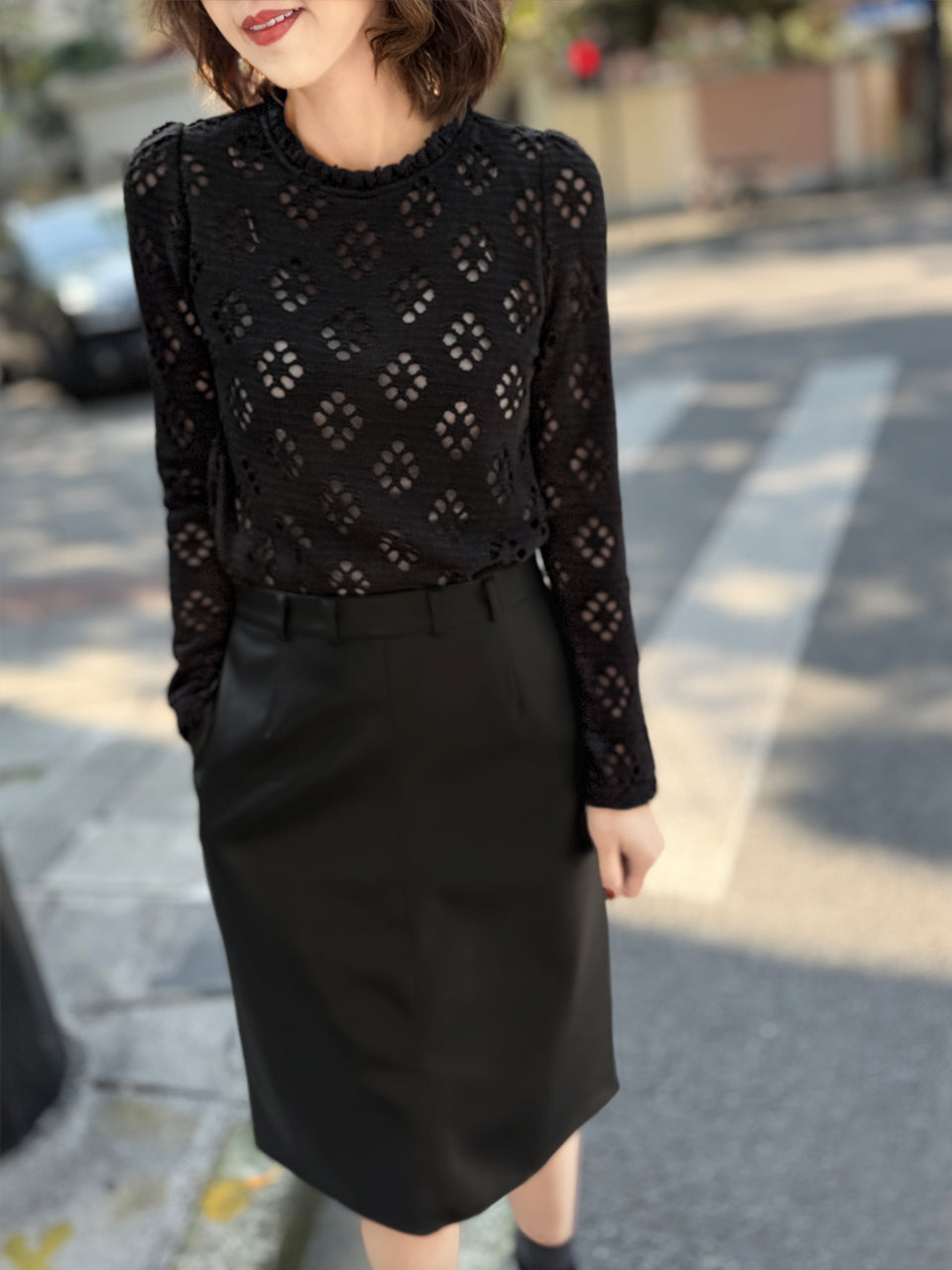 TYNVIE 木耳边领口通花长袖上衣 - 黑色