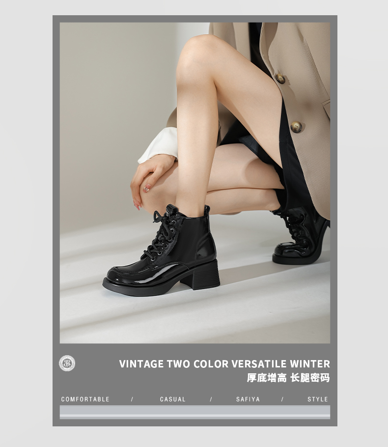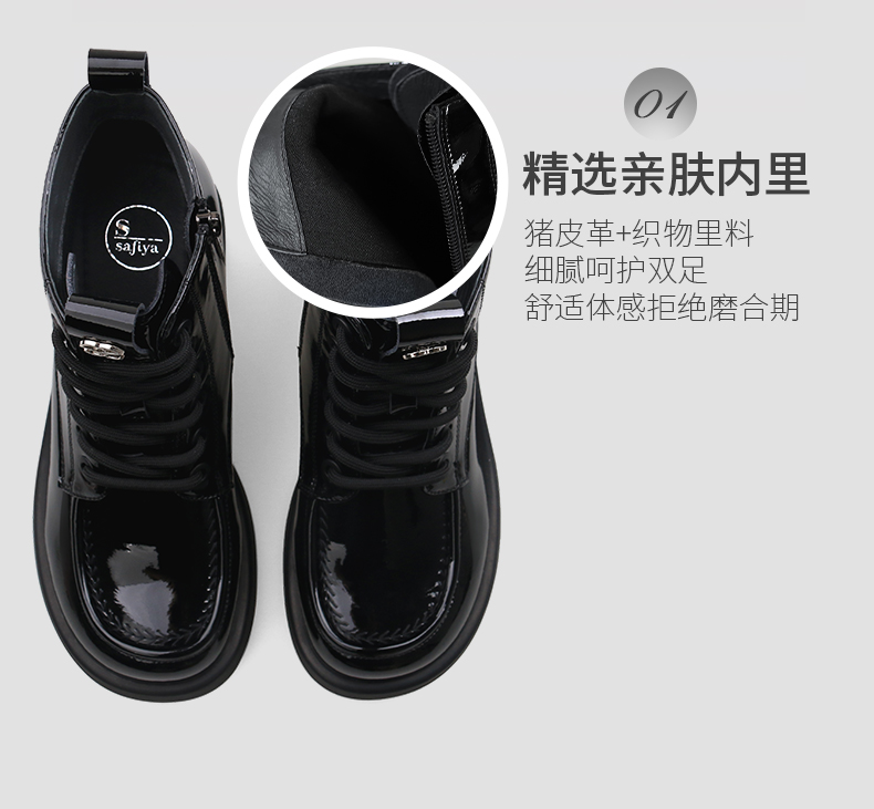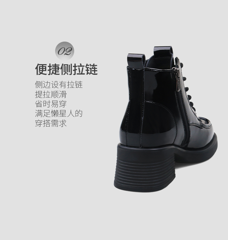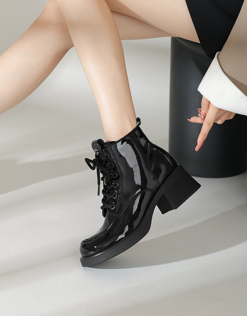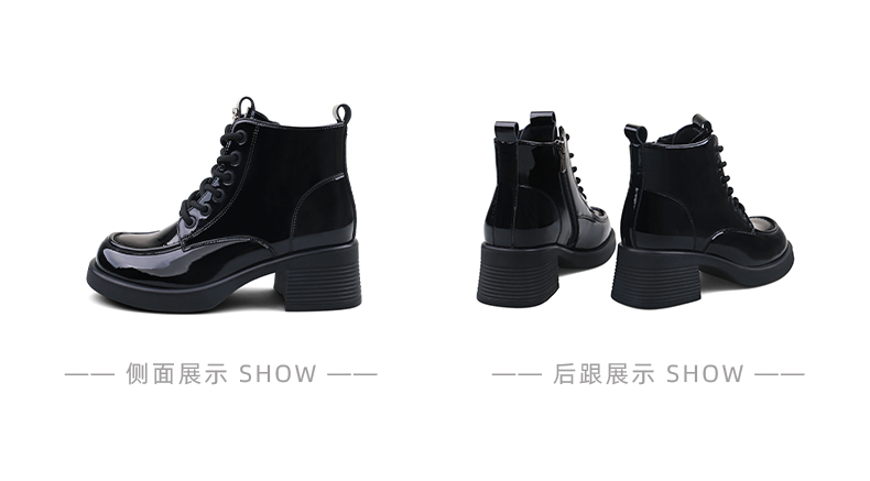 Safiya/索菲娅2024冬英伦风圆头侧拉链时尚漆皮粗高跟厚底马丁靴 SF44116253