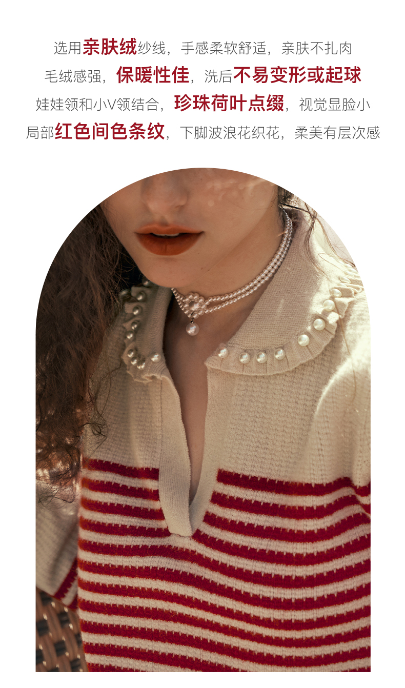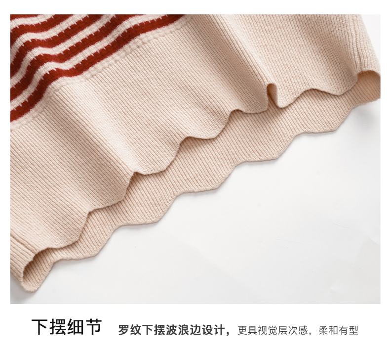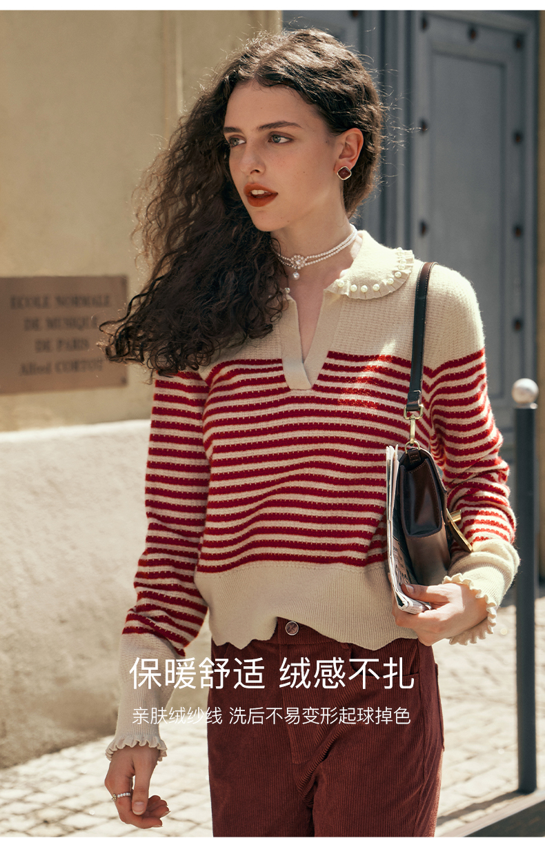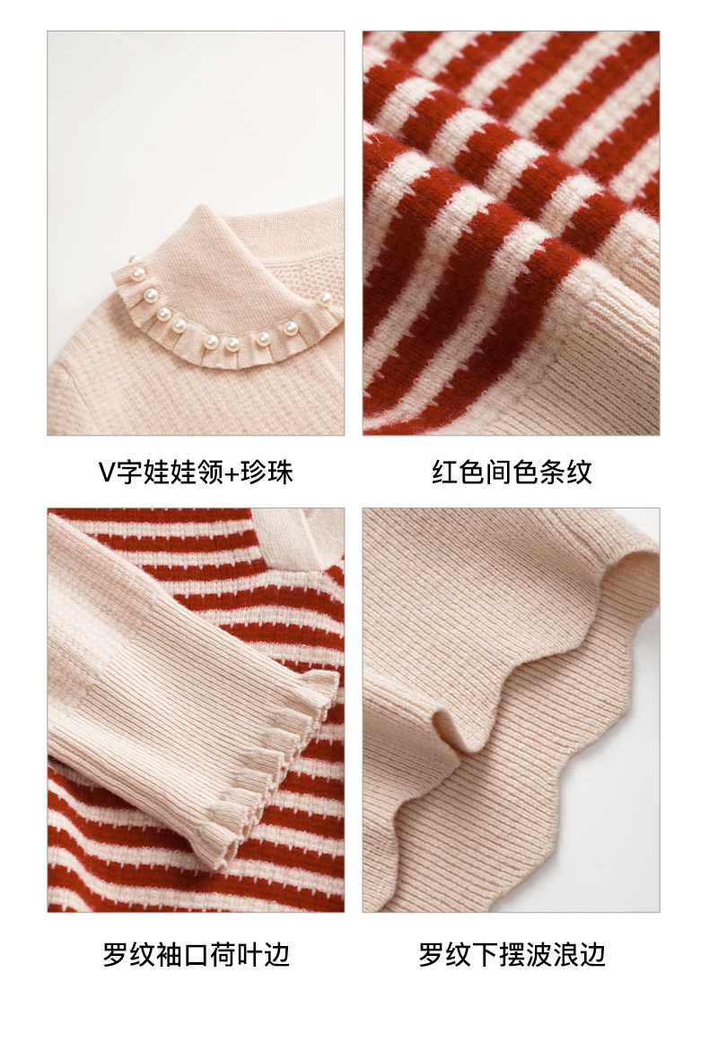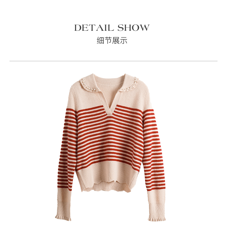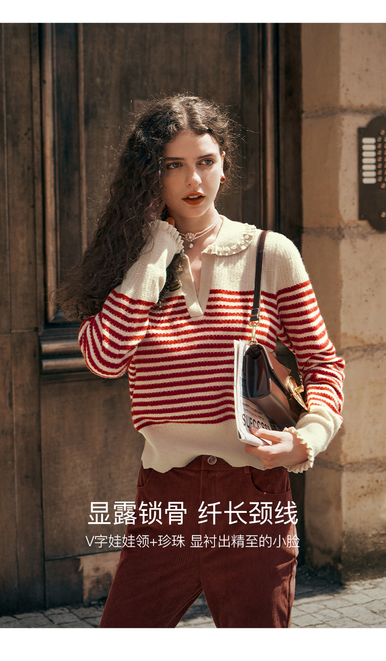 OLrain欧芮儿条纹毛衣女初秋2023年新款宽松套头上衣娃娃领针织衫