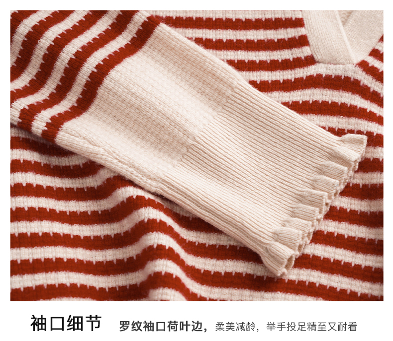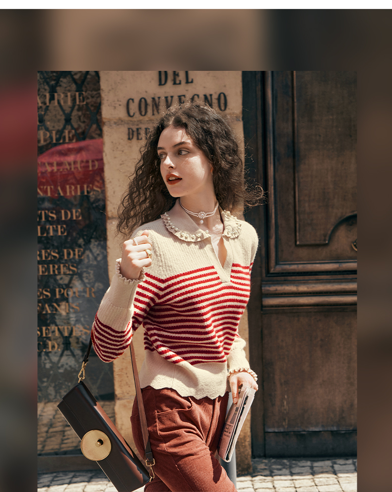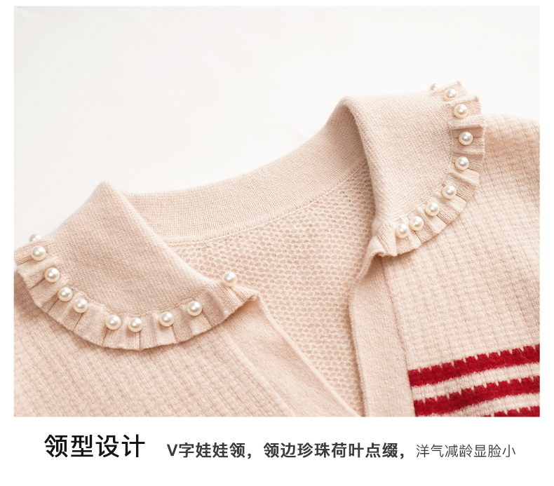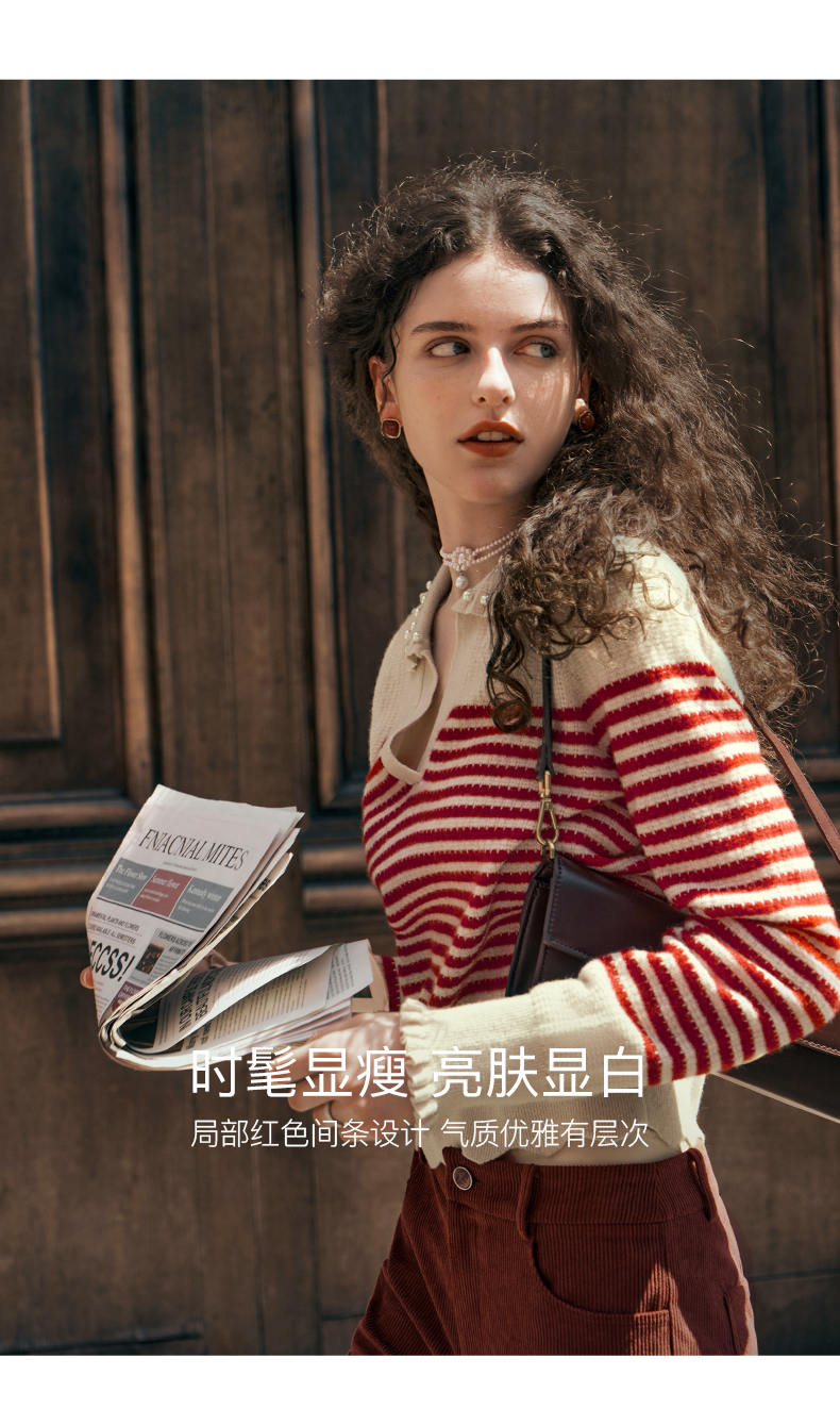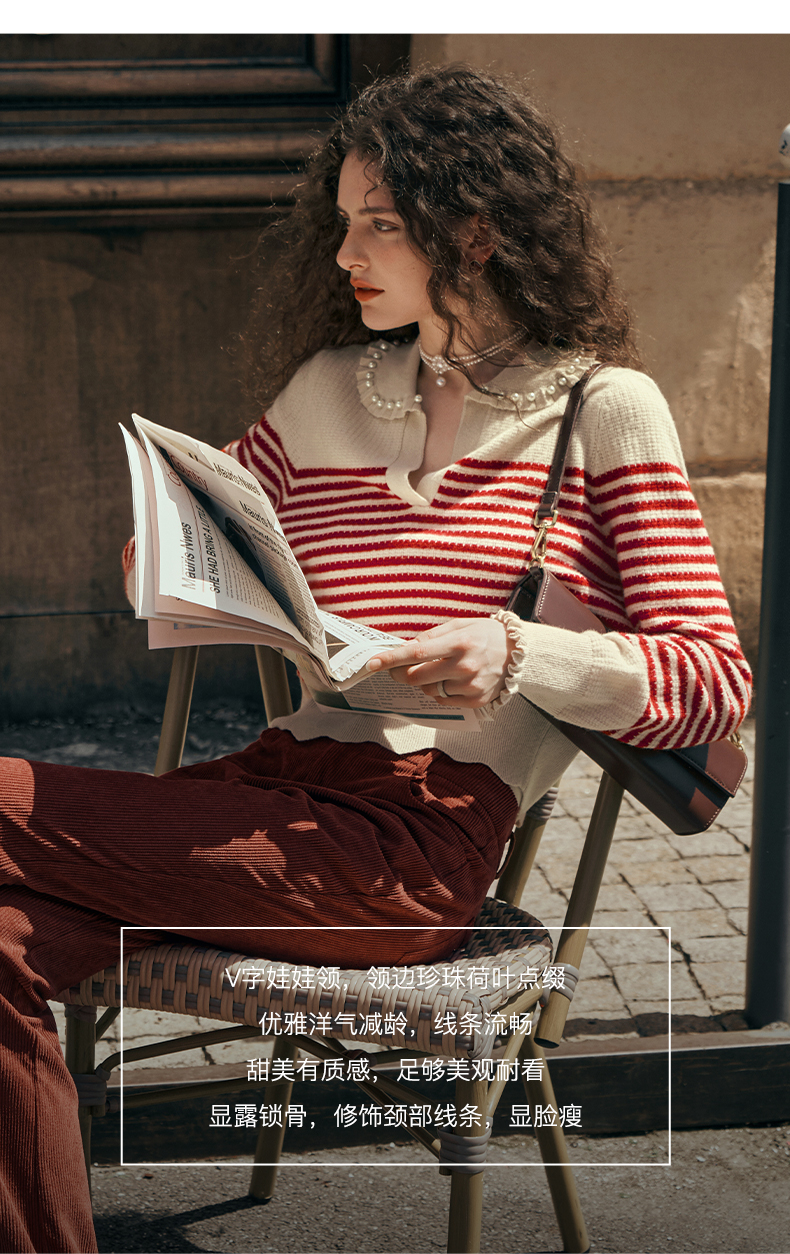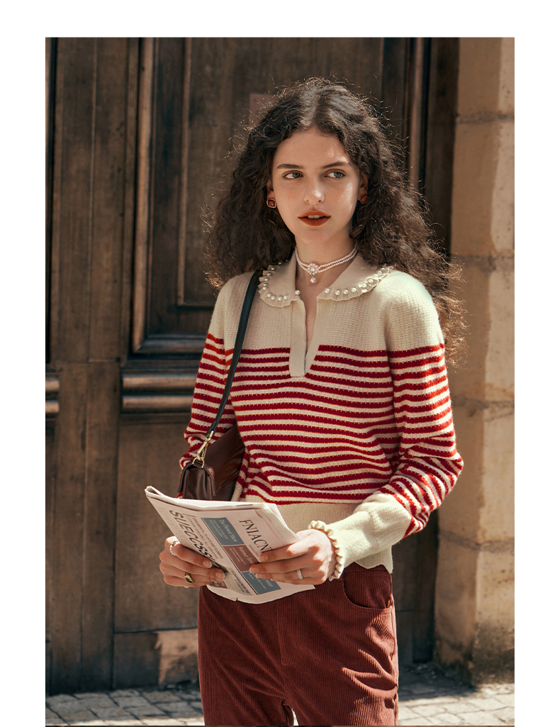 OLrain欧芮儿条纹毛衣女初秋2023年新款宽松套头上衣娃娃领针织衫