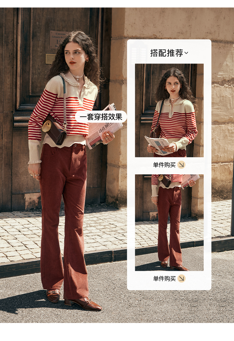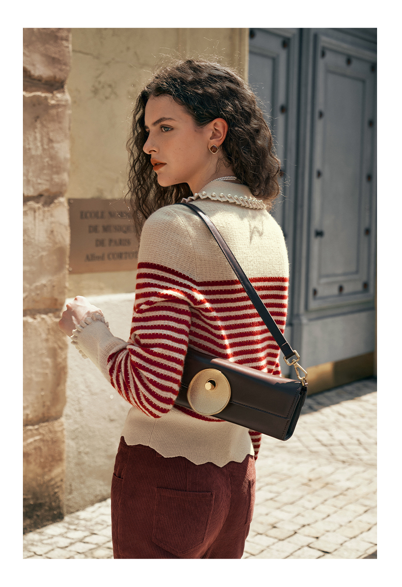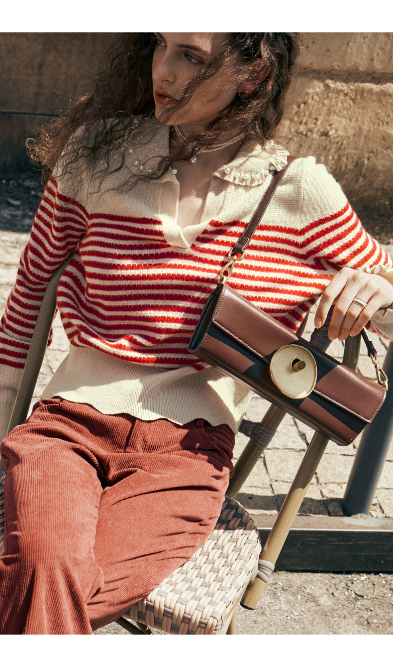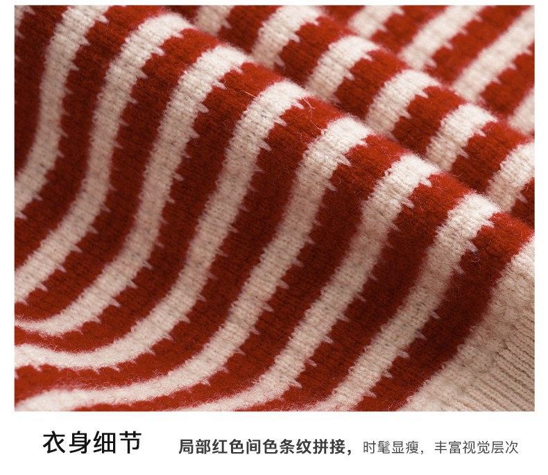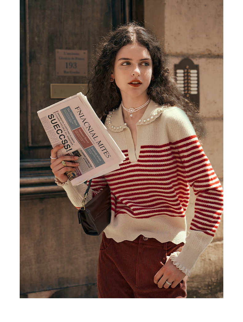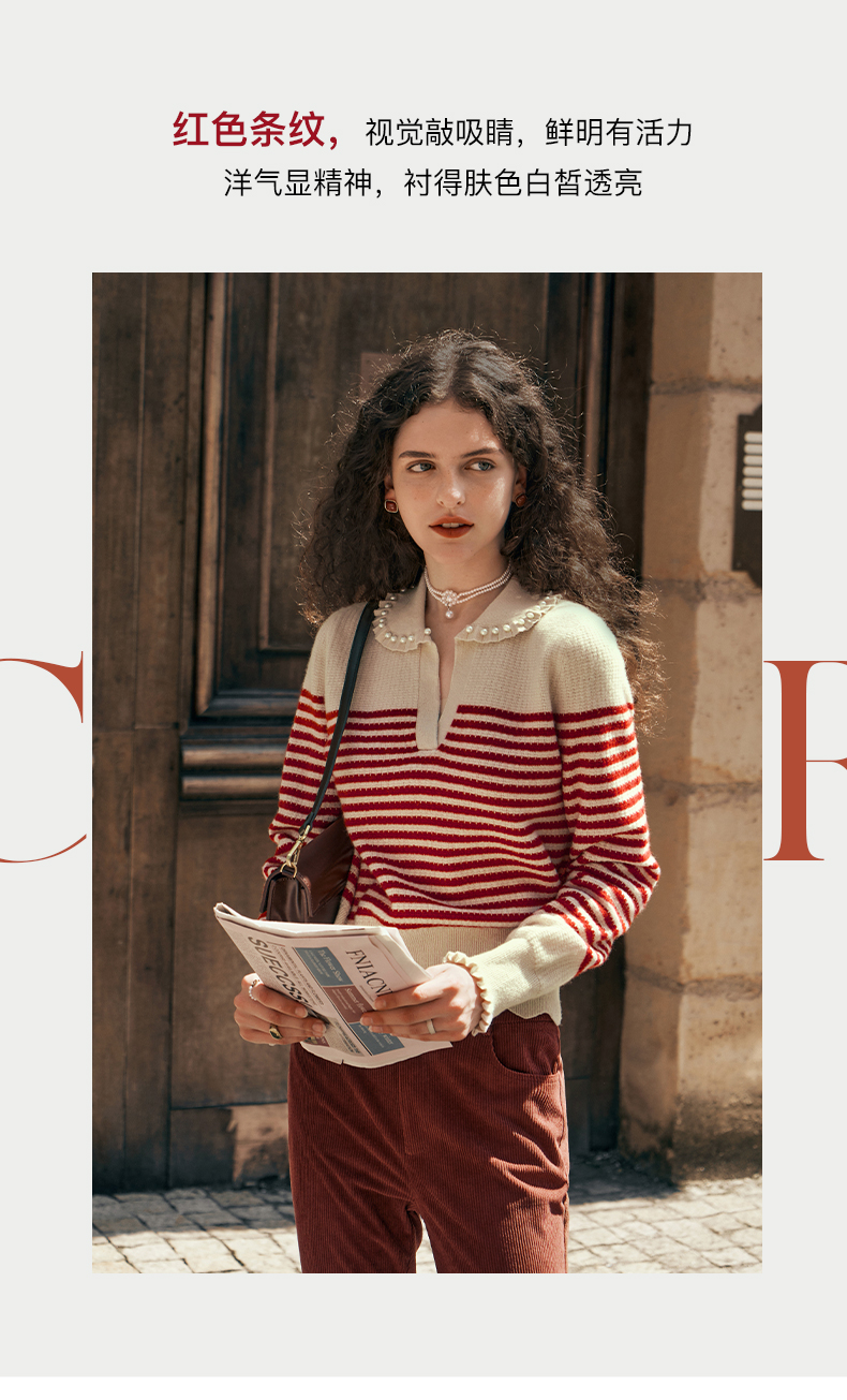 OLrain欧芮儿条纹毛衣女初秋2023年新款宽松套头上衣娃娃领针织衫