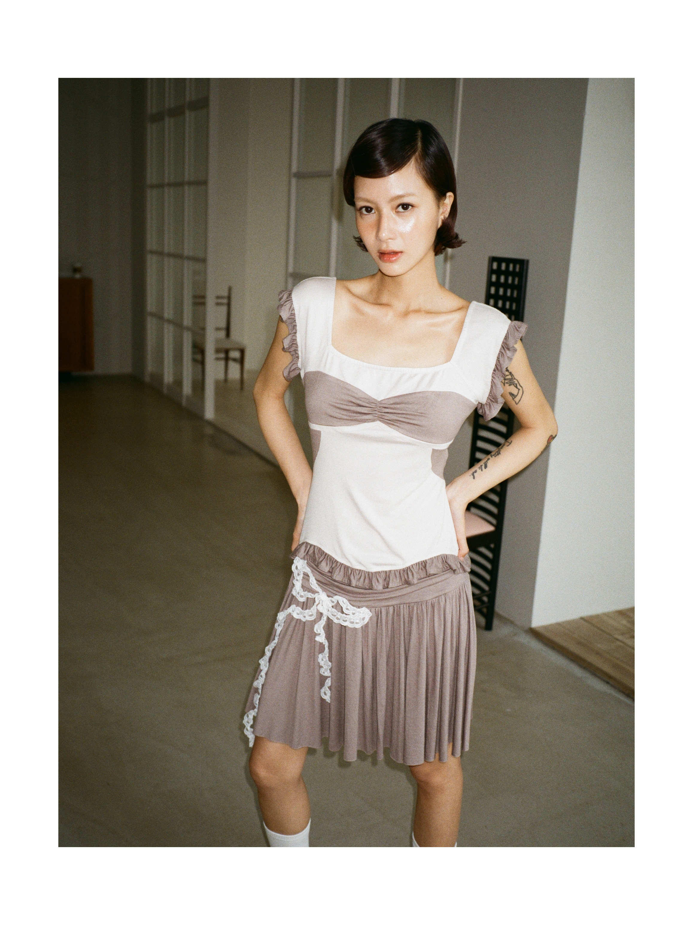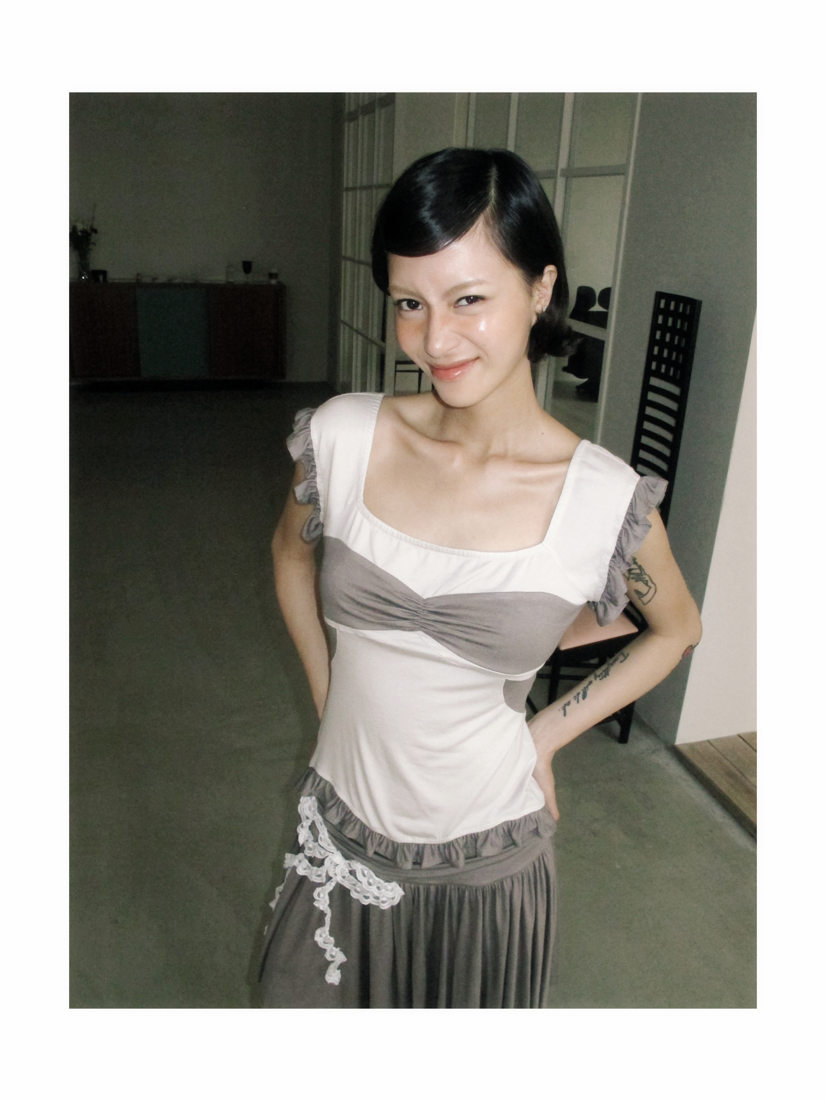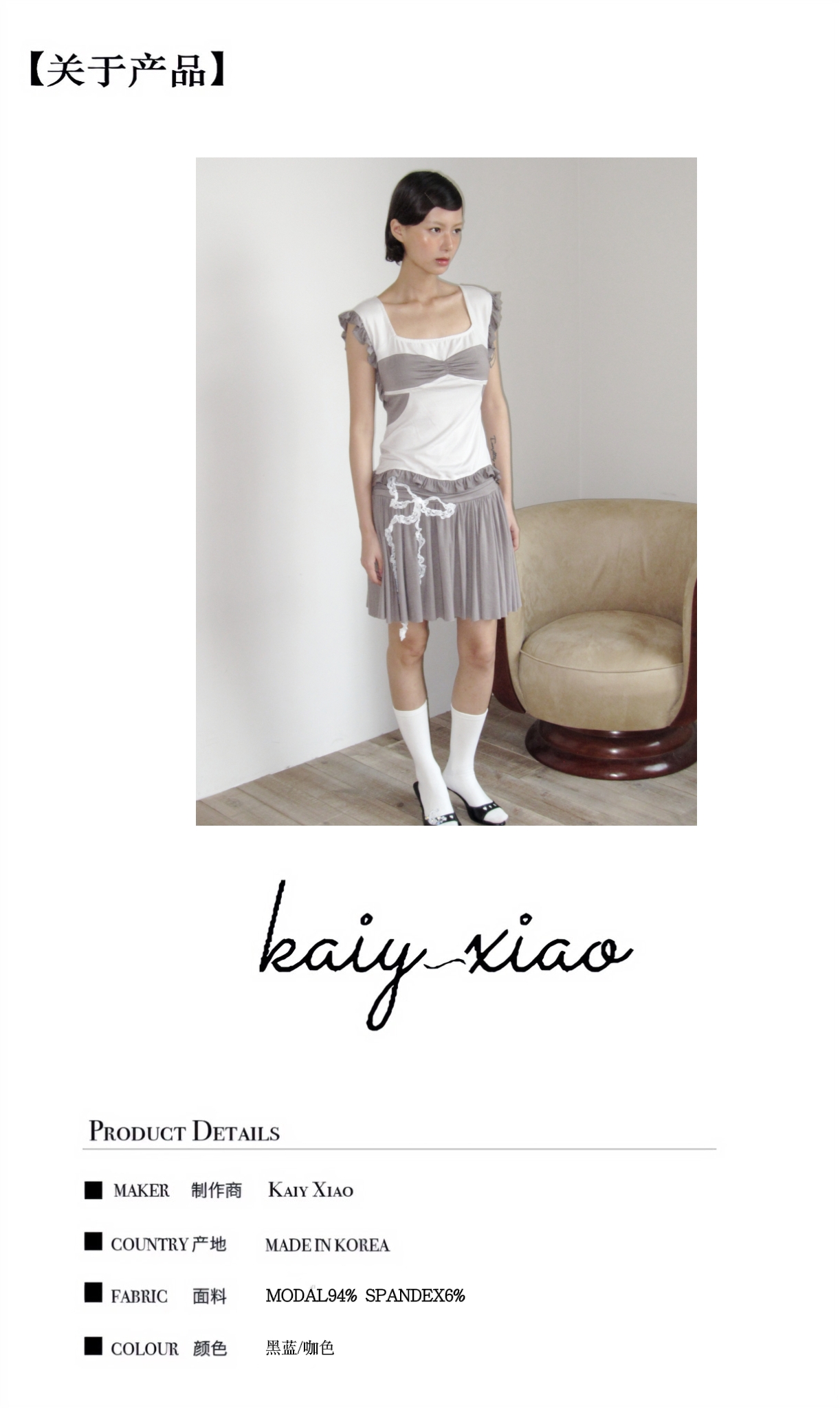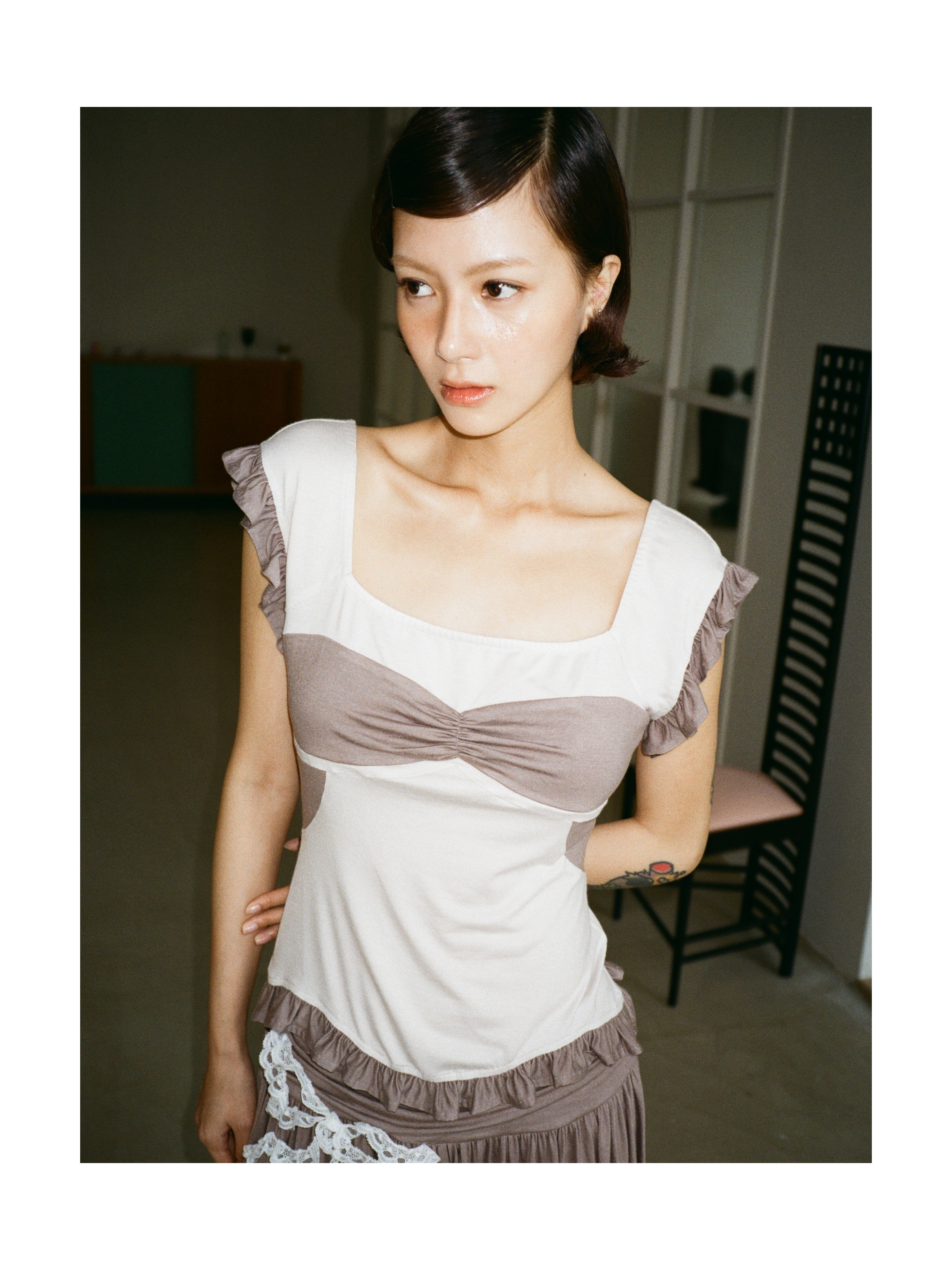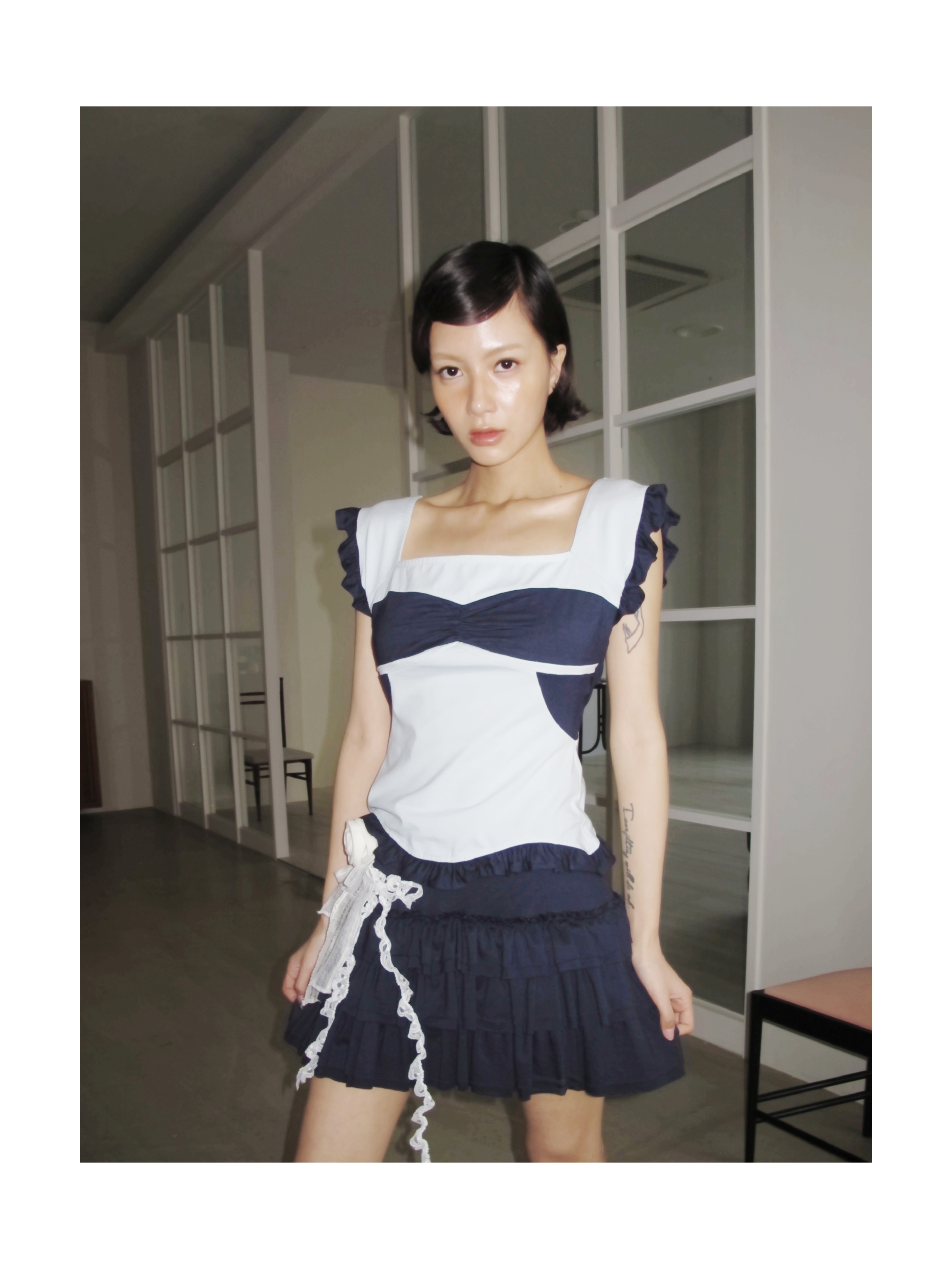 方领贝壳 荷叶边拼色小短袖 深蓝/燕麦