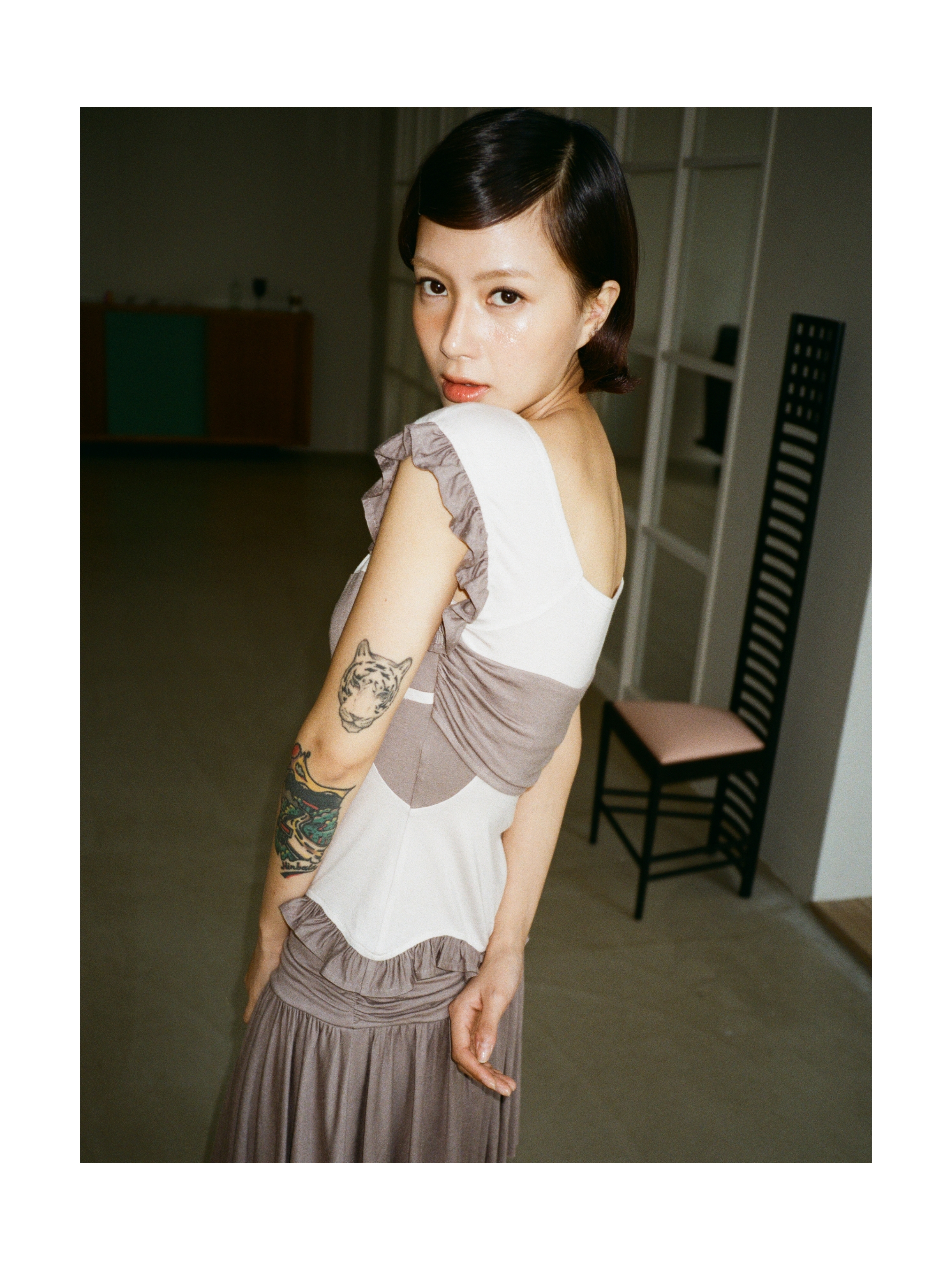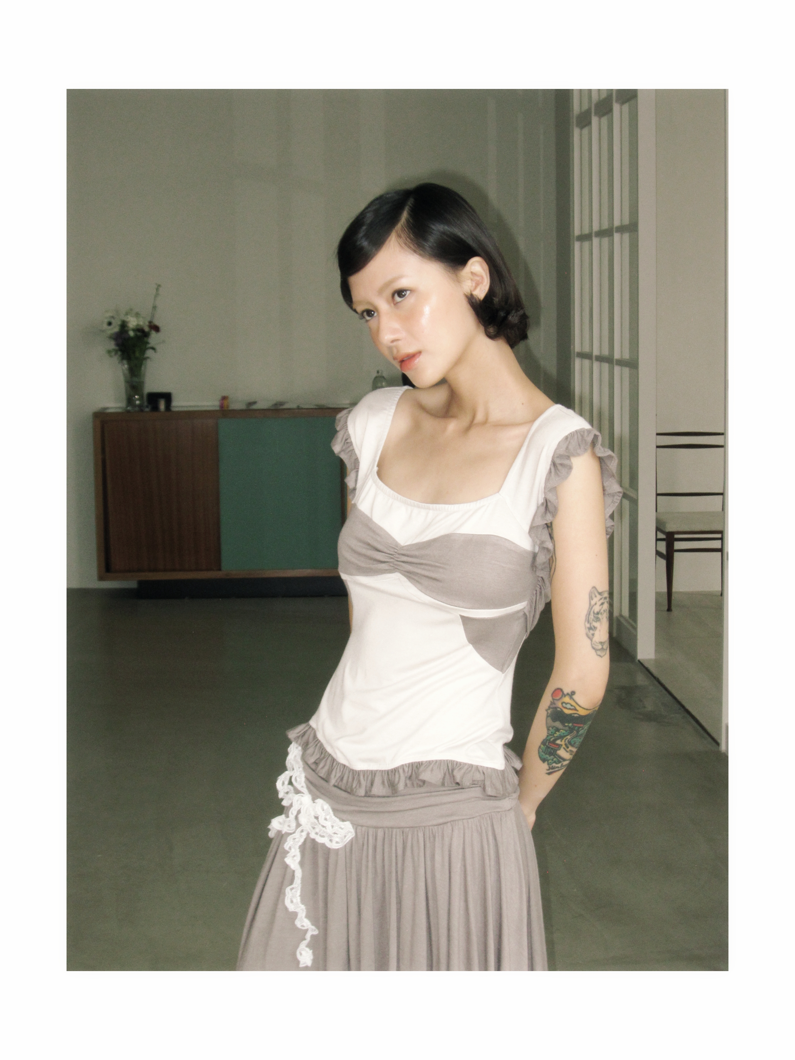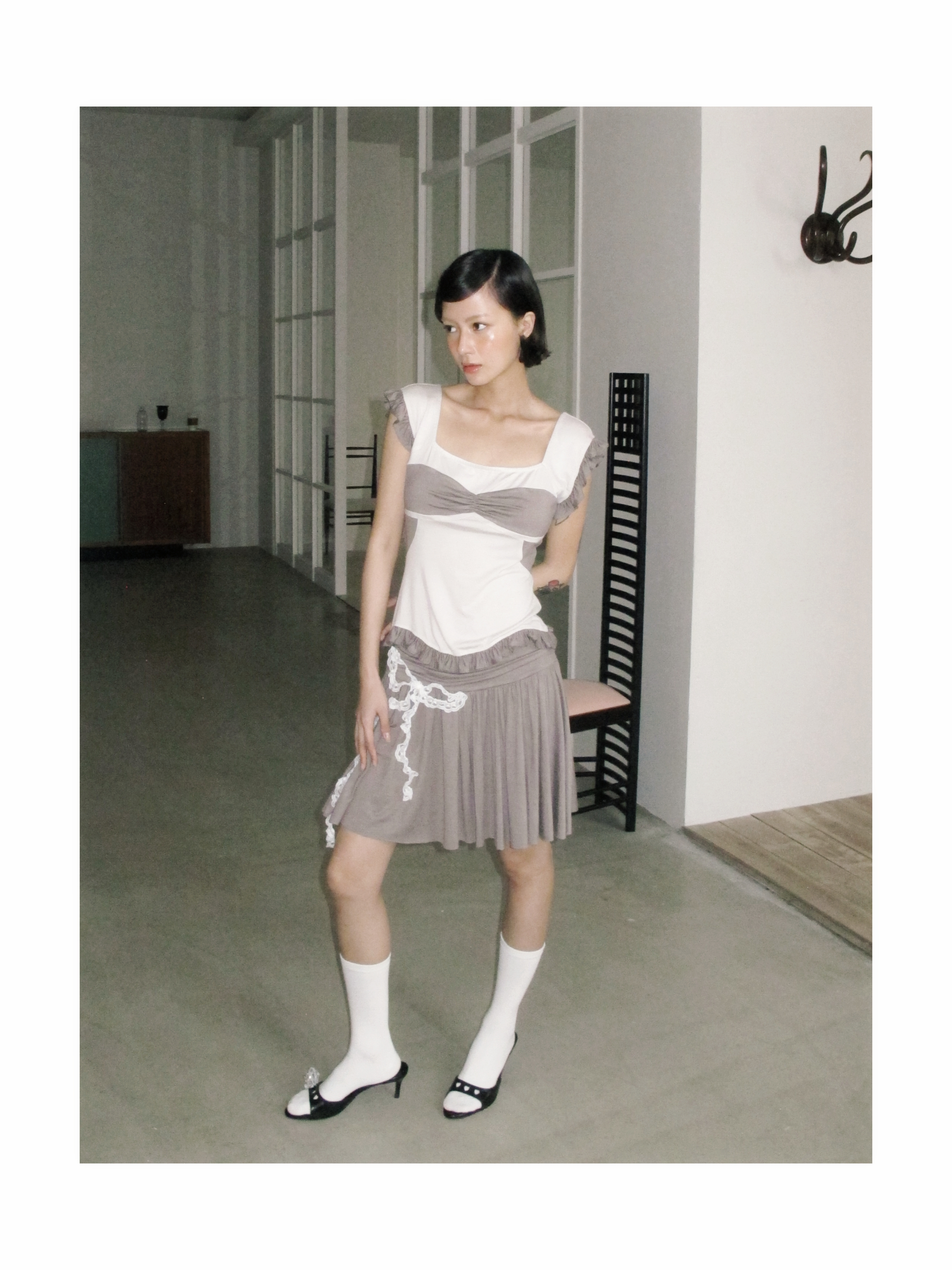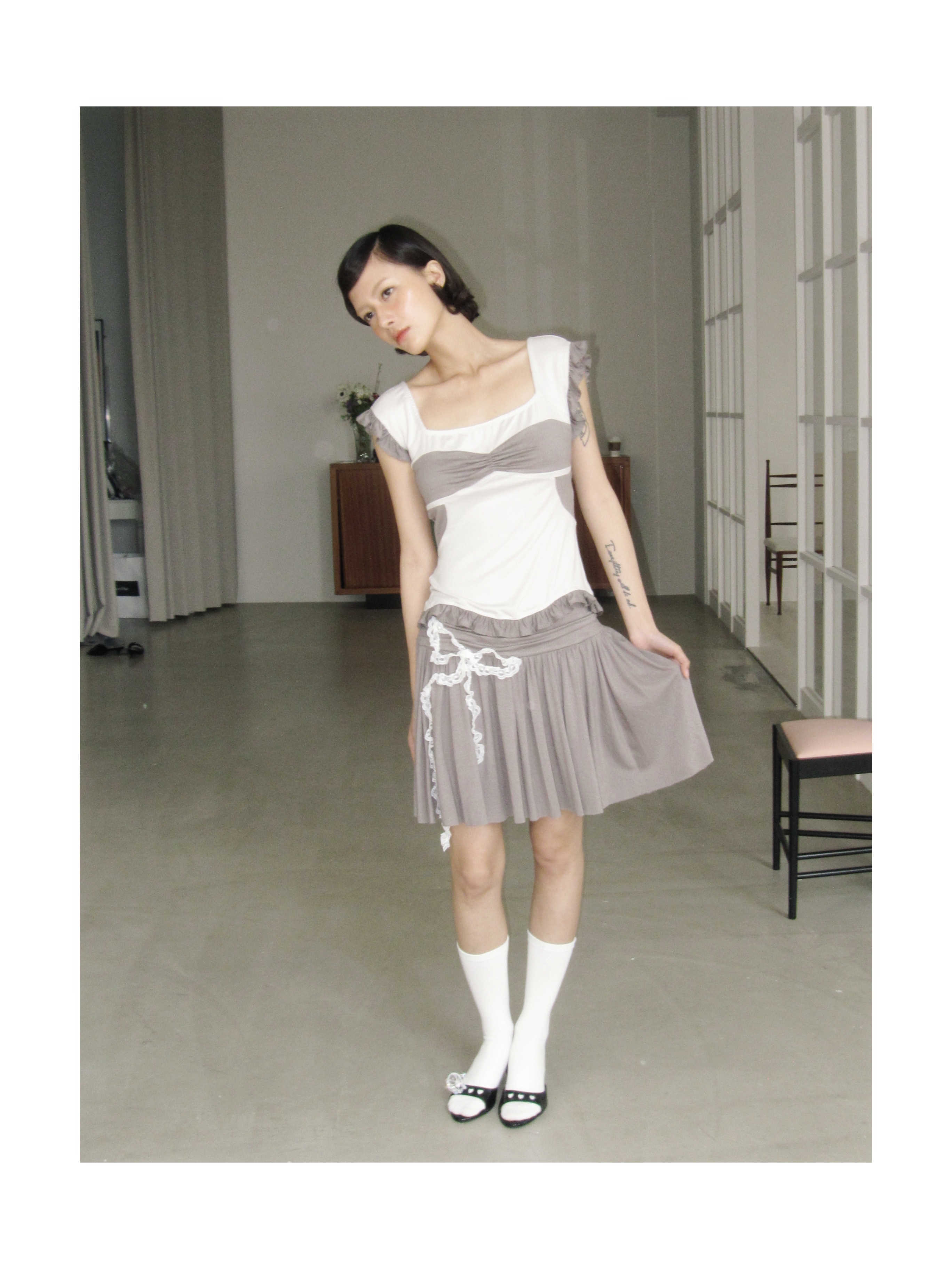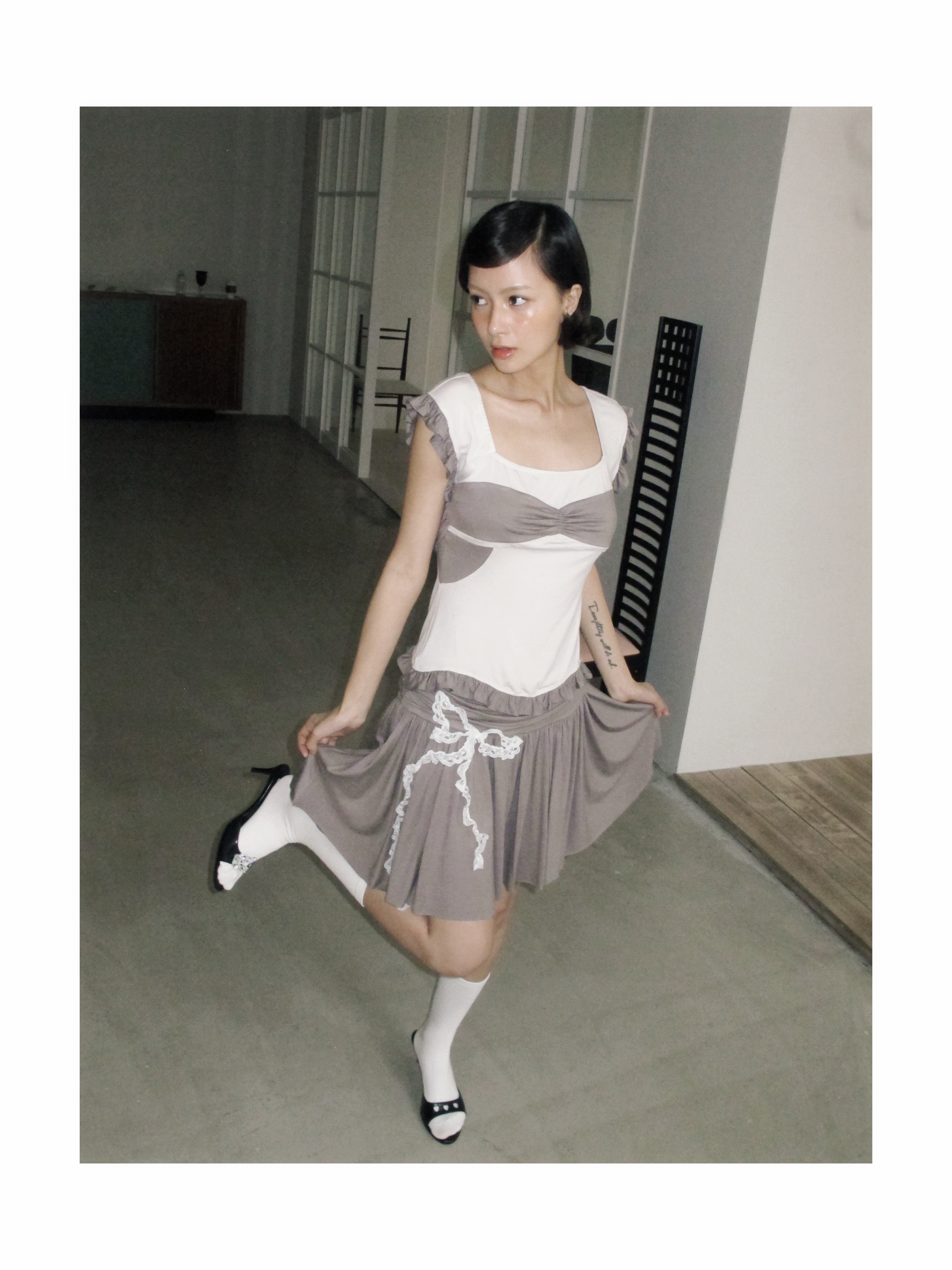 方领贝壳 荷叶边拼色小短袖 深蓝/燕麦