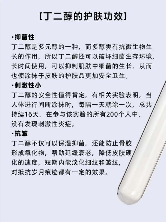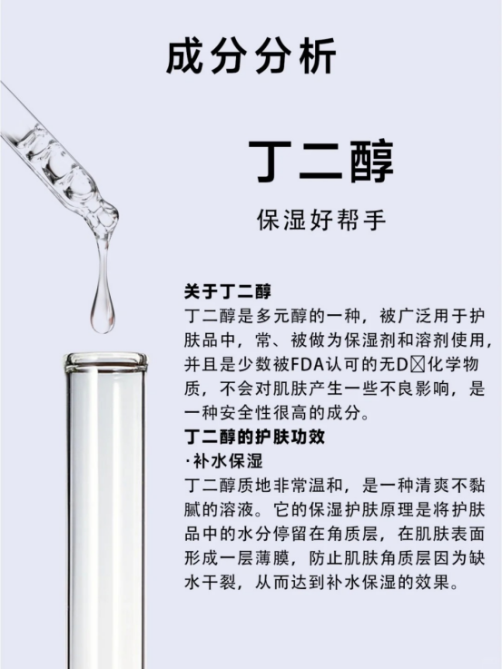 🔶成分中含有丁二醇 它对皮肤能起到保湿滋润的功效 上脸使用感觉清爽,没有黏腻感 丁二醇除了具有保湿滋润、淡化细纹的功效 还具有抗微生物繁殖,起到抑制细菌的功效✨