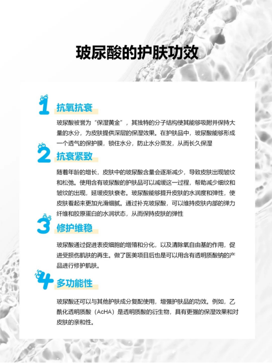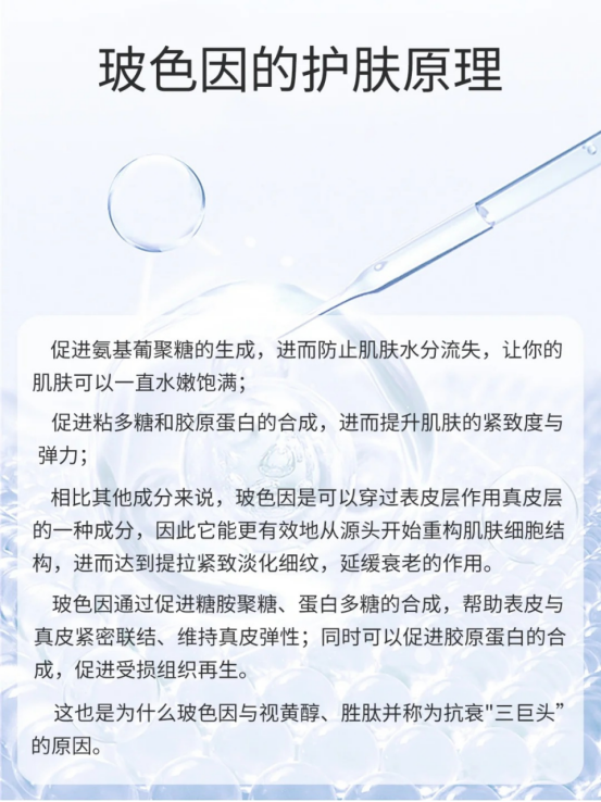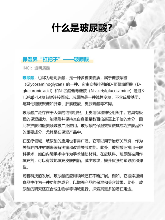 🔶玻尿酸也被称为透明质酸钠 因其强大的功效被广泛应用于各类护肤品中 1.保湿:其具有强大的保湿能力,减少水分蒸发、防止水分流失 2.抗皱:透明质酸钠的保湿作用不仅能够提供水分,还能填充皱纹,增加皮肤弹性 3.抗氧化:透明质酸钠还具有一定的抗氧化能力,可以有效清除自由基延缓衰老过程