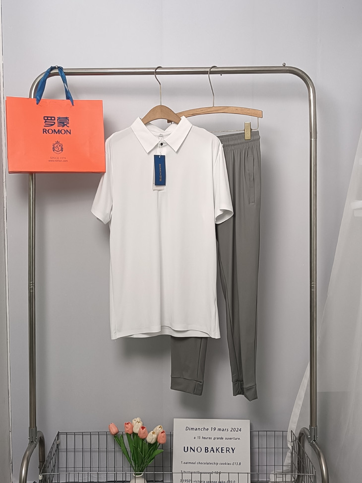 罗蒙男士冰感无痕轻奢POLO+休闲裤套装(1199888) 【品牌】:罗蒙 【款号】:1199888(加上款号) 【颜色】: 上衣:白色,海棠红,雾霾蓝,中灰,灰蓝,黑色,孔雀蓝,深灰 裤子:黑色-束脚,灰色-束脚,黑色-直筒,灰色-直筒 【尺码】:M-5XL 【成分】:上衣:85%锦纶+15%氨纶; 裤子:82.6%锦纶+17.4%氨纶 【发货地】:福建 【发货时效】:72小时 【快递】:圆通、中通随机 【偏远运费】:甘肃,青海,宁夏,内蒙+8元/组;新疆,西藏+18元/组 【售后说明】:不影响二次销售,支持7天无理由退换货。洗过不售后,质量问题请提供产品和快递面单合照48小时内联系