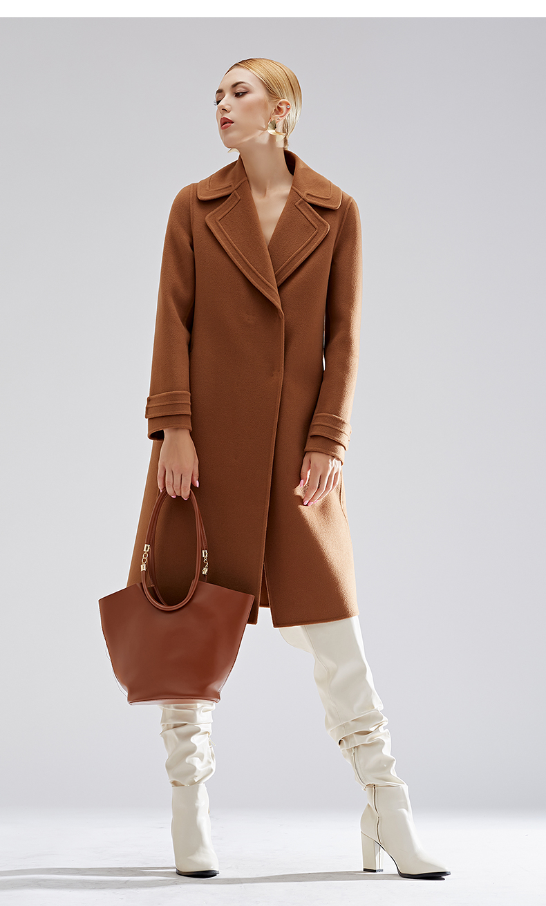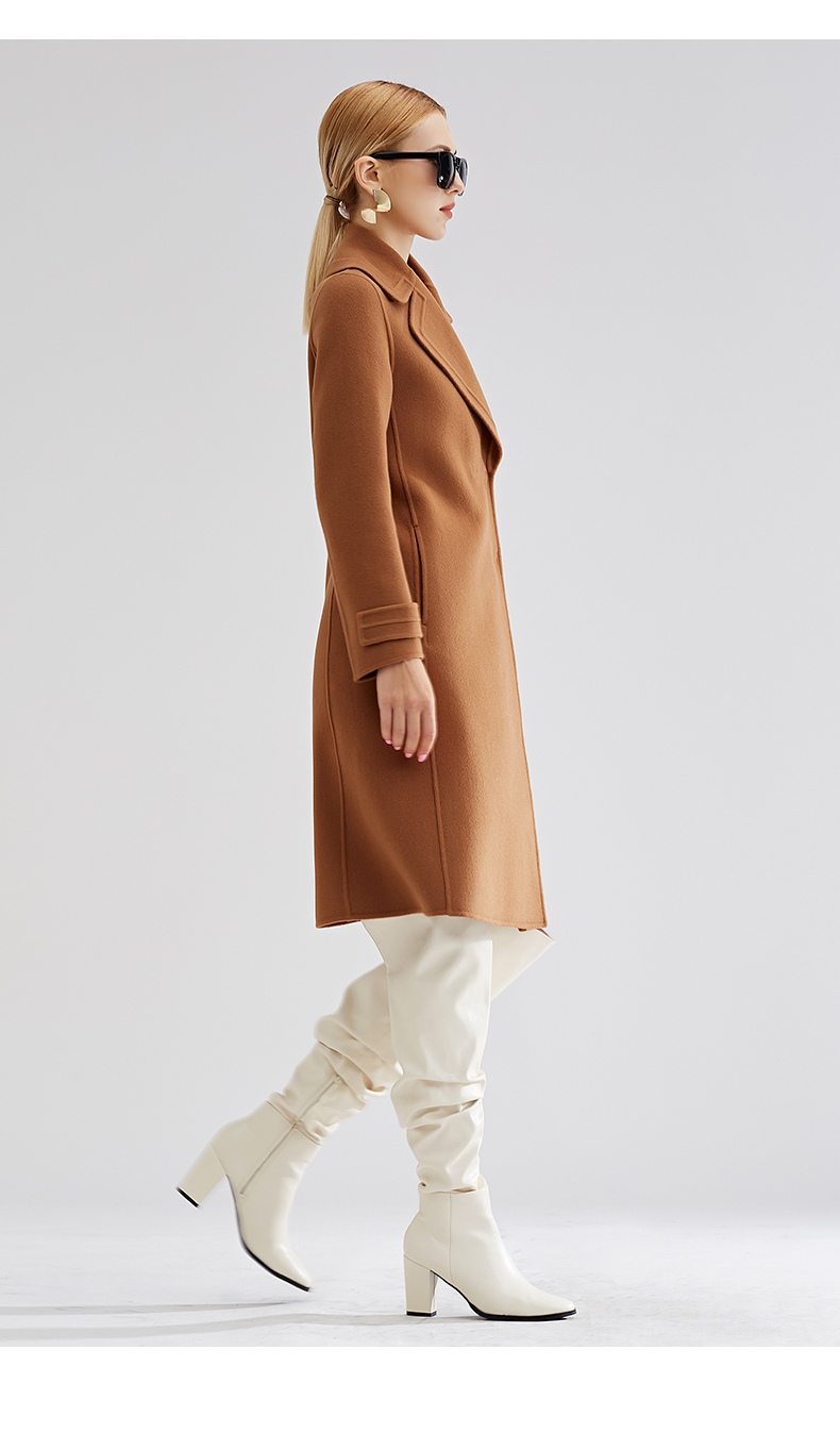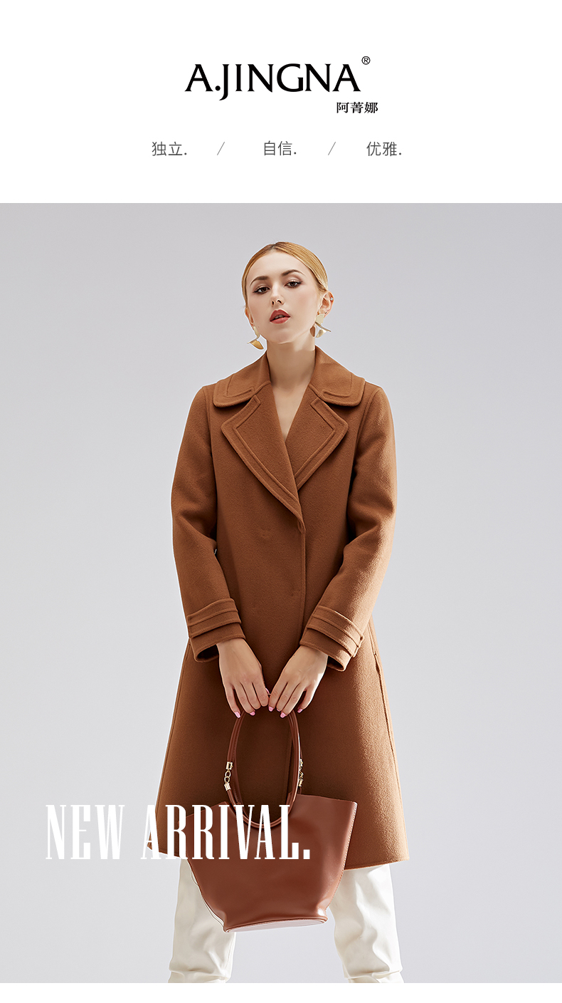 【特价款不退不换】阿菁娜秋冬新款简约浮雕感平驳大翻领羊毛羊绒混纺双面大衣金驼色A27D211012