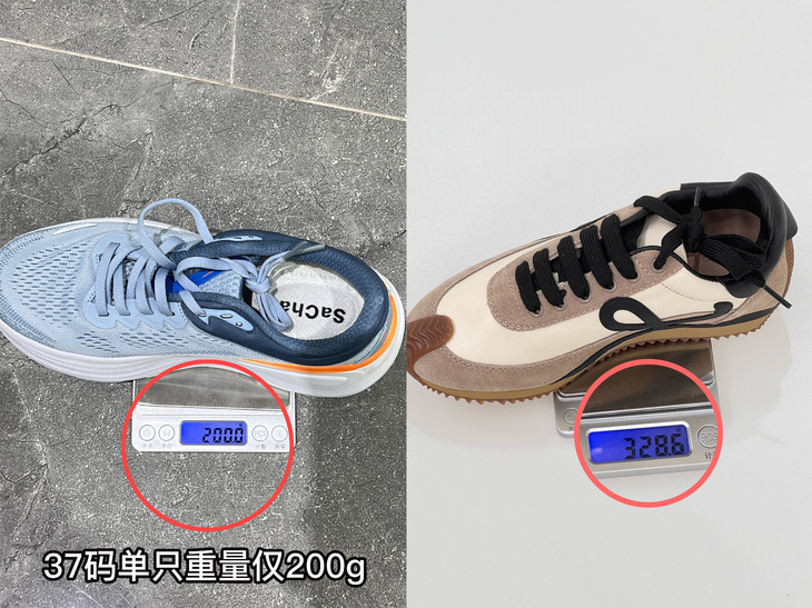 实不相瞒,平时运动 我大概跑十几分钟就不行了 脚底会很累 但穿SACHA跑半个多小时都没啥疲惫感 因为它超轻,跑起来不会累脚 普通跑鞋起码差不多300-400g 但SACHA只有200g 几乎少了一半的重量