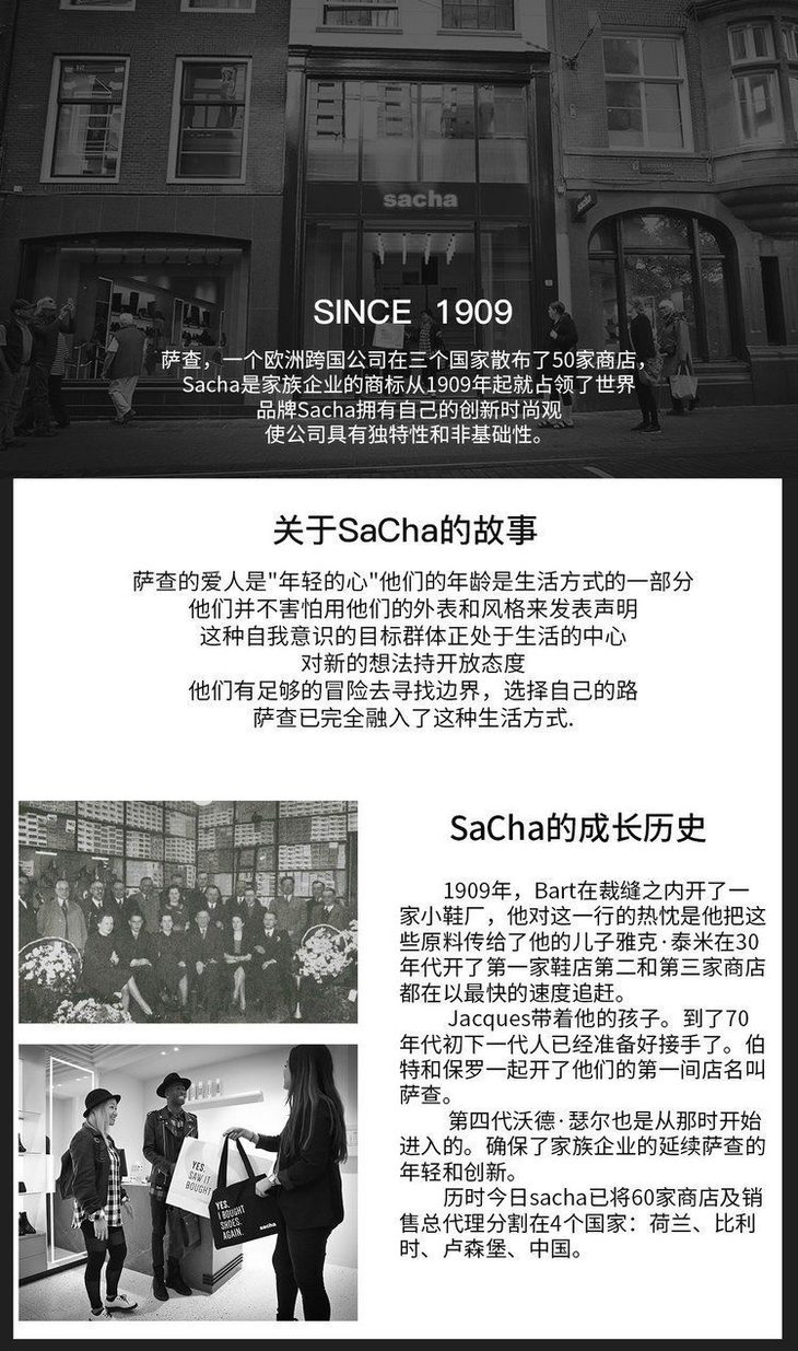 SACHA源自1909年的欧洲品牌 创始人Bart在裁缝之内开了一家小鞋厂 后来他把这些原料传给了他的儿子雅克·泰米 30年代接连开3家鞋店 以最快的速度发展 70年代初,下一代人已经准备好接手了 伯特和保罗一起开了他们的第一间店,名叫萨查 第四代沃德·瑟尔也是从那时开始进入的 确保了家族企业的延续萨查的年轻和创新 历时今日sacha已将60家商店及销售总代理 分割在4个国家:荷兰、比利时、卢森堡、中国