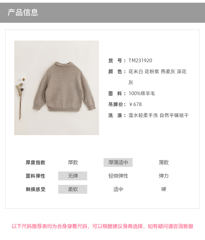 【马克珍妮 芦芙】秋装新款 女童半高领纯绵羊毛打底针织衫231920