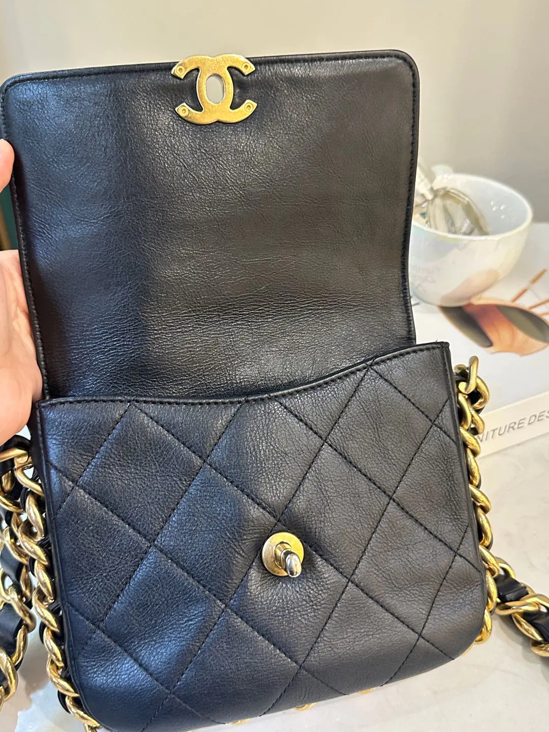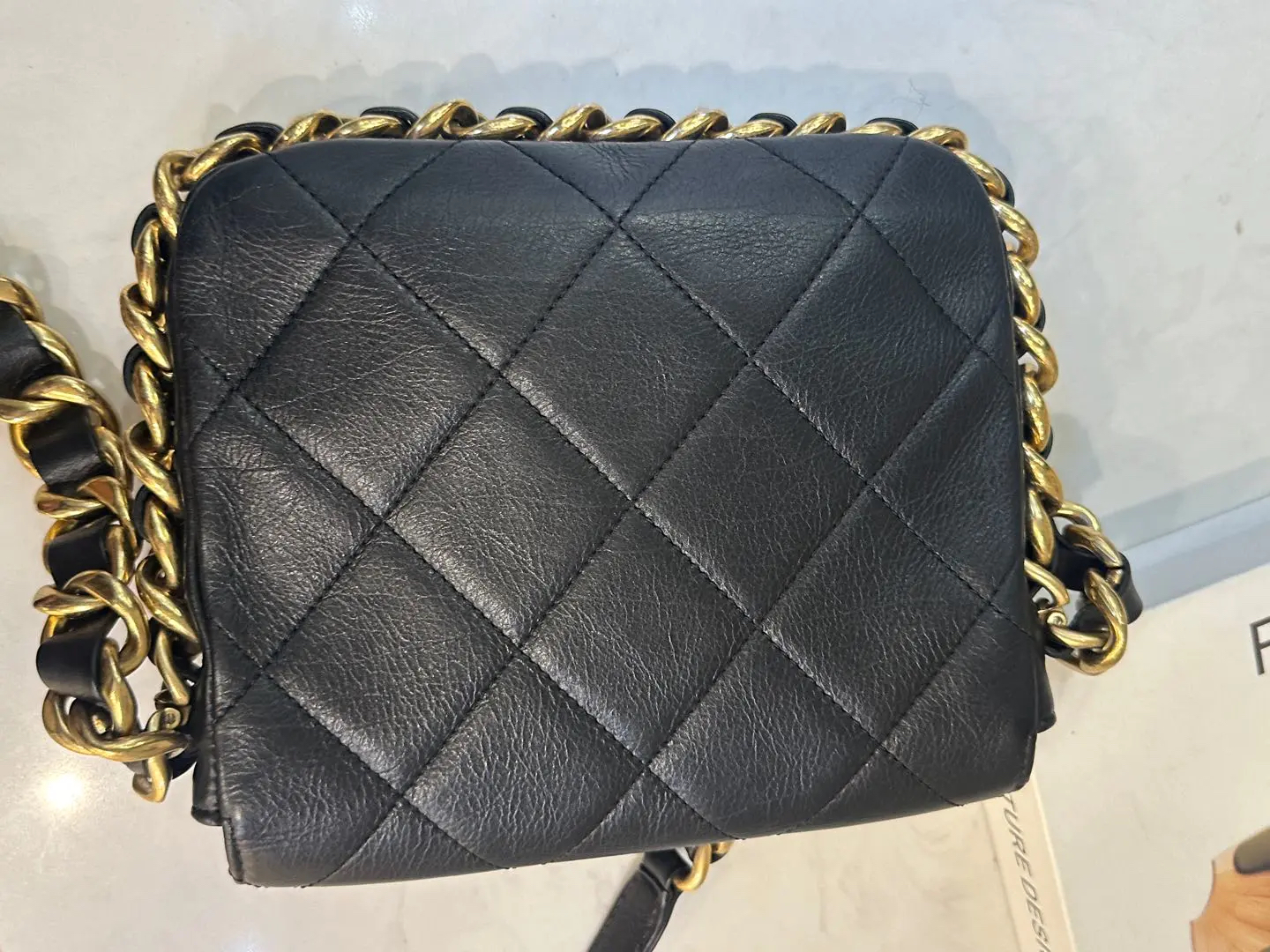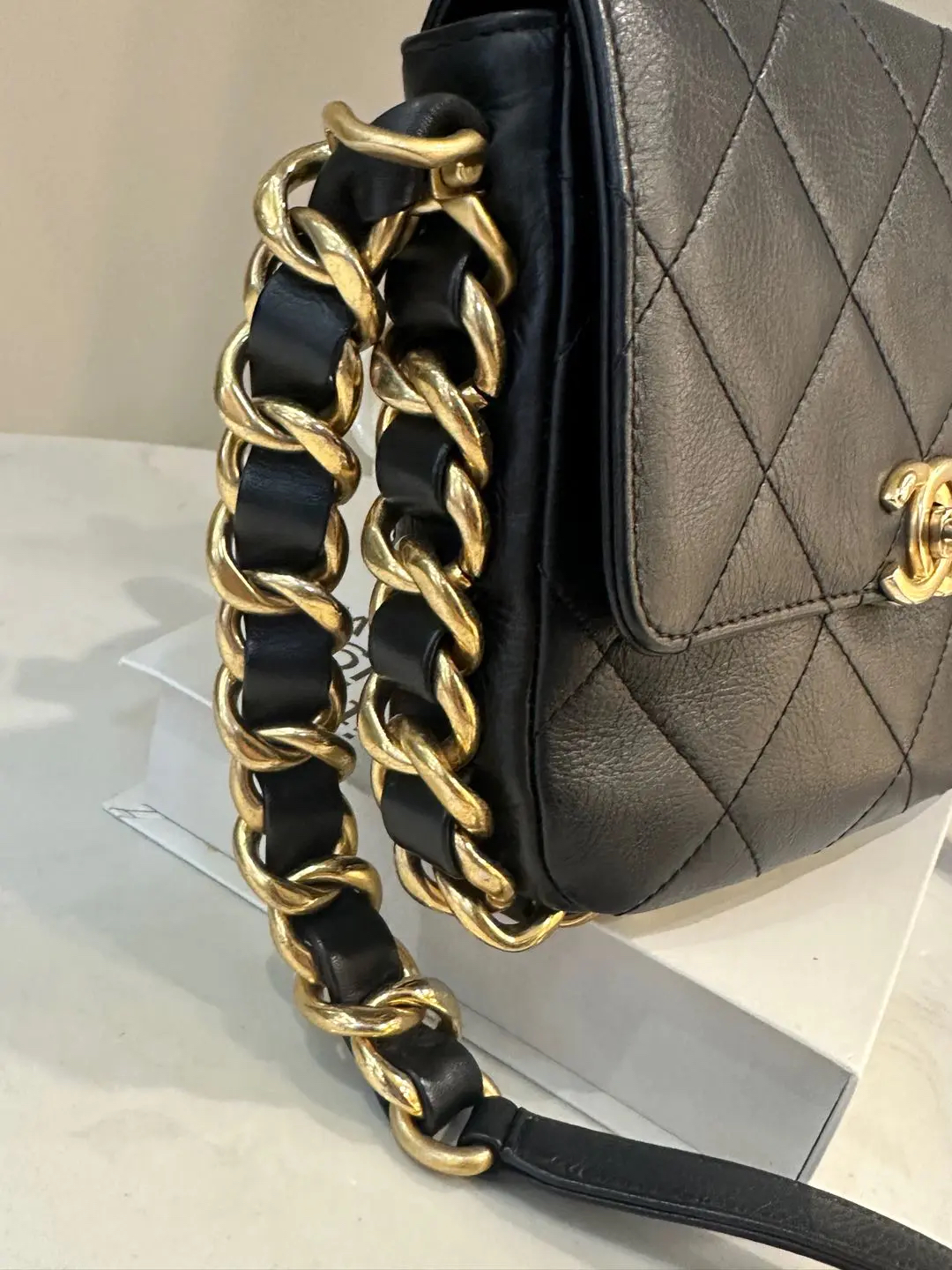 【商品详情】正品二手 Chanel 21k 秋冬新款 黑金 粗链条 牛皮 方胖子🤪97新 18×16 新钢标 配件:防尘袋。超級酷颯