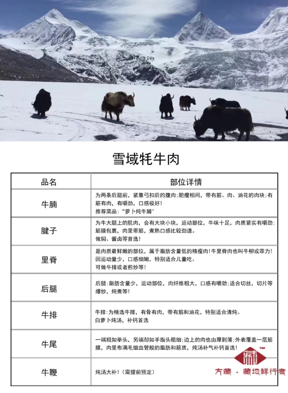 在氧气稀薄的世界屋脊, 是雪域高原那圣洁纯净的地理环境造就了特殊的生物——牦牛。它饮用青藏高原融化的雪水,清甜甘洌,无污染;有着强壮的身体,超强的免疫力和与众不同的抗缺氧、抗紫外线能力,成为营养价值极高的天然、绿色物种。血沫干净无异味,汤鲜味美,一撮盐就能调出肉鲜味。雪域牦牛肉以其自由,奔放,野性,浓郁而被广大食客所喜爱。